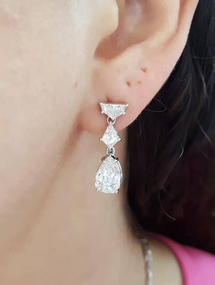 You are Purchasing a pair of 5.66 ct Total Weight Pear, Shield & Kite Cut Diamond Dangle/Drop Earrings in 18K White Gold.