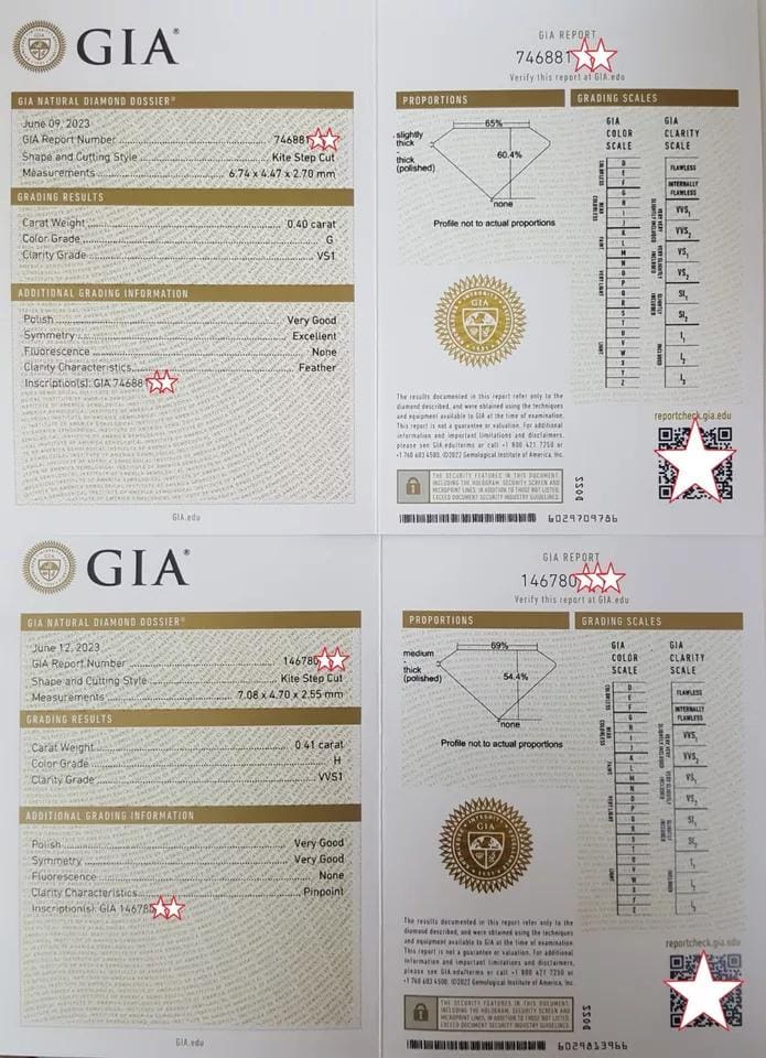 Stone 6: Natural Kite Step Cut diamond weighing 0.40 ct, G in color, VS1 in clarity, Very Good Polish, Excellent Symmetry, None Fluorescence, Measuring 6.74x4.47x2.70 mm, graded & inscribed by GIA "GIA 746881****".