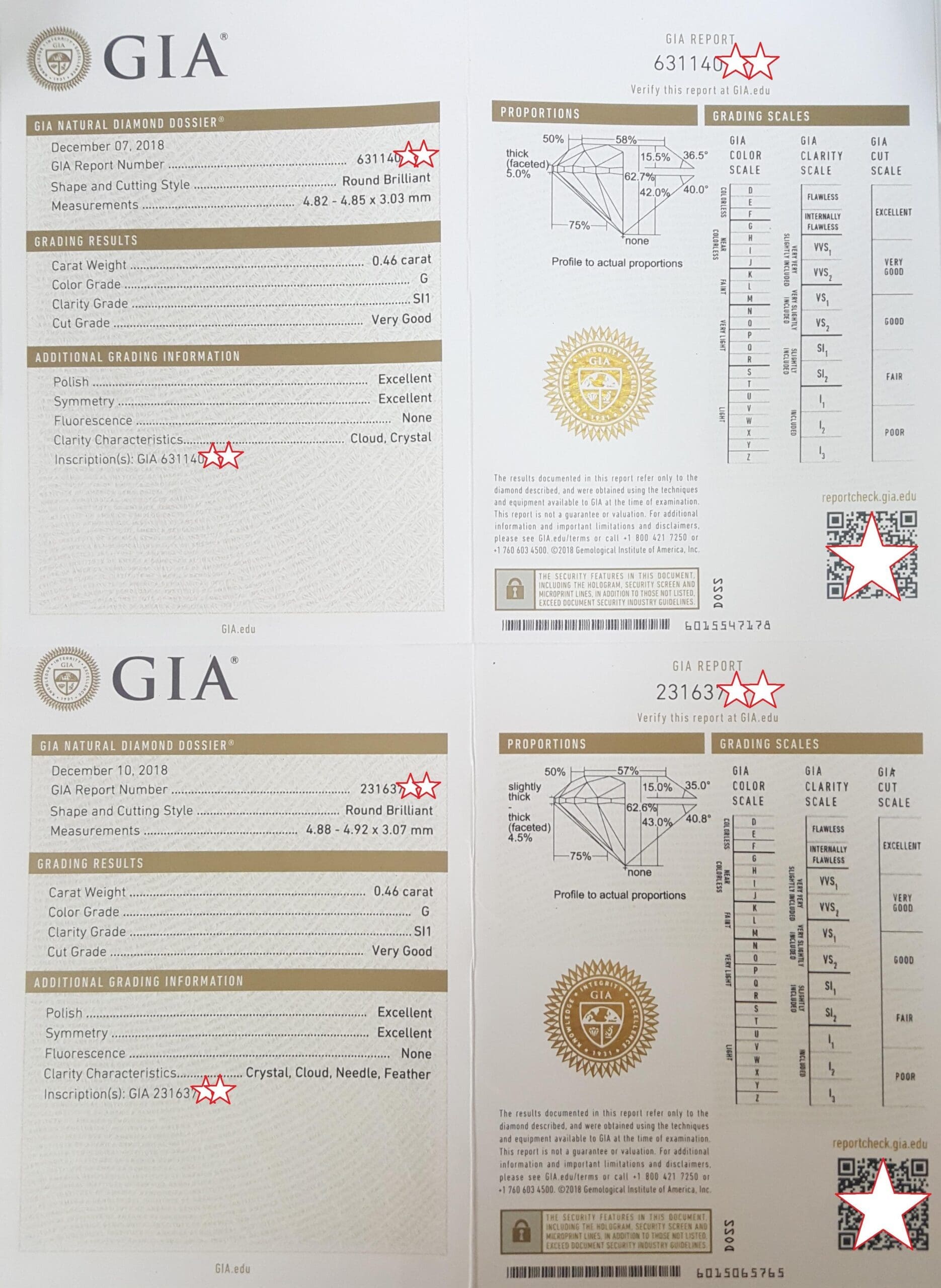 Stone 1 is a Natural Round Brilliant Cut Diamond weighing 0.46 ct, G in color, SI1 in clarity, Very Good Cut, Excellent Polish, Excellent Symmetry, None Fluorescence, Measuring 4.88 x 4.92 x 3.07 mm, graded by & inscribed by GIA "GIA 231637****".