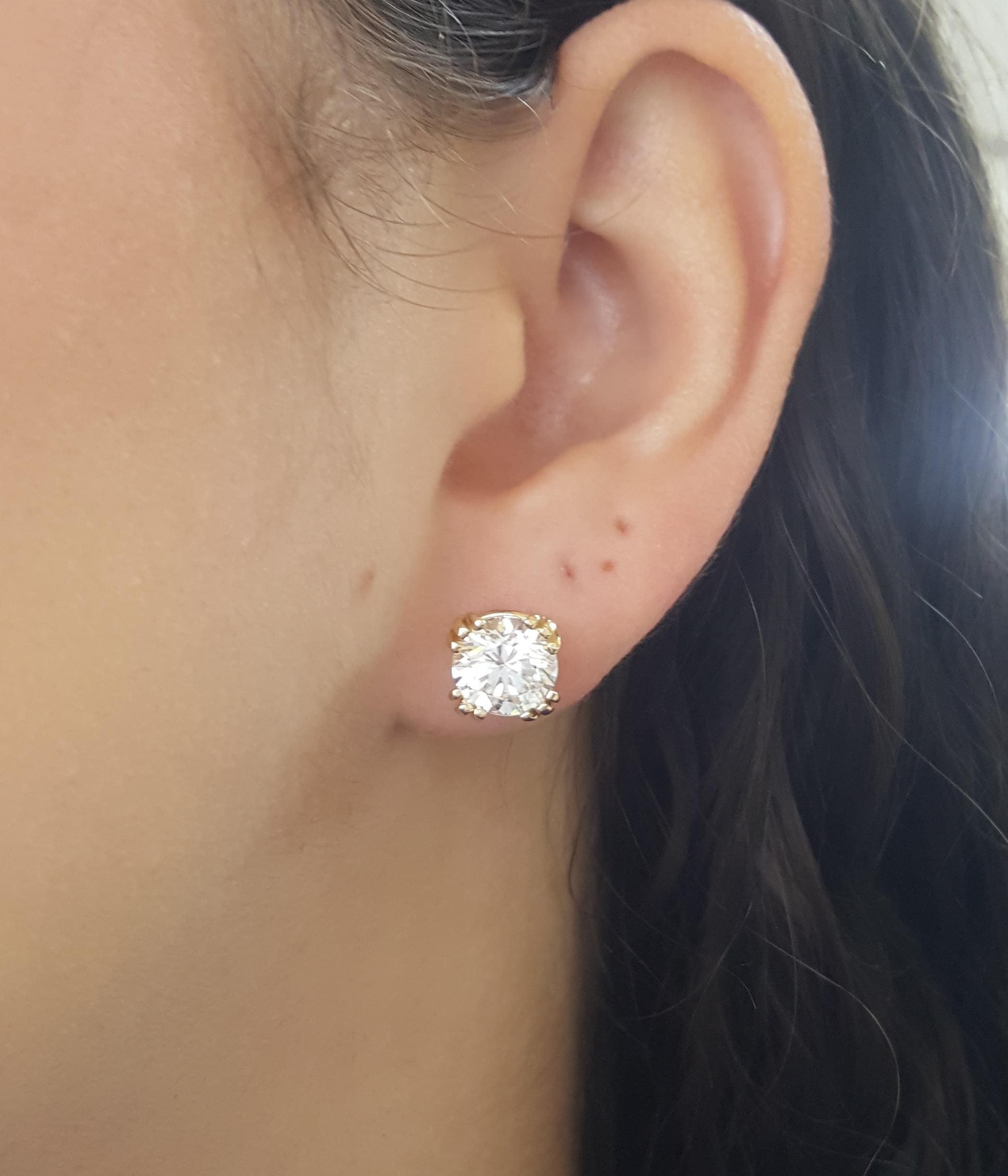 The earrings weigh 3.7 grams, there are 2 Natural Round Brilliant Cut diamonds weighing 4.01 ctw, I in color, VVS2 in clarity.