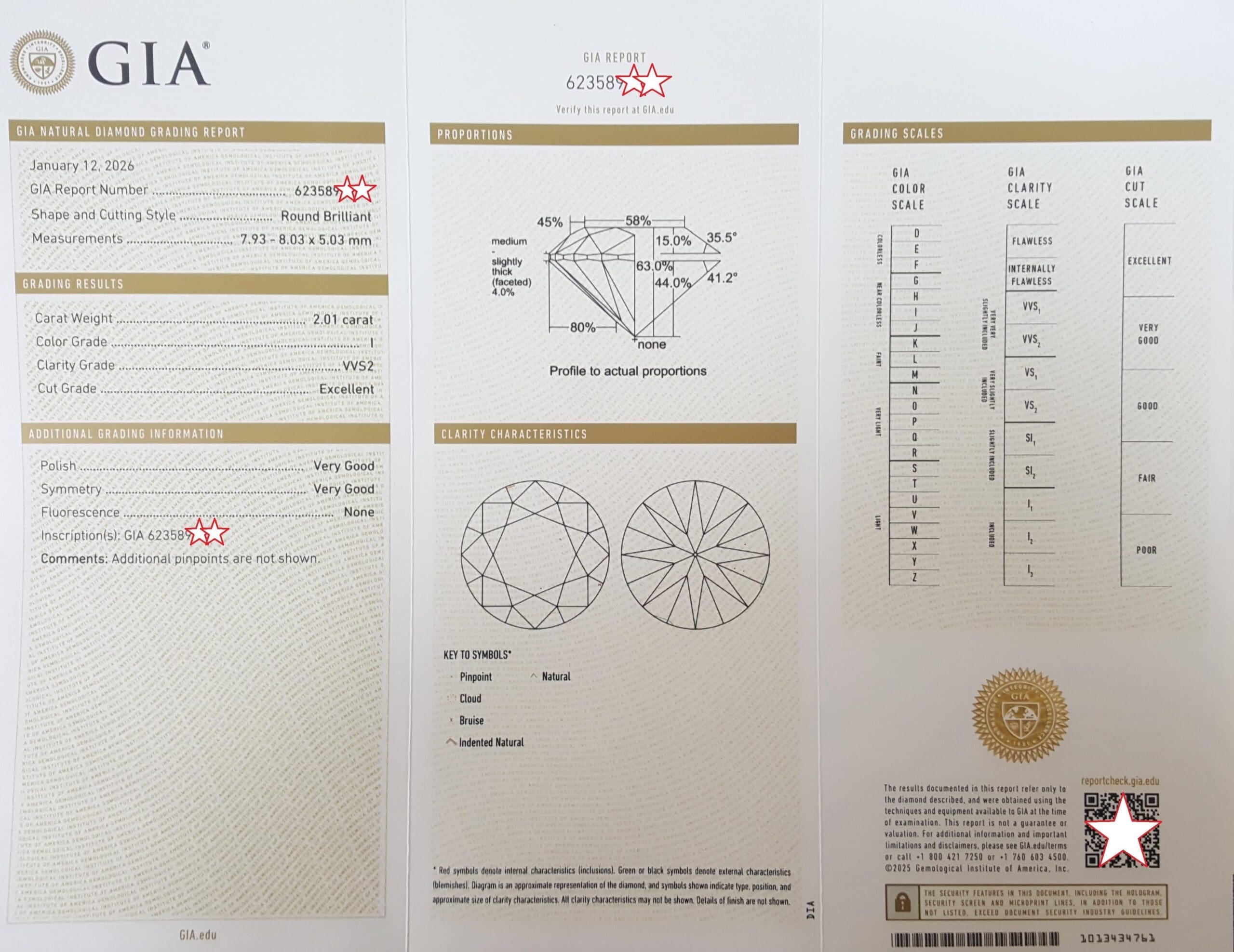 Stone # 2: Natural Round Brilliant Cut Diamond weighing 2.01 ct, I in color, VVS2 in clarity, Excellent Cut, Very Good Polish, Very Good Symmetry, None Fluorescence, Measuring 7.93 x 8.03 x 5.03 mm, graded & inscribed by GIA "GIA 623589****".