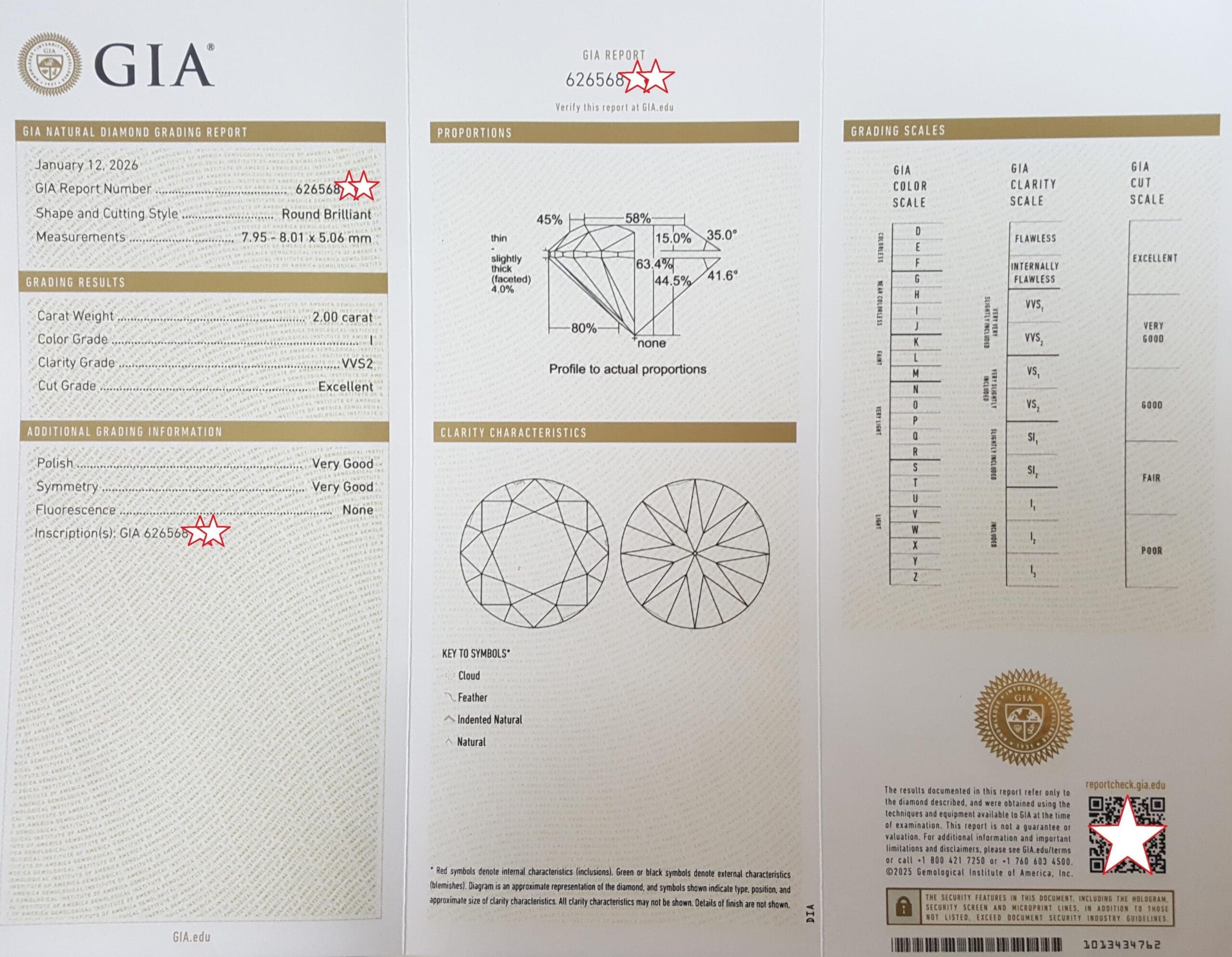 Stone #1: Natural Round Brilliant Cut Diamond weighing 2.00 ct, I in color, VVS2 in clarity, Excellent Cut, Very Good Polish, Very Good Symmetry, None Fluorescence, Measuring 7.95 x 8.01 x 5.06 mm, graded & inscribed by GIA "GIA 626568****".