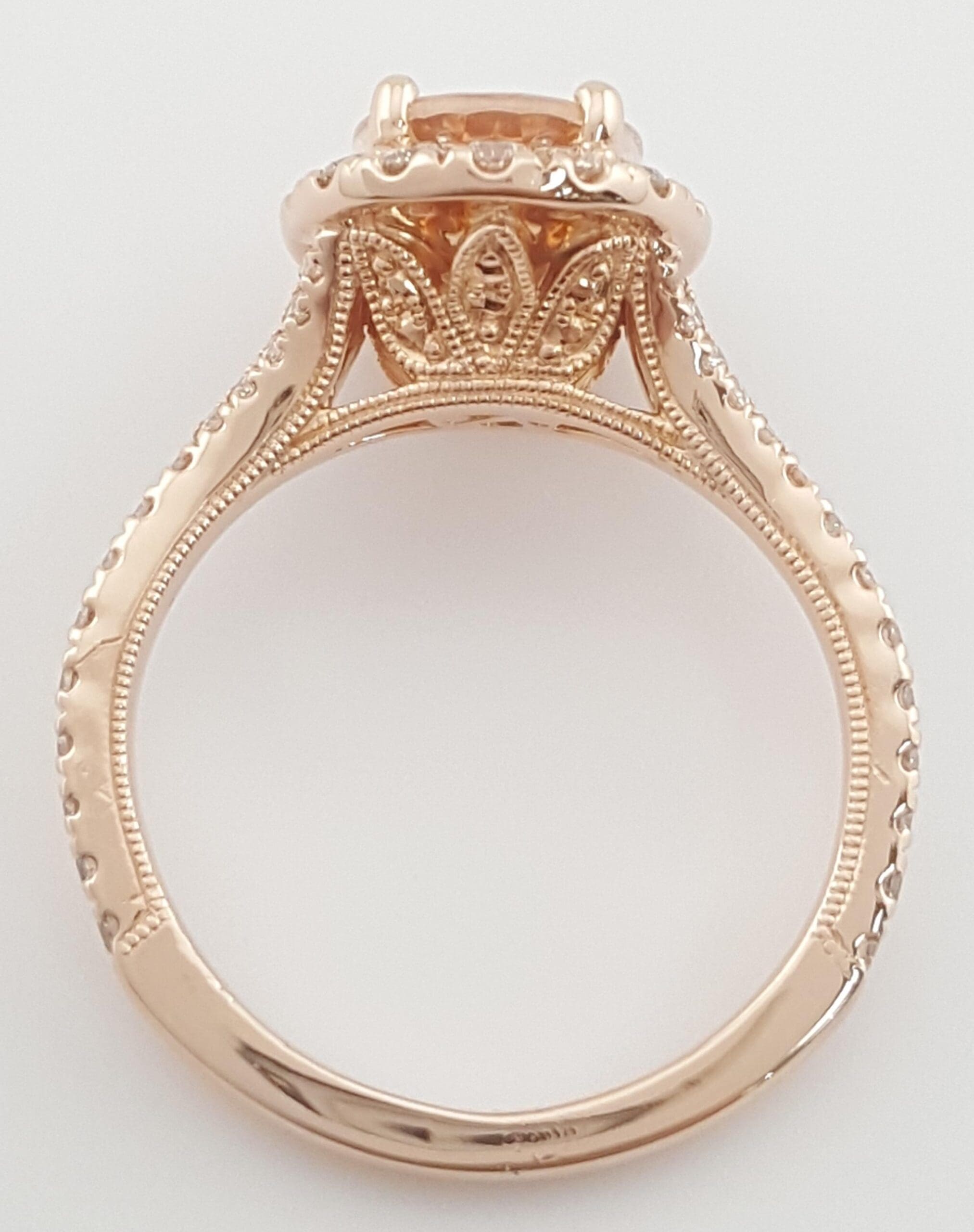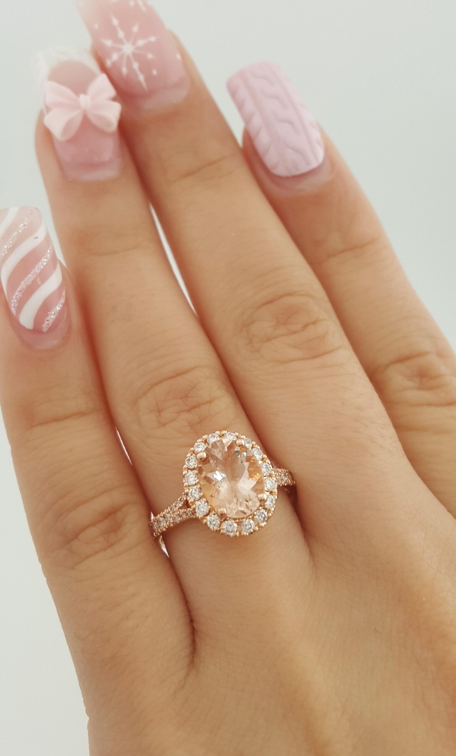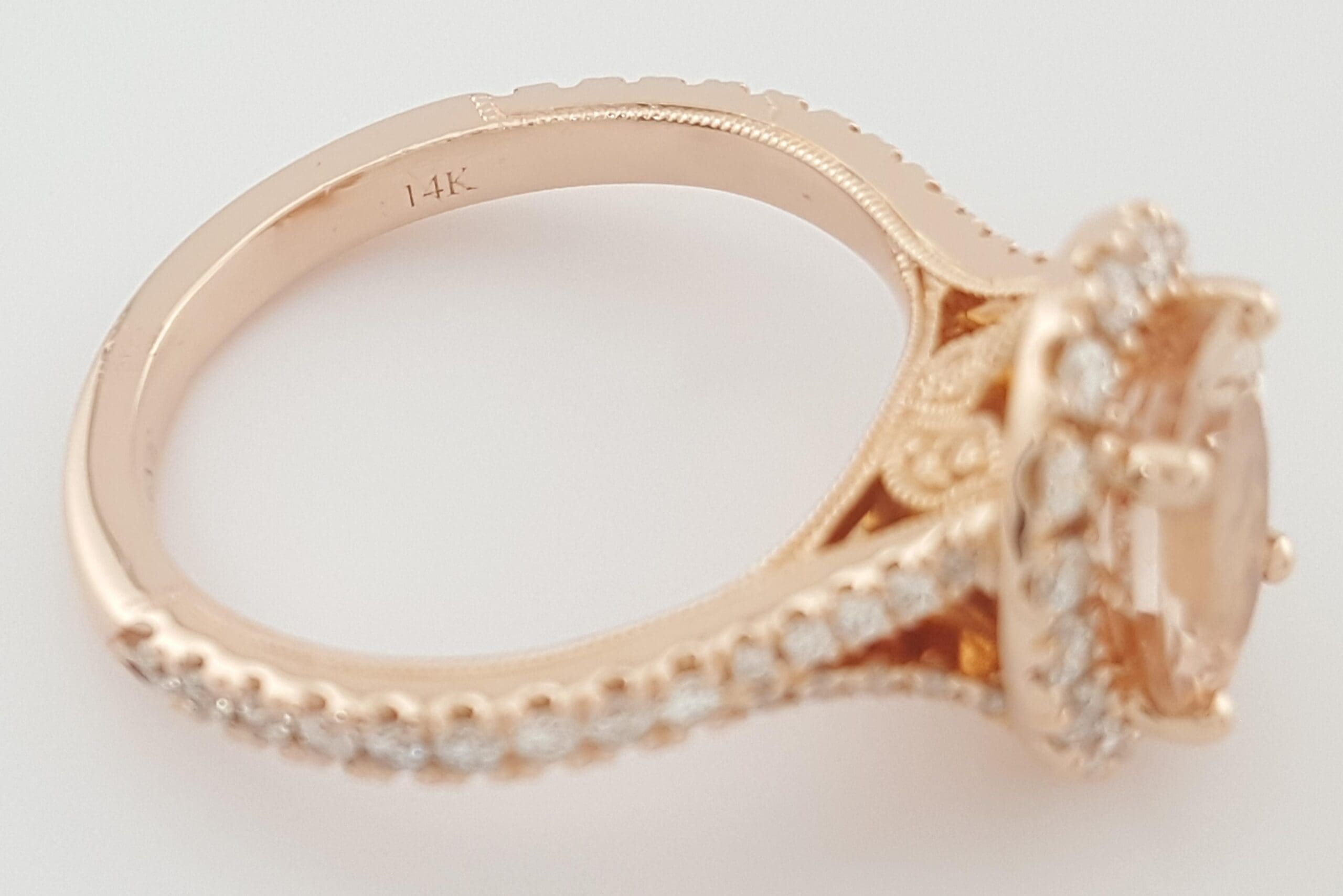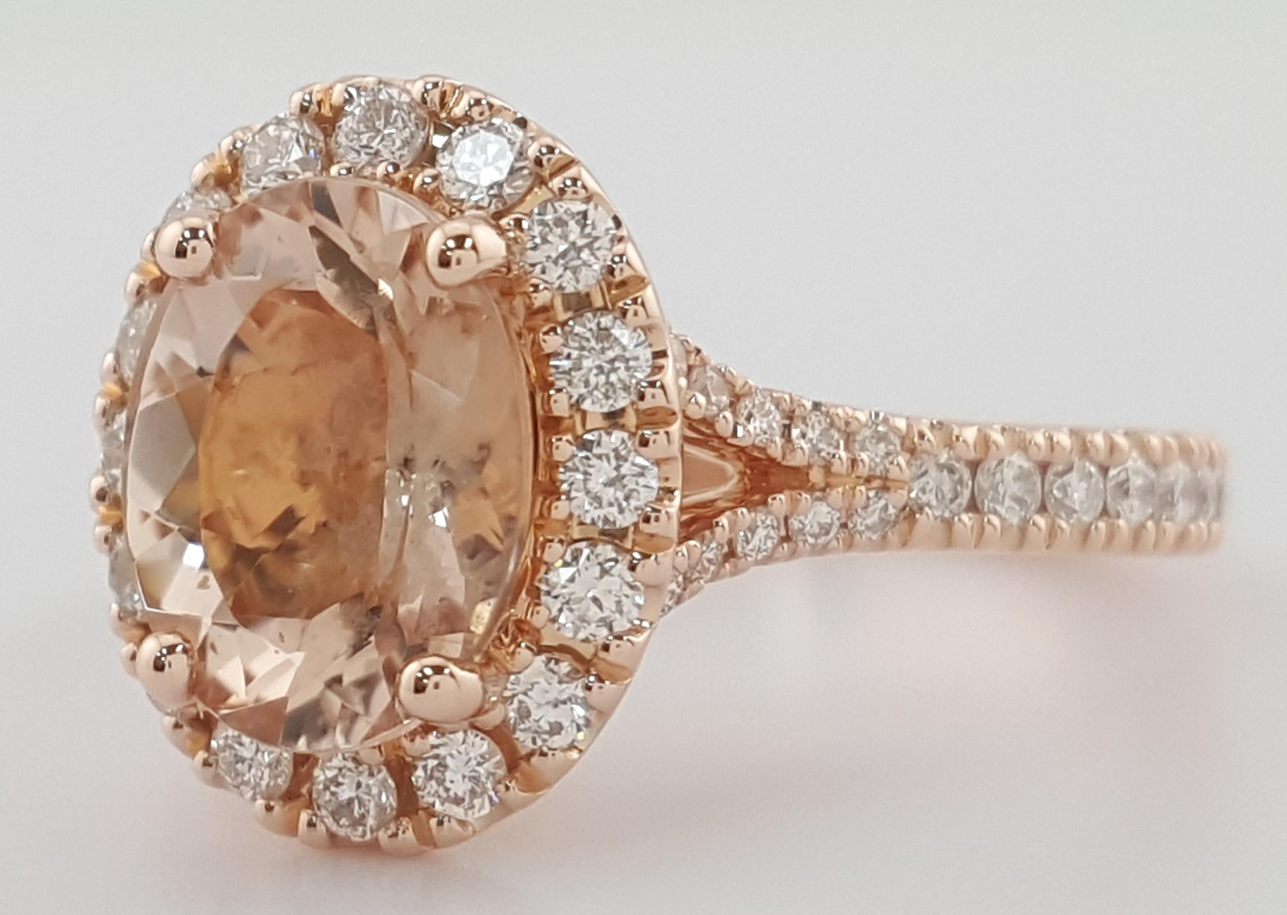 The ring weighs 4.4 grams, size 5.75, the center stone is a Natural Oval Peach Morganite, there are 54 Natural Round Cut side diamonds, H-I in Color, SI2-I1 in clarity, ~0.5 ct Total Weight.