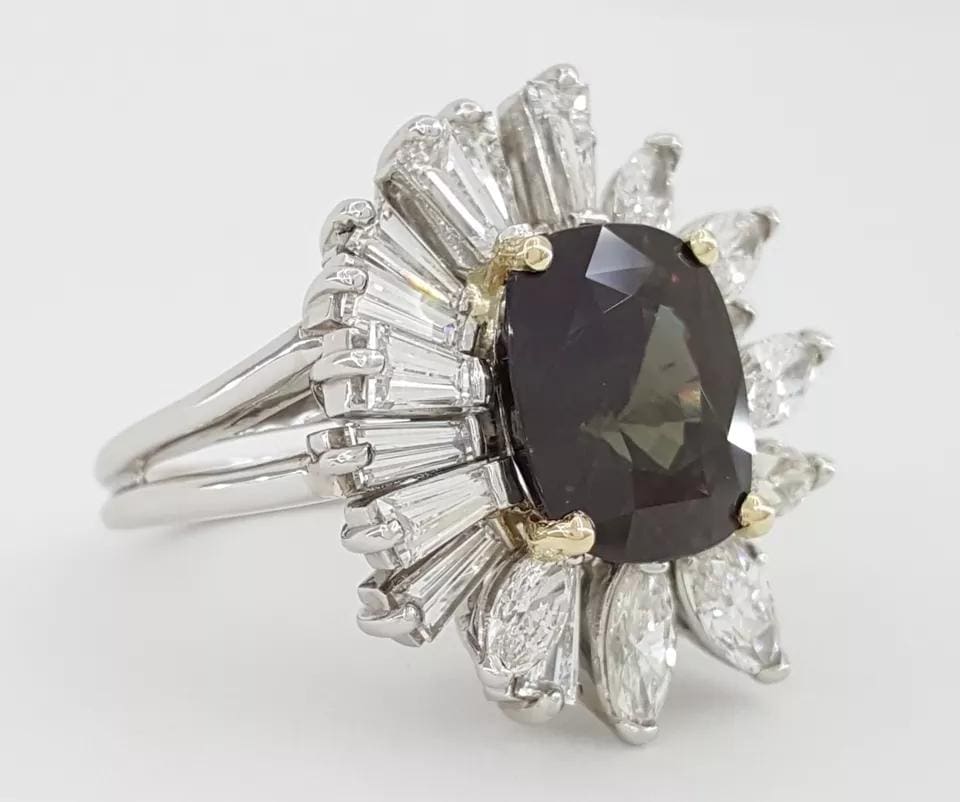The ring weighs 16.9 grams, size 7.5, The center stone is a very lively 6.04 ct Natural Cushion Cut Alexandrite, Blue-Green Changing to Reddish Purple in Color with 100% Color Change, This is the most desirable for an Alexandrite, Very Brilliant. The measurements of the center stone are 11.59 x 9.42 x 6.69 mm.