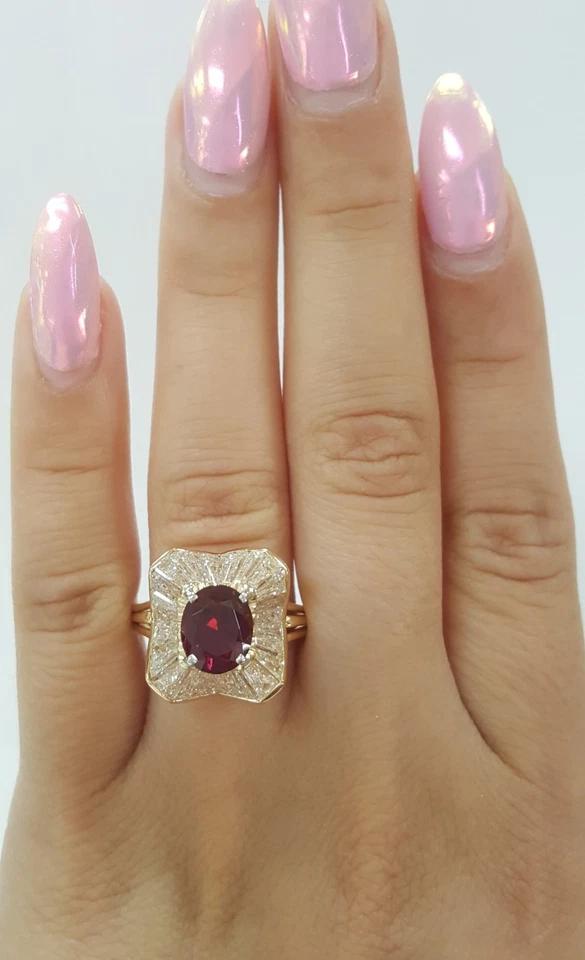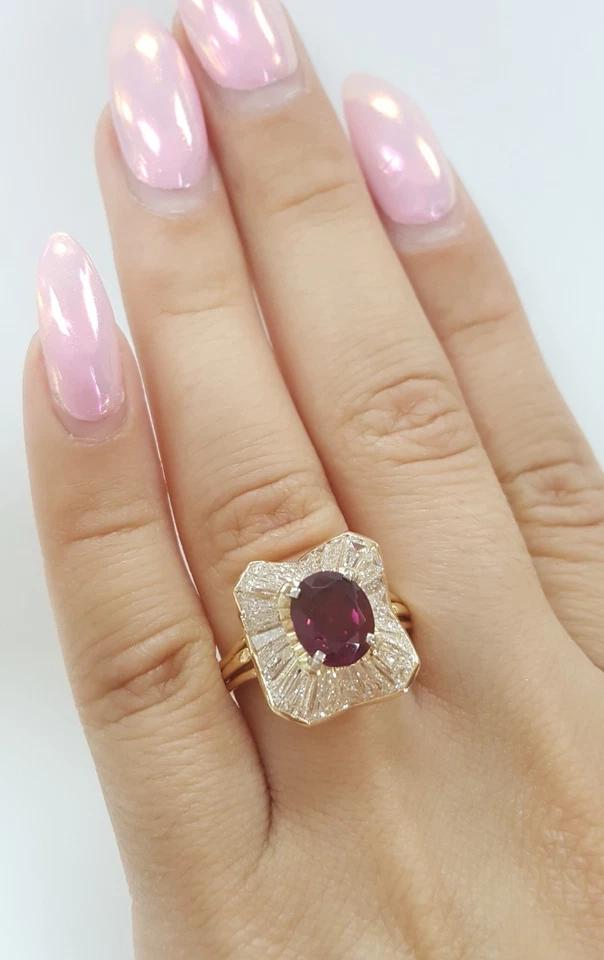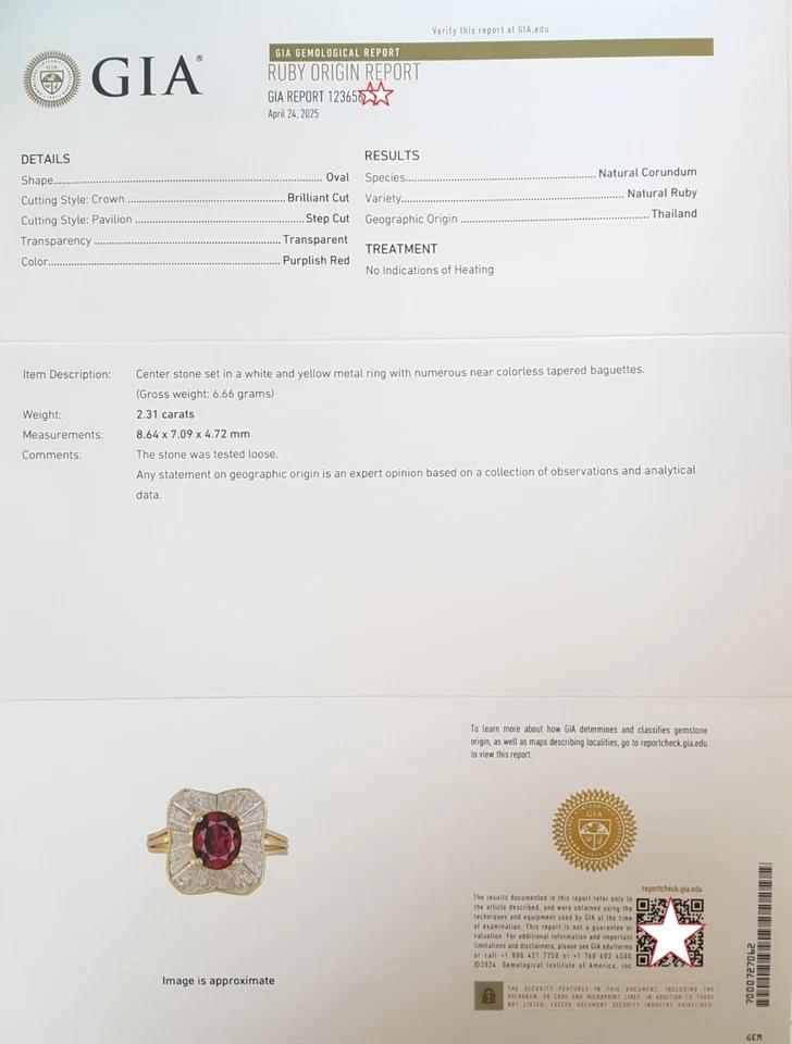 The ring weighs 6.6 grams, size 7.25, the center is a 2.31 ct Natural Oval Brilliant Cut Purplish Red No Heat Ruby, Measuring 8.64 x 7.09 x 4.72 mm. The ruby is very lively & brilliant!
