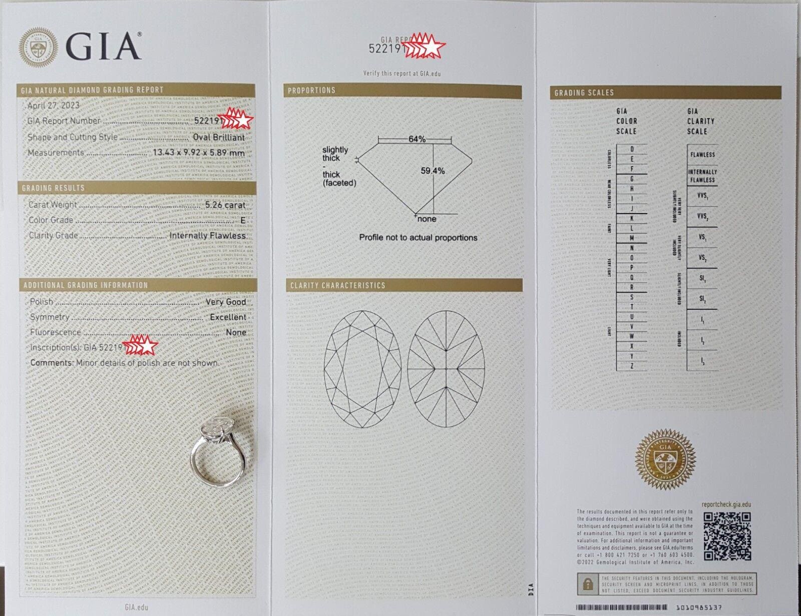 Oval Brilliant Diamond Solitaire 5.26 ct Engagement Ring E/Flawless GIA Rt $550K