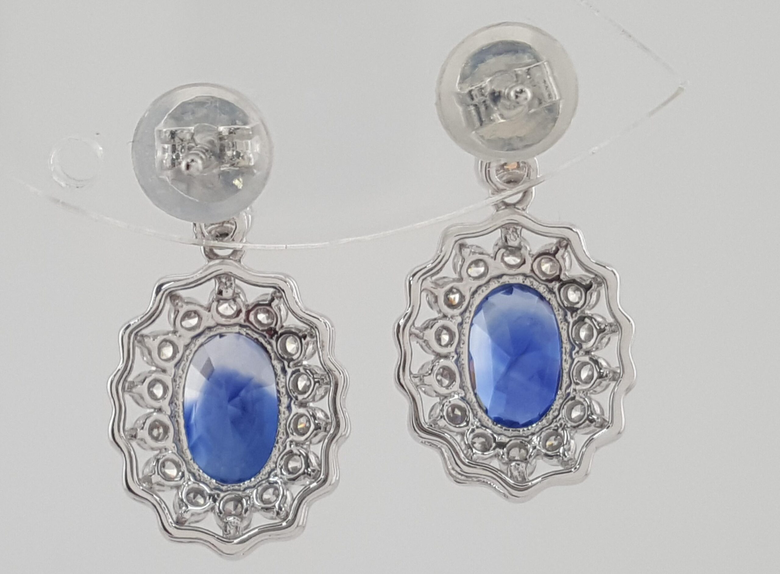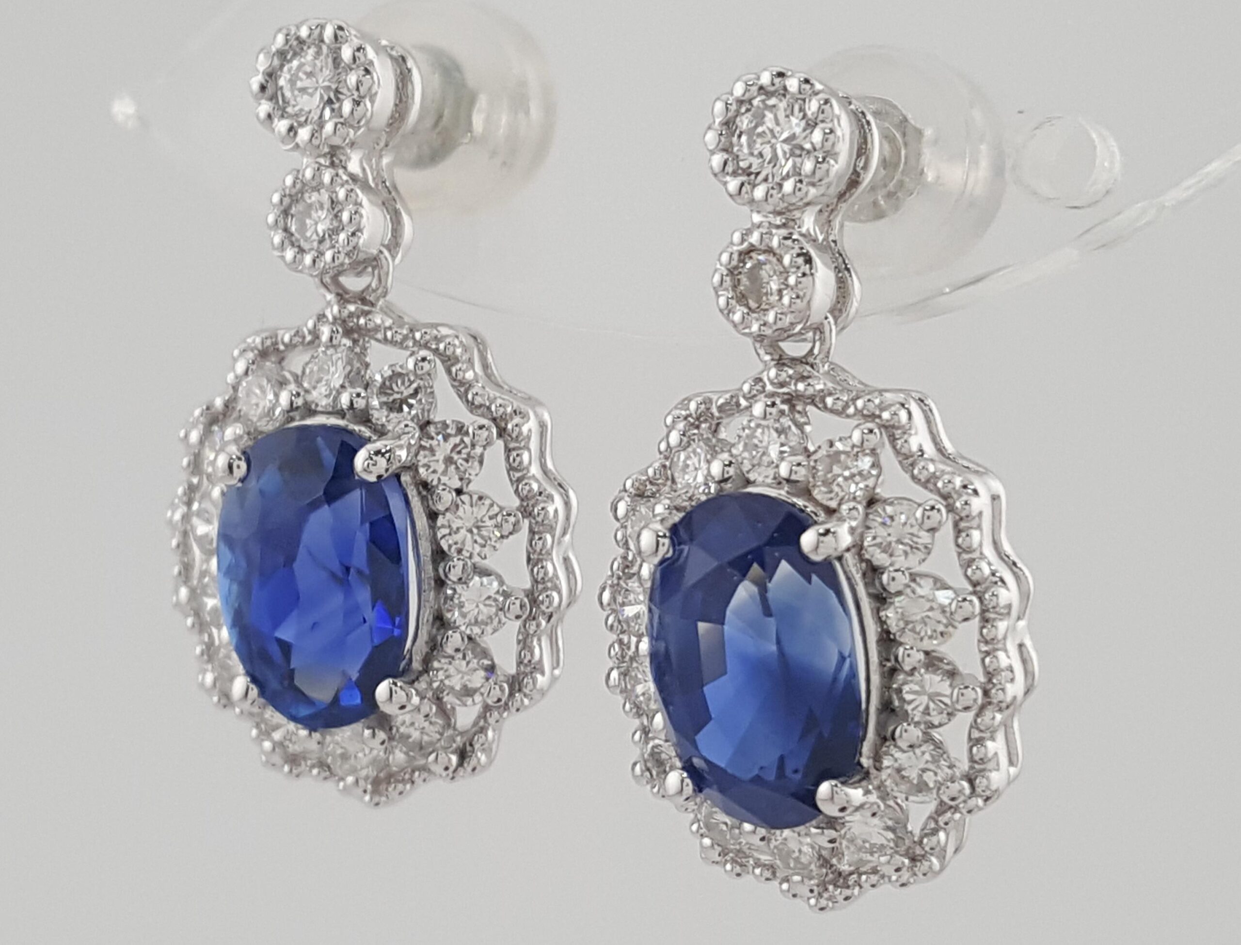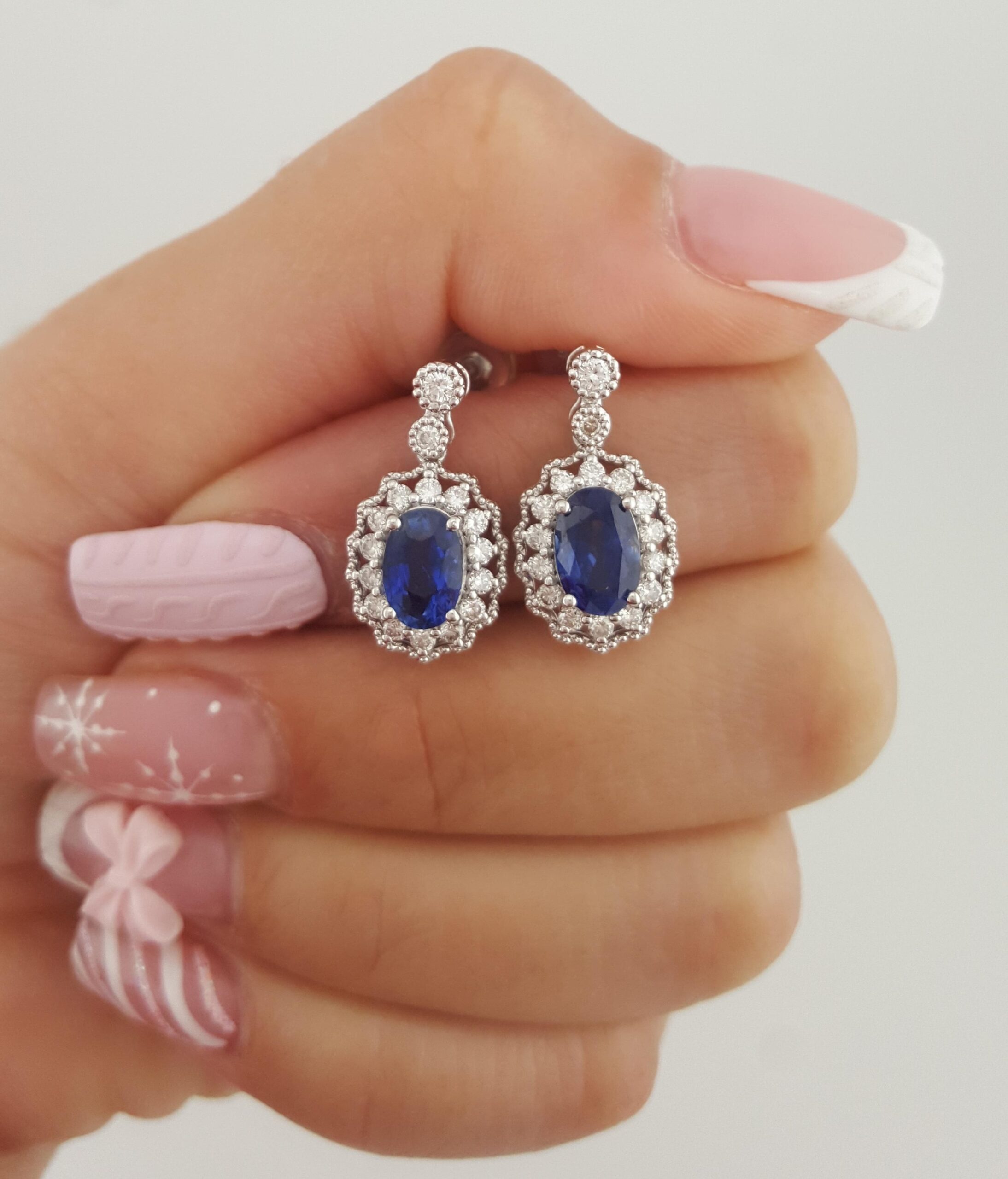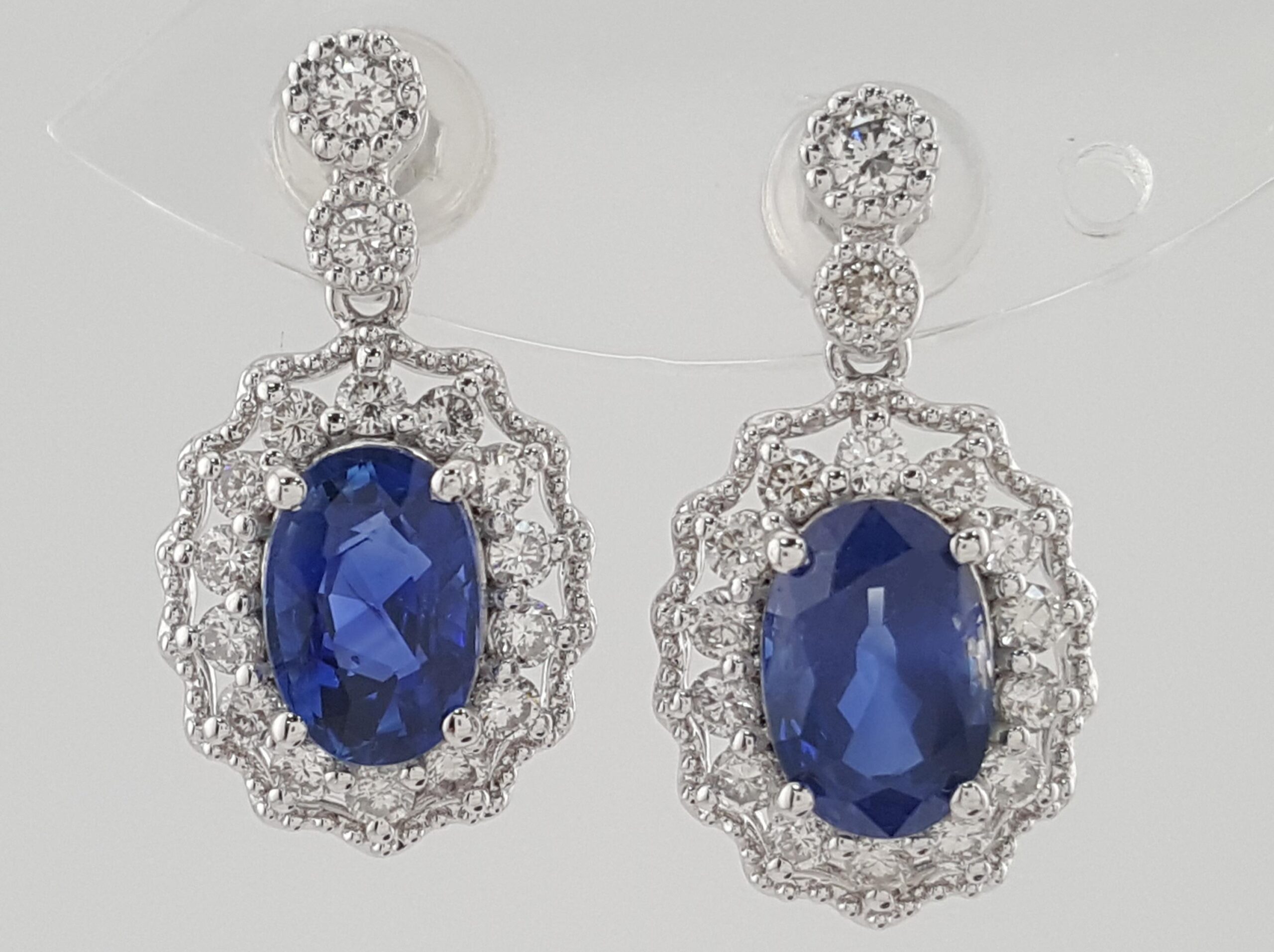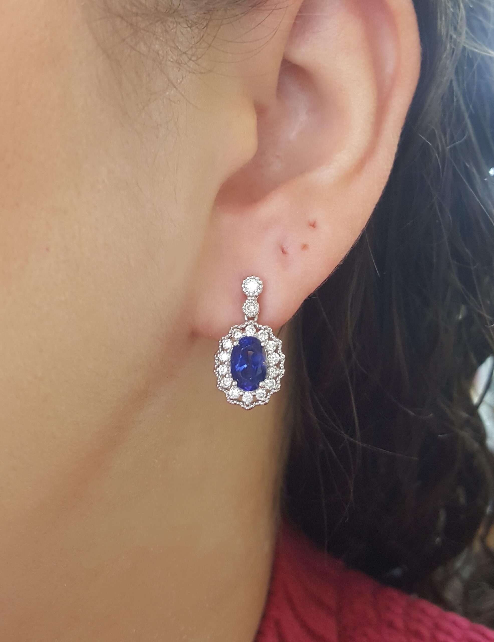 The earrings weigh 5.1 grams, 19.5 mm long, 10.4 mm wide, the 2 Natural Oval Blue Sapphires weighing ~2.85 ct & 32 Natural Round Brilliant Cut diamonds weighing ~0.62 ct, G-I in color, VS2-SI3 in clarity. The sapphires are vivid blue & are brilliant.