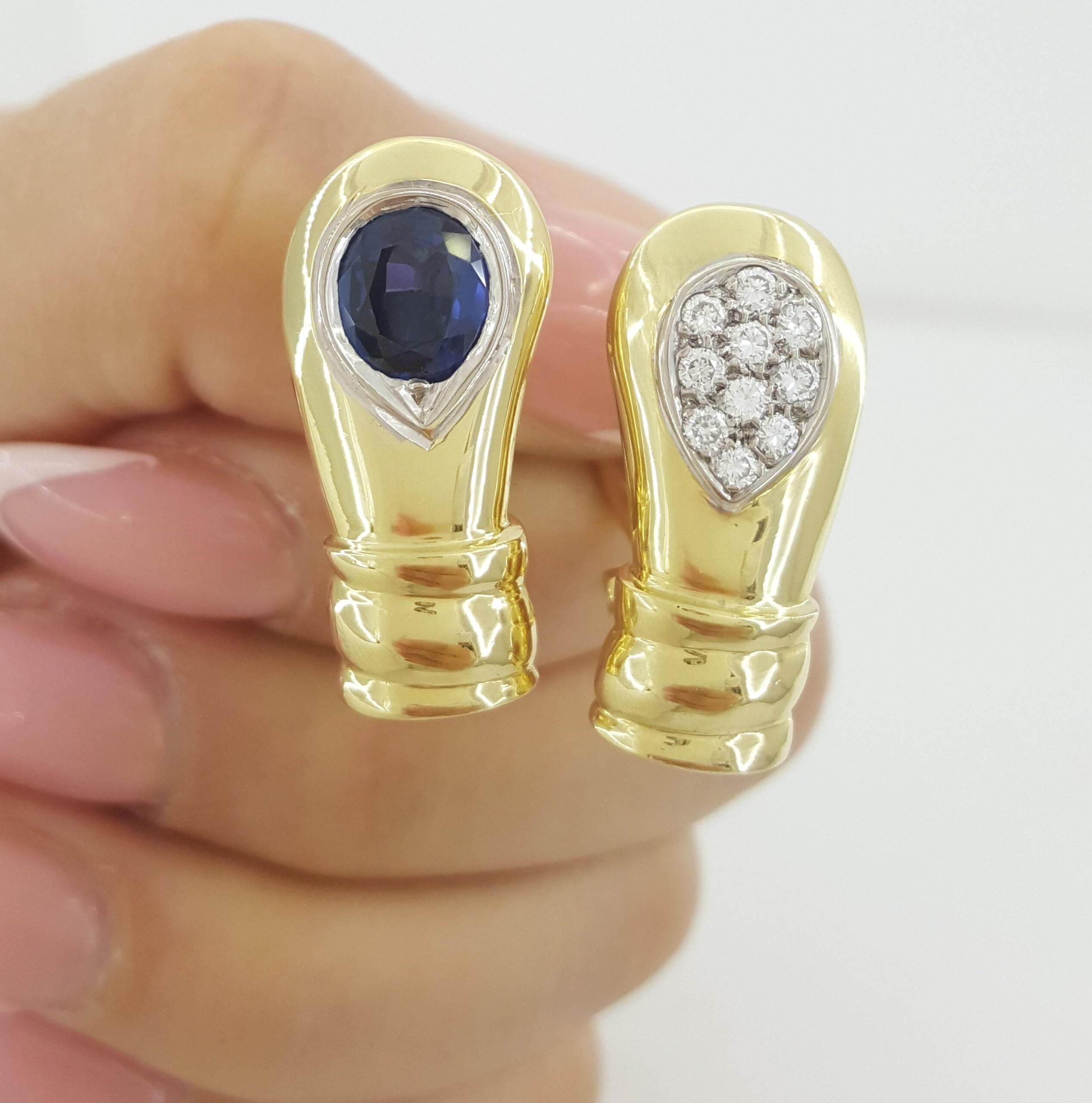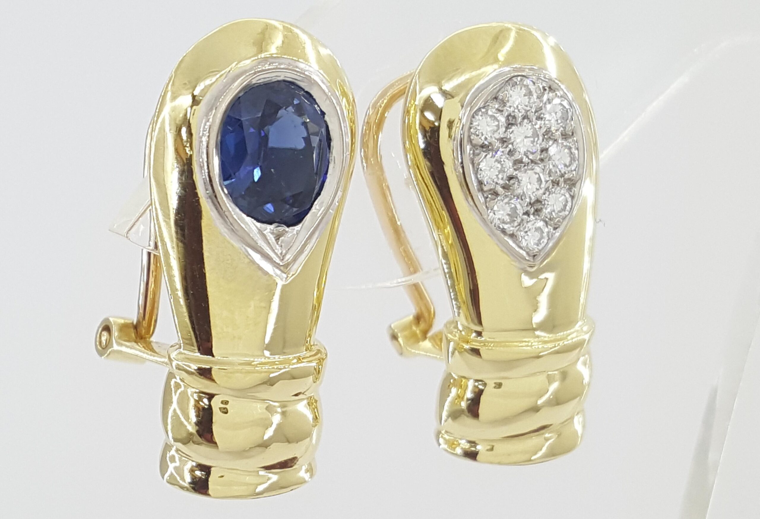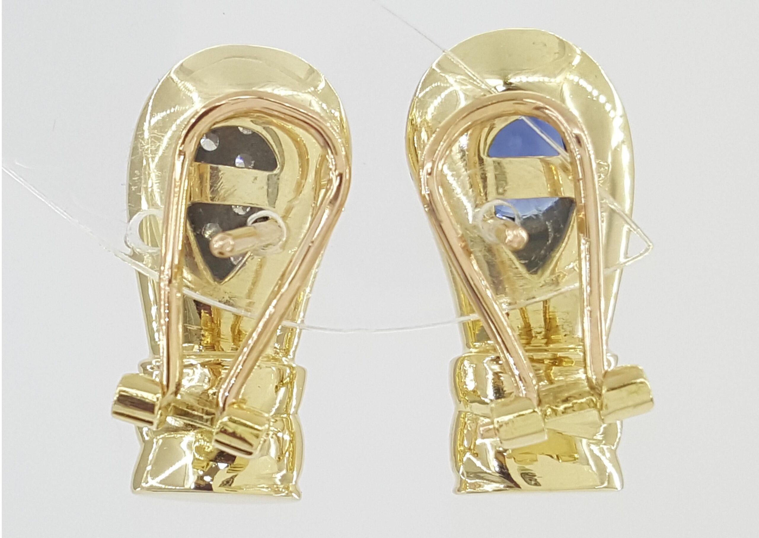 The earrings weigh 16.3 grams, 25 mm tall (0.98"), 12 mm wide, 5.7 mm thick, there is a natural ~1.5 ct Sapphire & Natural Round Brilliant Diamonds weighing approximately 0.2 ct total weight, F-H in color, VS-SI in clarity.