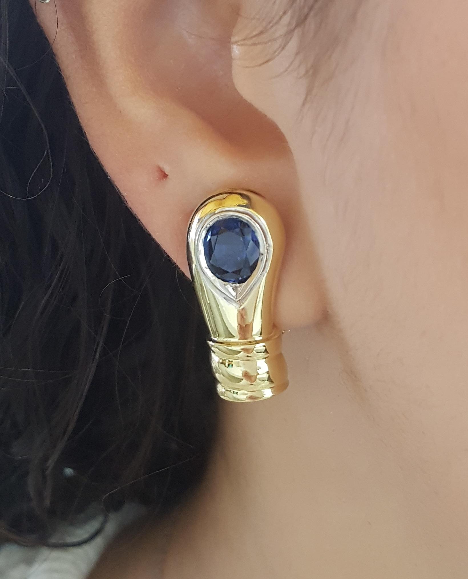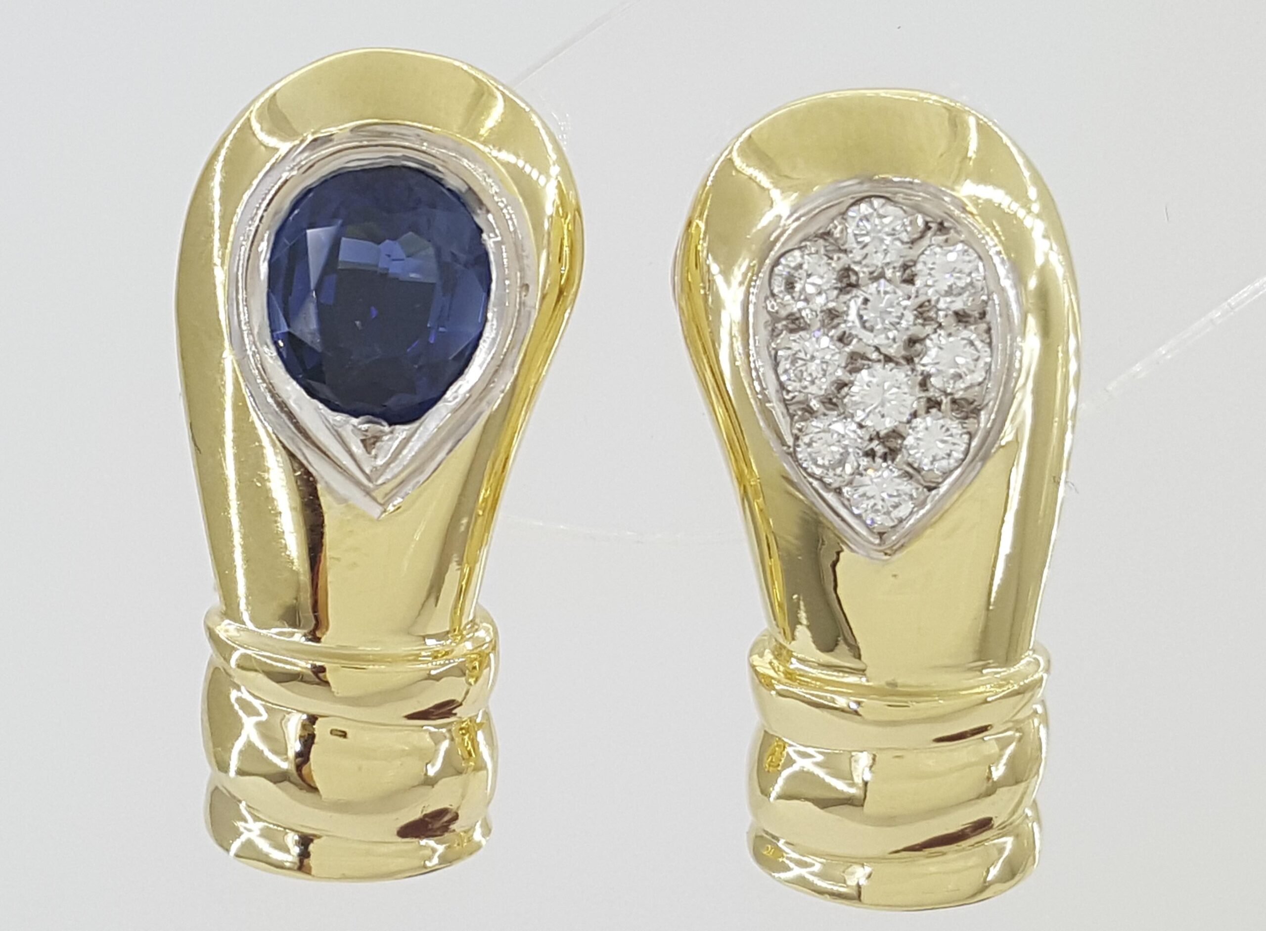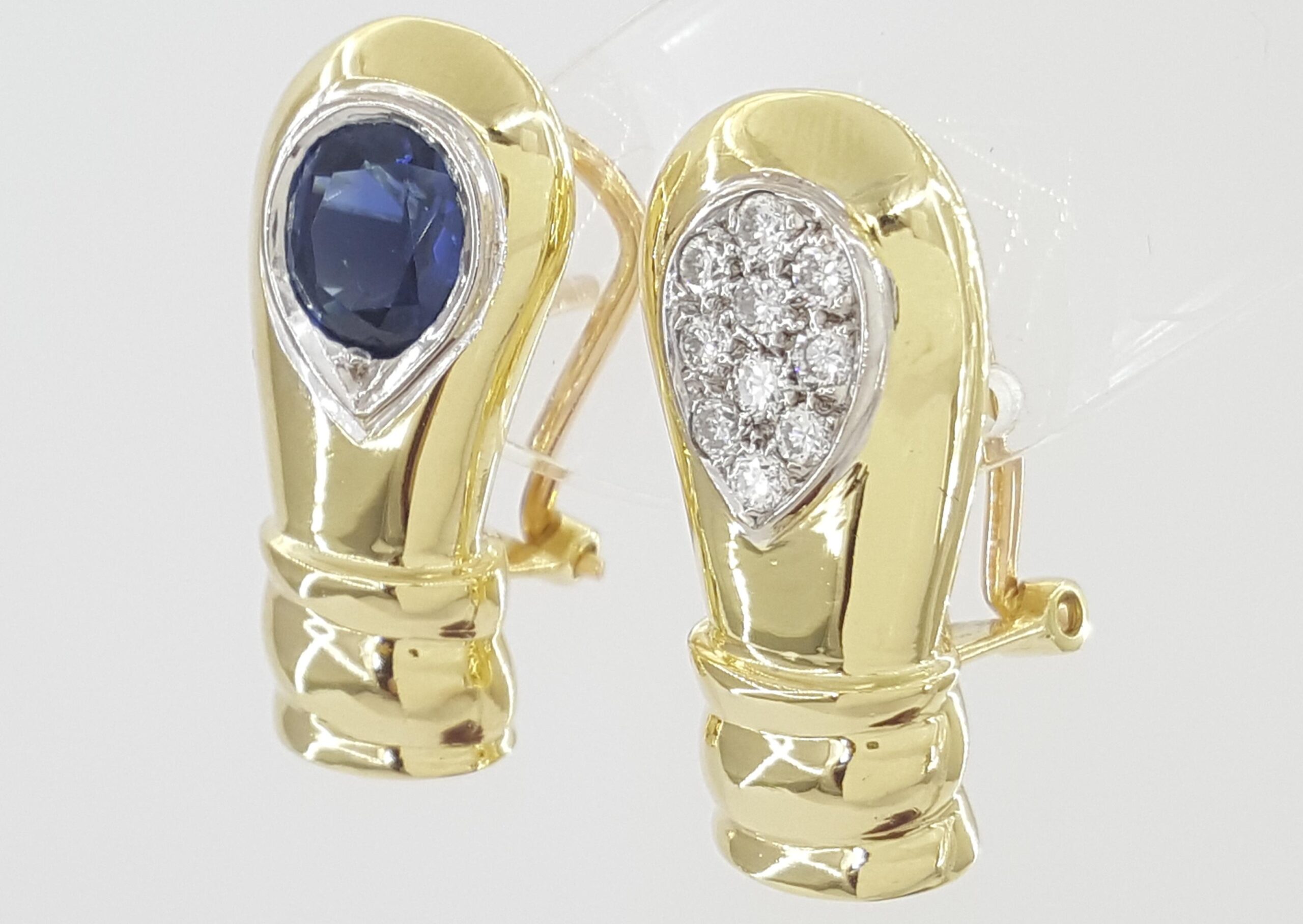 The earrings weigh 16.3 grams, 25 mm tall (0.98"), 12 mm wide, 5.7 mm thick, there is a natural ~1.5 ct Sapphire & Natural Round Brilliant Diamonds weighing approximately 0.2 ct total weight, F-H in color, VS-SI in clarity.