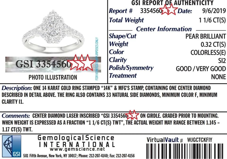 The ring weighs 3.5 grams, size 9, the center stone is a Natural 0.32 ct Pear Brilliant Cut Diamond, E-F in color, SI2 in clarity, Very Good Polish, None Fluorescence. The Ring is graded and inscribed by GSI: "3354560****".