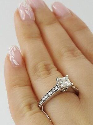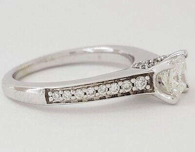 You are purchasing a 0.94 ct 14K White Gold Princess Brilliant Cut Diamond Engagement Ring. The ring weighs 4.4 grams, size 6, the center stone is a Natural Princess Brilliant Cut diamond weighing 0.64 ct, G-H in color, SI2 in clarity. Ring also contains 30 Natural Round Brilliant Cut Diamonds that are G-H in color, VS2-SI2 in clarity and weighing 0.30 ct. The ring has a retail replacement value of $3,400+Tax.