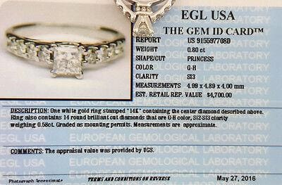 The ring weighs 5.3 grams, size 9, the center stone is a Natural Princess Brilliant Cut diamond weighing 0.80 ct, G-H in color, SI3 in clarity. The center stone has measurements of 4.99 x 4.89 x 4.00 mm. The ring also contains 14 Natural Round Brilliant Cut side diamonds weighing 0.58 ct, G-H in color, and SI2-SI3 in clarity.
