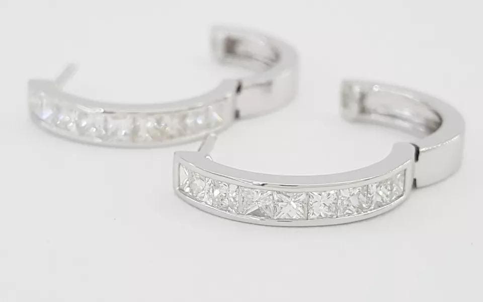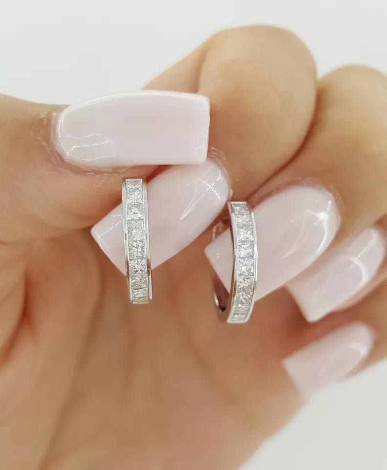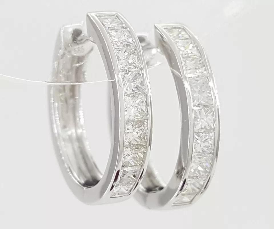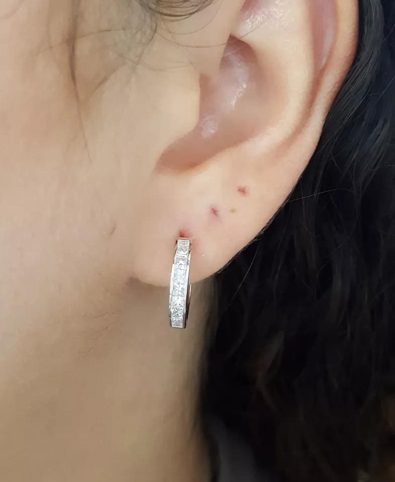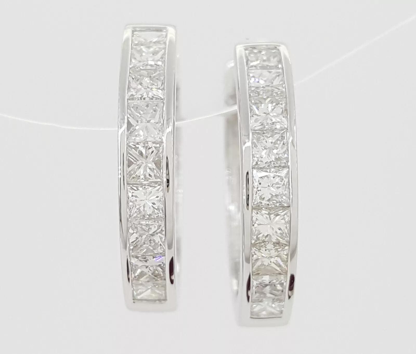 You are buying a pair of 14K White Gold 1 ct Princess Brilliant Cut Diamond Channel-Set Round Hoop Earrings.