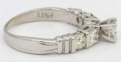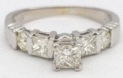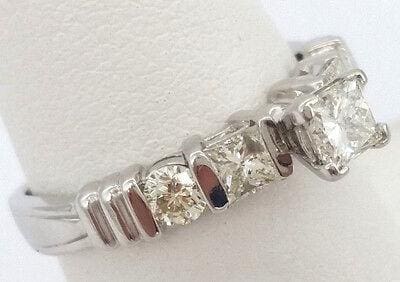 You are purchasing a 0.92 ct total weight 14K White Gold Princess Cut Diamond Engagement Ring. The ring weighs 3.3 grams, size 6.25, the center stone is a Natural Princess Brilliant Cut diamond weighing approximately 0.35 ct, H-I in color, VS1-VS2 in clarity. There are 2 Natural Princess Cut Side Diamonds weighing approximately 0.35 ct, H-I in color, VS2-SI1 in clarity & 2 Natural Round Brilliant Cut diamonds weighing ~0.22 ct total weight, J-K in color, VS1-VS2 in clarity. The ring is stamped "14K" & "PSTY".