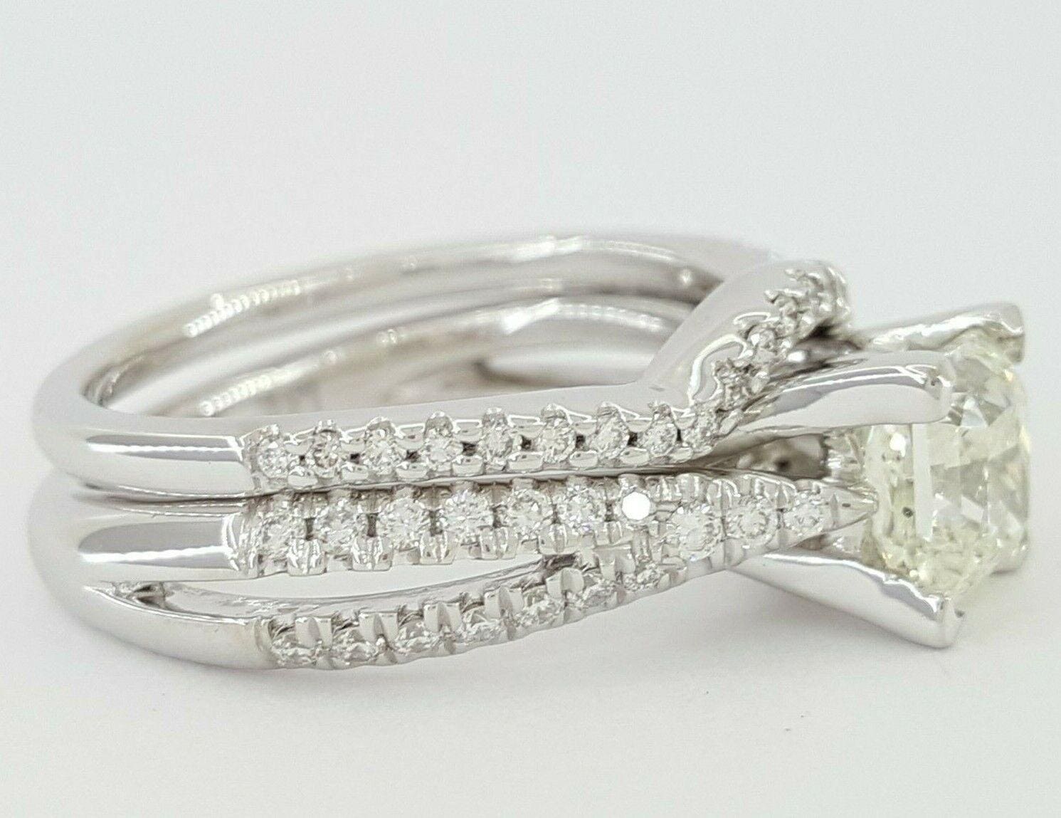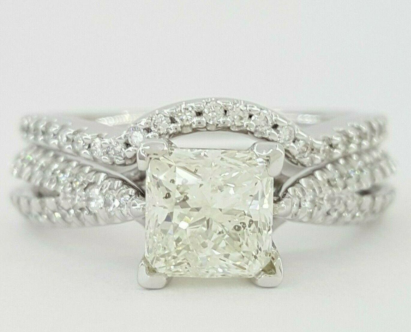 The set weighs 7.9 grams, size 6, the center stone is a 1.34 ct Natural Square Radiant Cut diamond, I in color, SI3 in clarity with measurements 5.9 x 5.8 x 4.61 mm. The engagement ring also contains 38 Round Brilliant Cut diamonds weighing 0.33 ct, G-H in color, SI1-SI2 in clarity. The wedding band contains 25 Round Brilliant Cut diamonds weighing 0.13 ct, G-H in color, SI1-SI2 in clarity