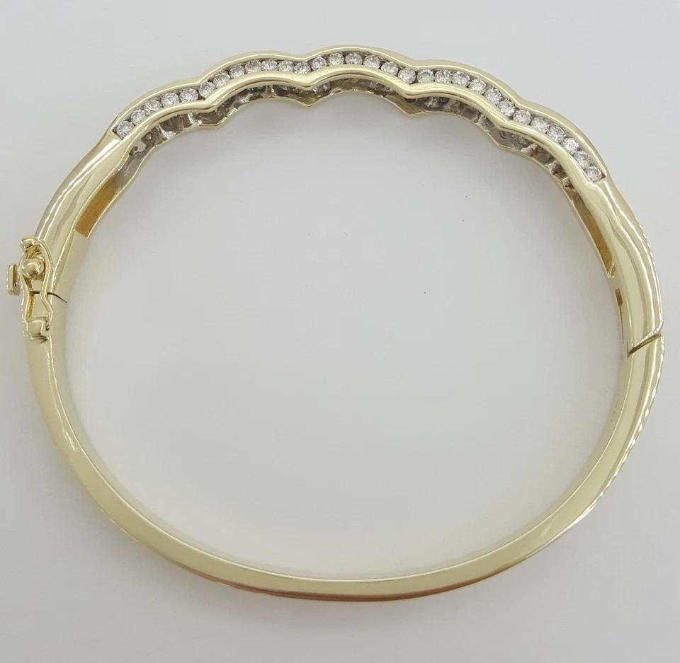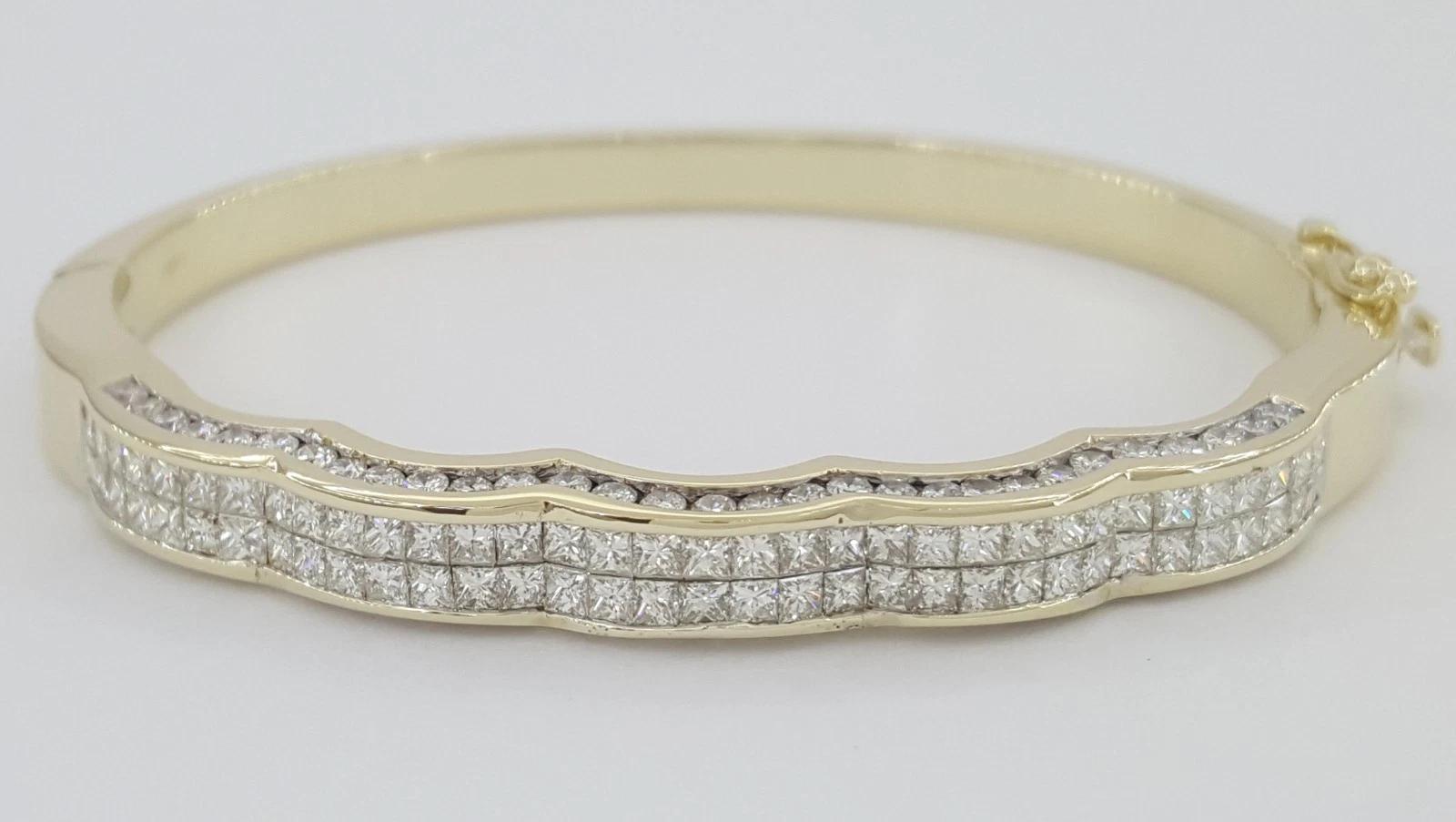 You are purchasing a 4 ct total weight 14K Yellow Gold Princess & Round Cut Diamond Bangle Bracelet.