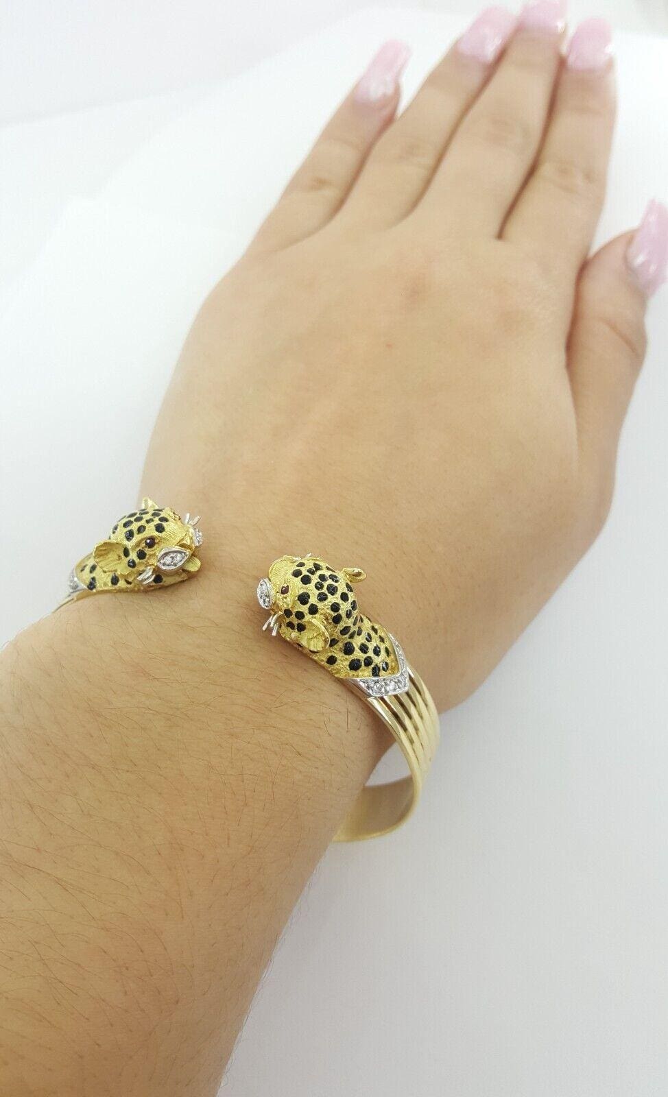 You are purchasing a Ramon Barcelona 0.24 ct total weight 18K Yellow Gold Leopard Round Brilliant Cut Diamond, Ruby & Black Onyx Bangle / Bracelet.