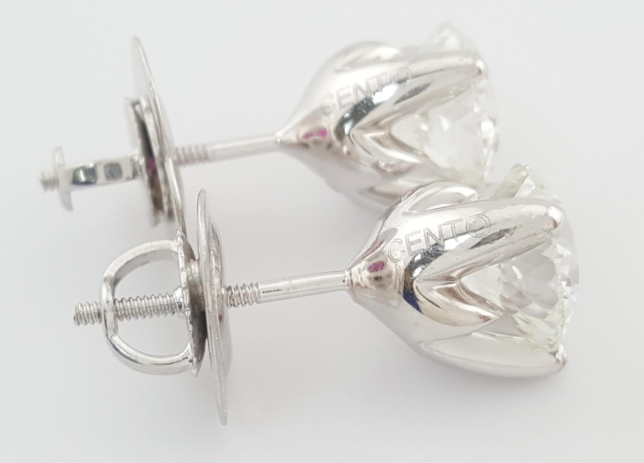 The earrings weigh 5.7 grams, there are 2 Natural Round Cento Cut diamonds weighing 3.61 ctw, G in color, VVS2-VS1 in clarity.