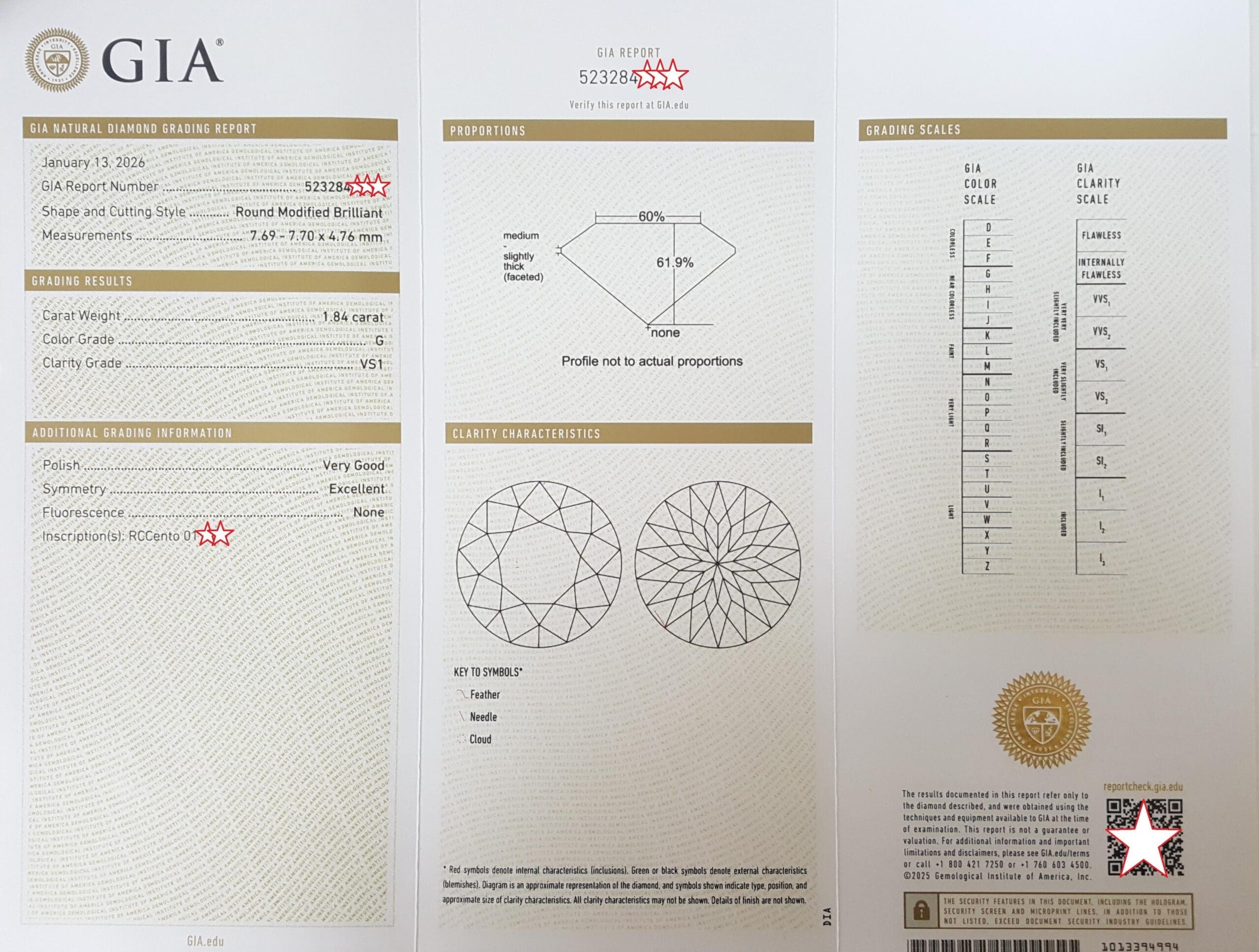 Stone #1: Natural 1.84 ct Round Brilliant Cut Diamond, G in color, VS1 in clarity, Very Good Polish, Excellent Symmetry, None Fluorescence, Measuring 7.69 x 7.70 x 4.76 mm, graded by GIA inscribed with "RCCento 011***".