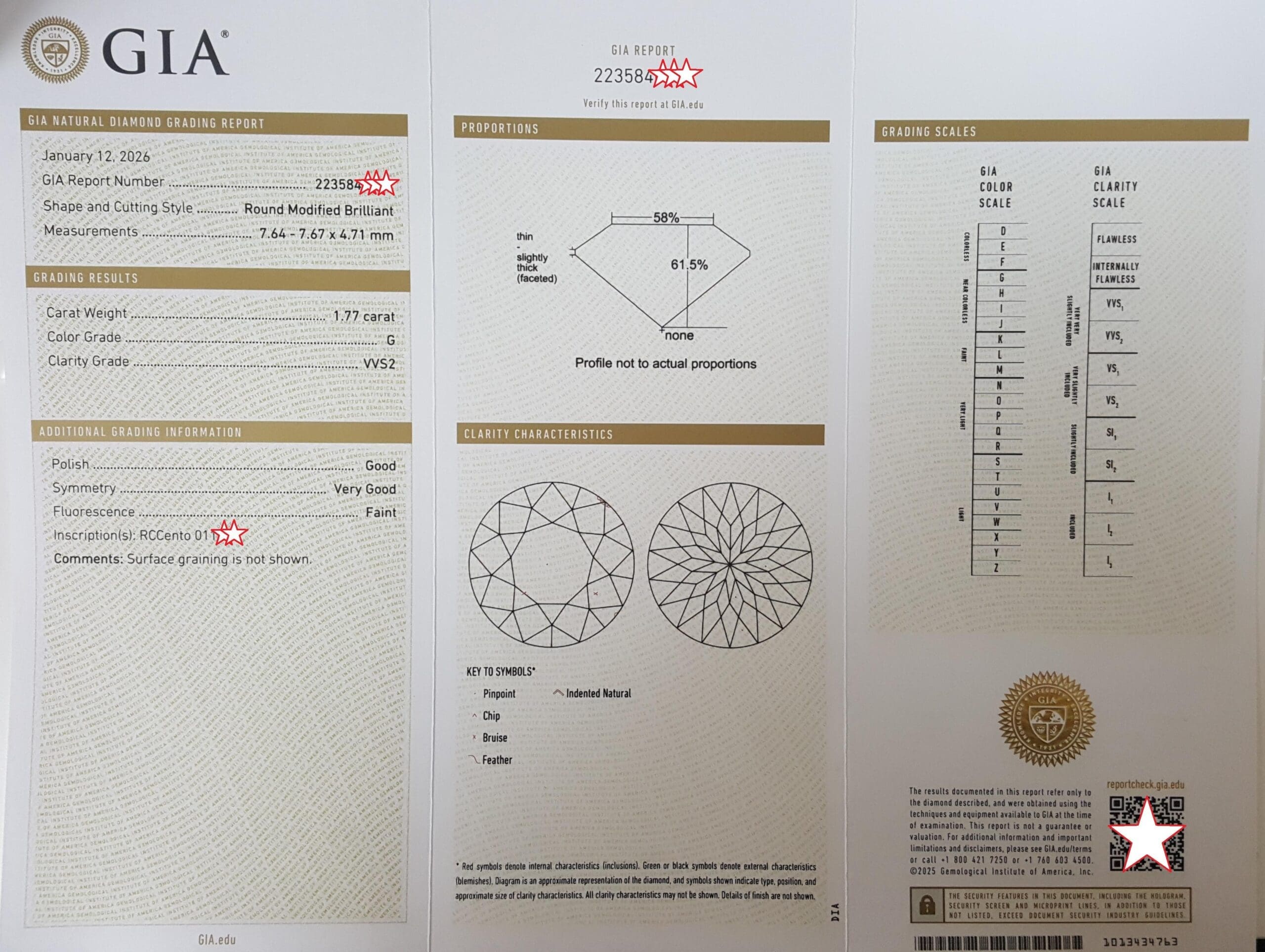 Stone # 2: Natural 1.77 ct Round Cento Cut Diamond, G in color, VVS2 in clarity, Good Polish, Very Good Symmetry, Faint Fluorescence, Measuring 7.64 x 7.67 x 4.71 mm, graded by GIA inscribed with "RCCento 011***".