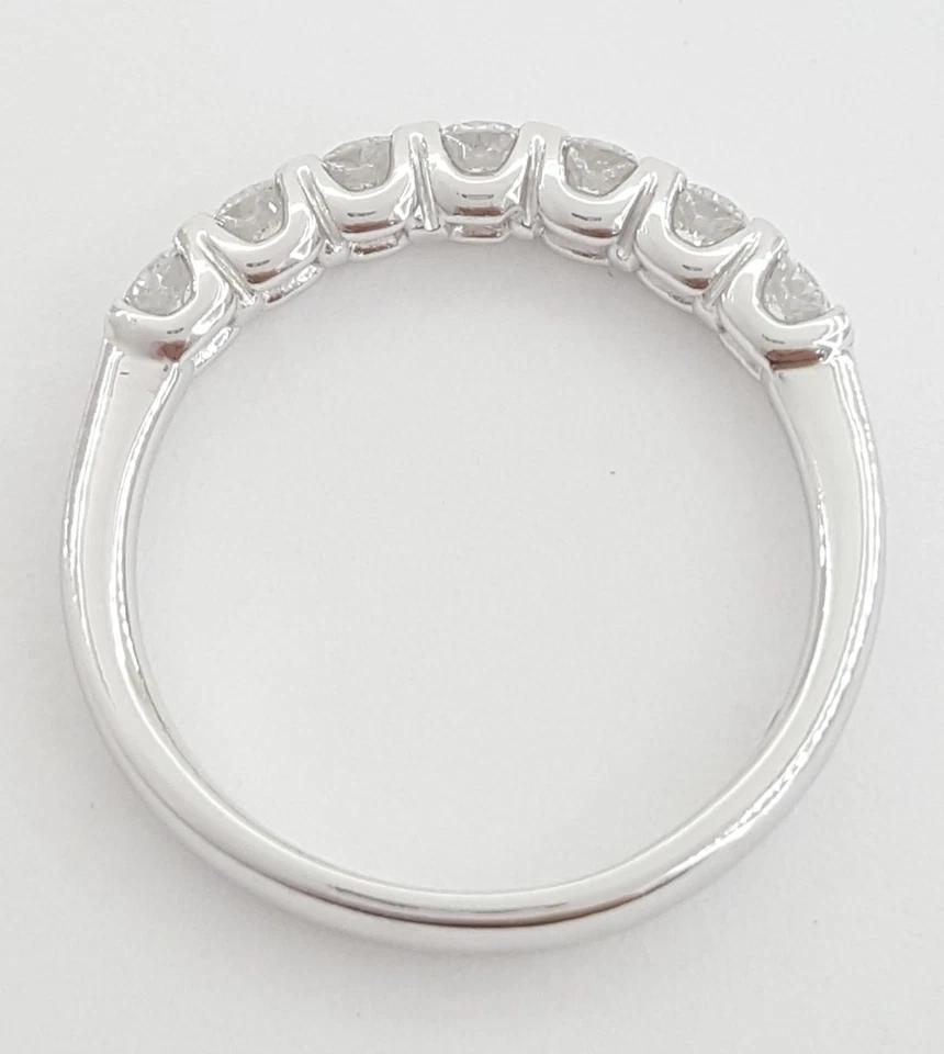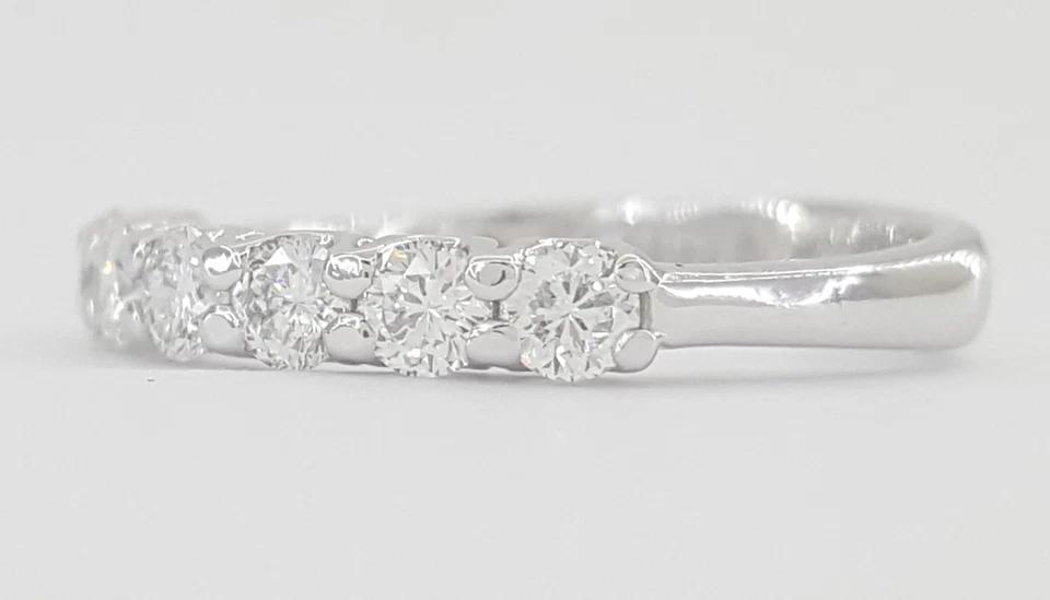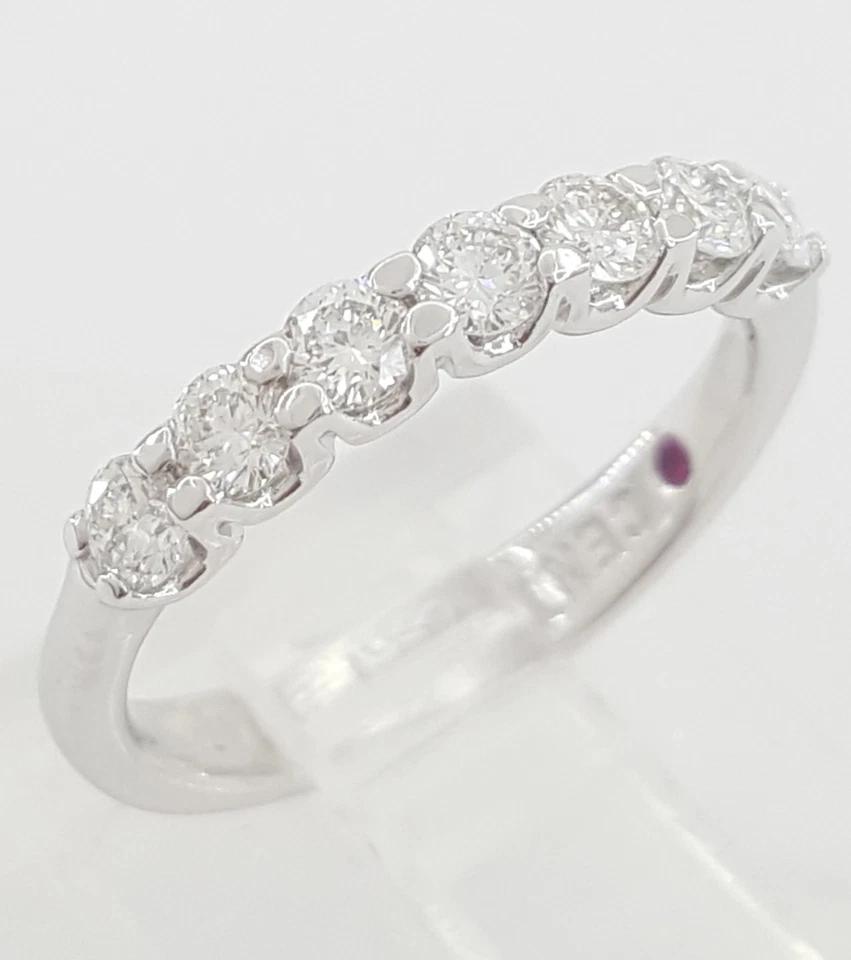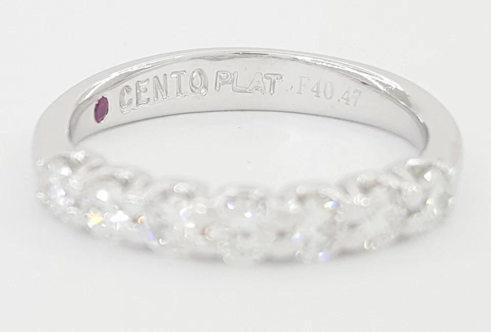 The ring weighs 3.3 grams, size 4.25, there are 7 Round Brilliant Cut Diamonds weighing ~0.47 ct, G-H in color, VS-SI in clarity. The ring has a designer's signature small red ruby & is stamped "CENTO PLAT F40 .47".