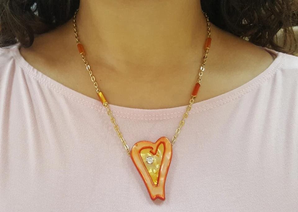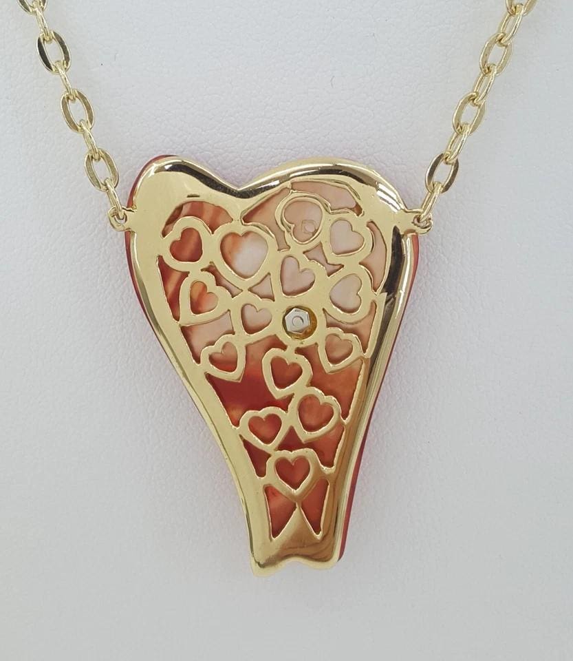 The Necklace weighs 27.3 grams, the pendant is 44.7mm (1.75 inches) long, 30.7 mm wide, 6.3 mm thick. There is a Natural Round Brilliant Cut diamond weighing Approximately 0.25 ct, G in color, VS in clarity.