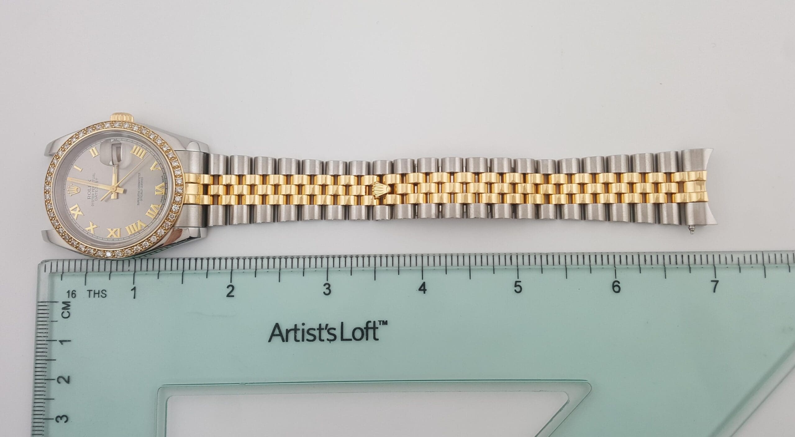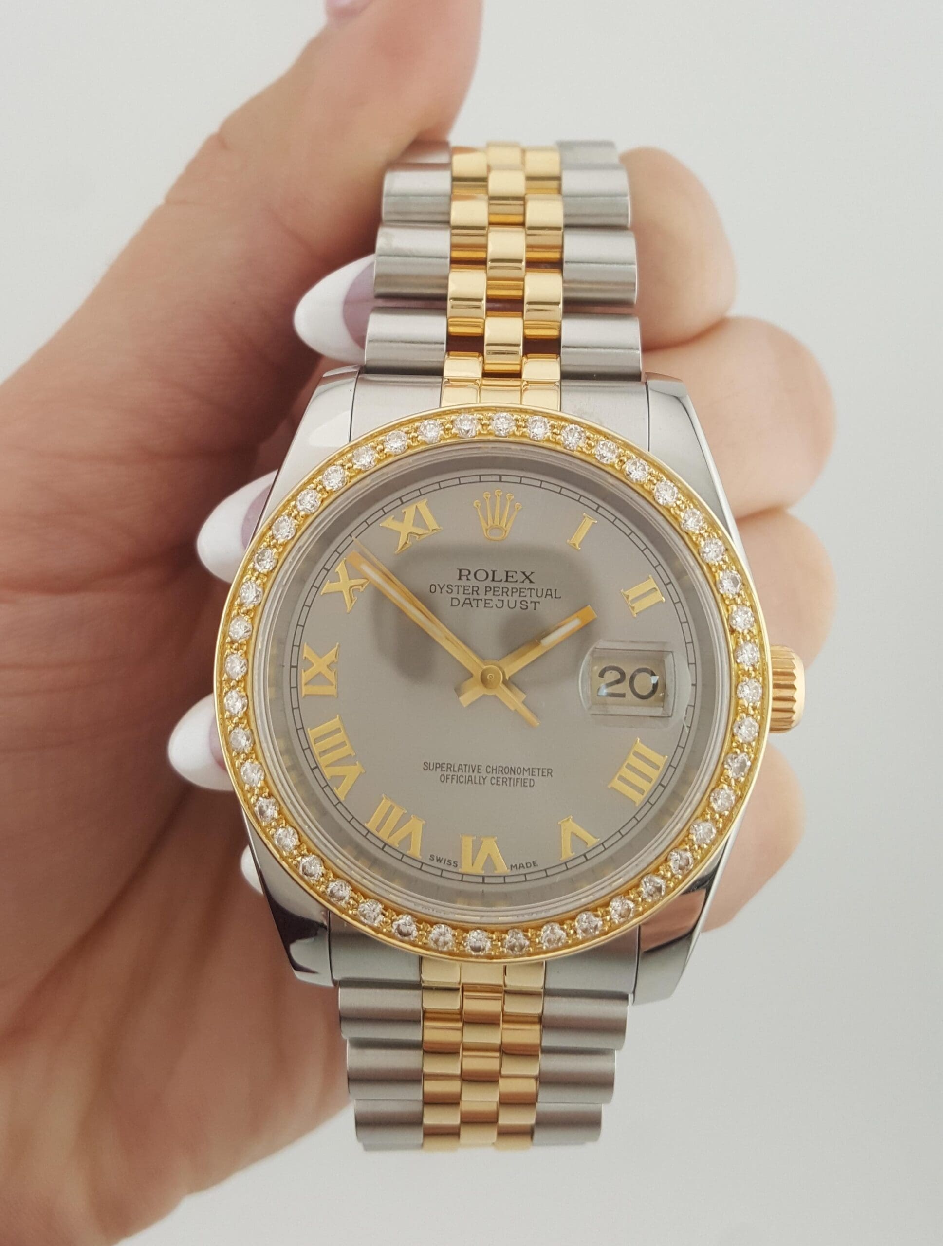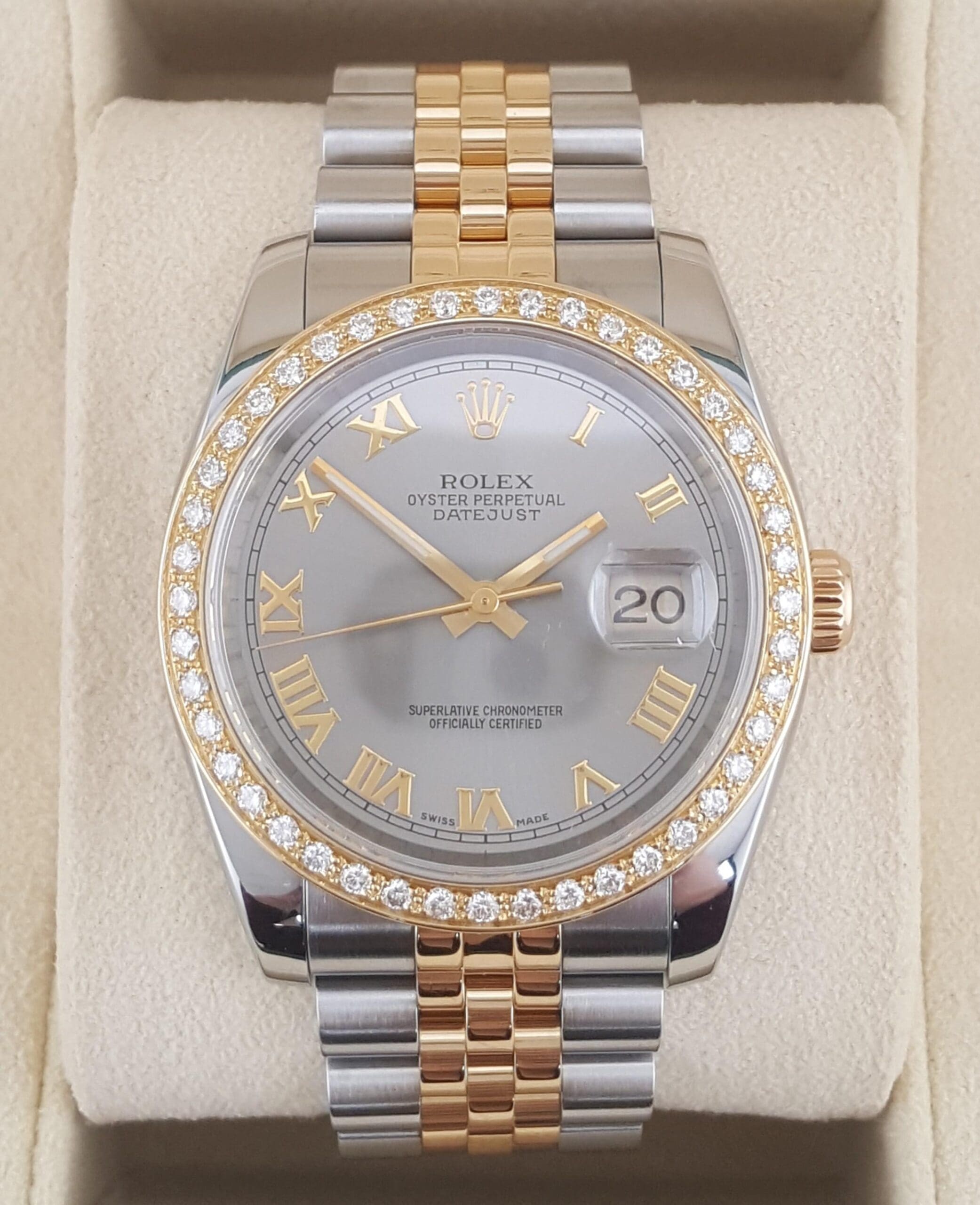 The watch features a screw-down crown, 18K yellow gold Rolex with Aftermarket Diamond Bezel, sapphire cyclops crystal, Slate Gray Roman Numeral dial, date calendar at 3 o'clock aperture, can fit up to a 6.75" wrist.