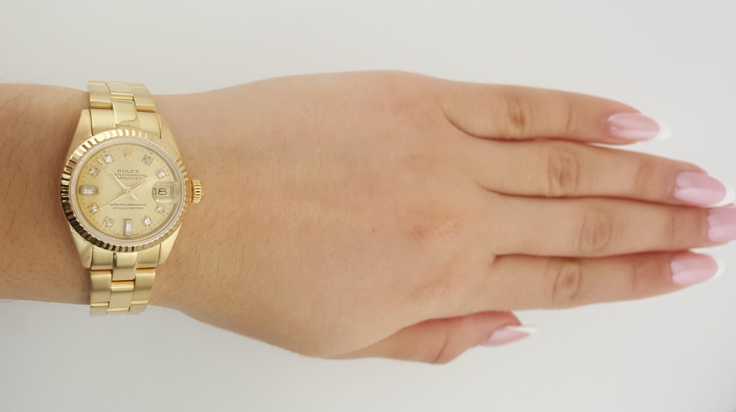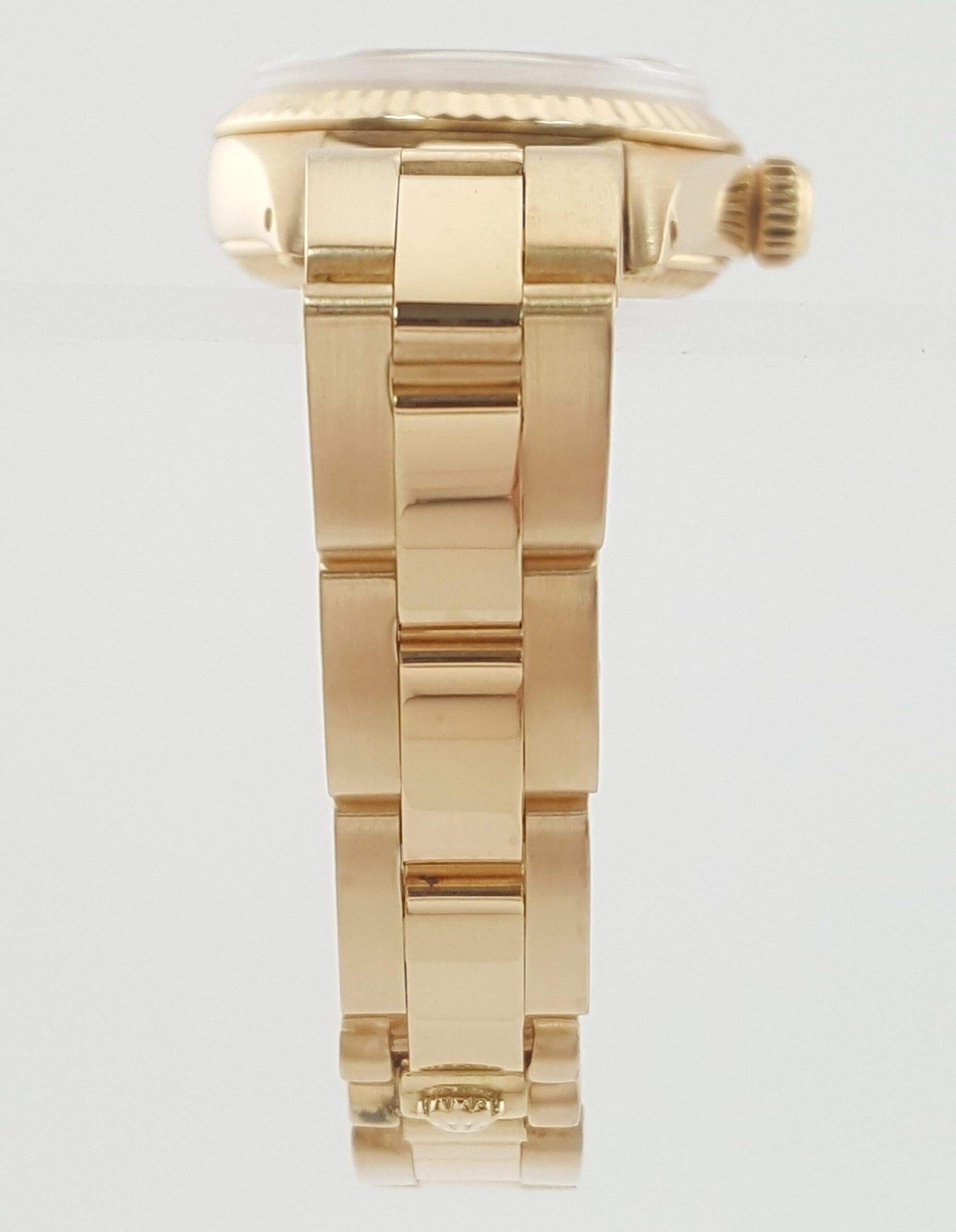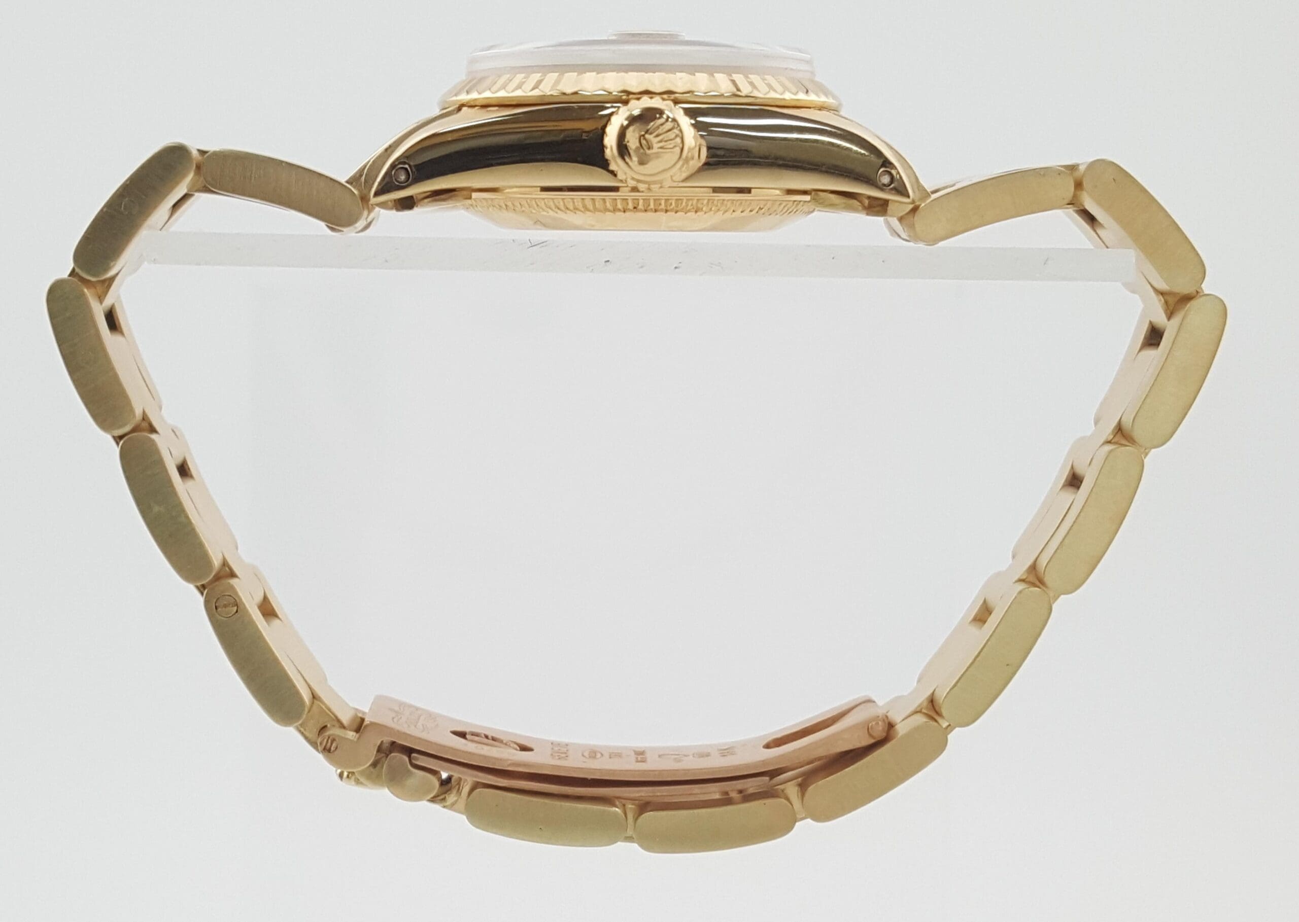 The watch weighs 72.7 grams of 18k gold, features a screw-down crown, 18k Yellow Gold Fluted Bezel, Sapphire Crystal, Champagne Aftermarket Diamond Dial, 18K Yellow Gold Oyster Bracelet, can fit up to a 7" wrist.