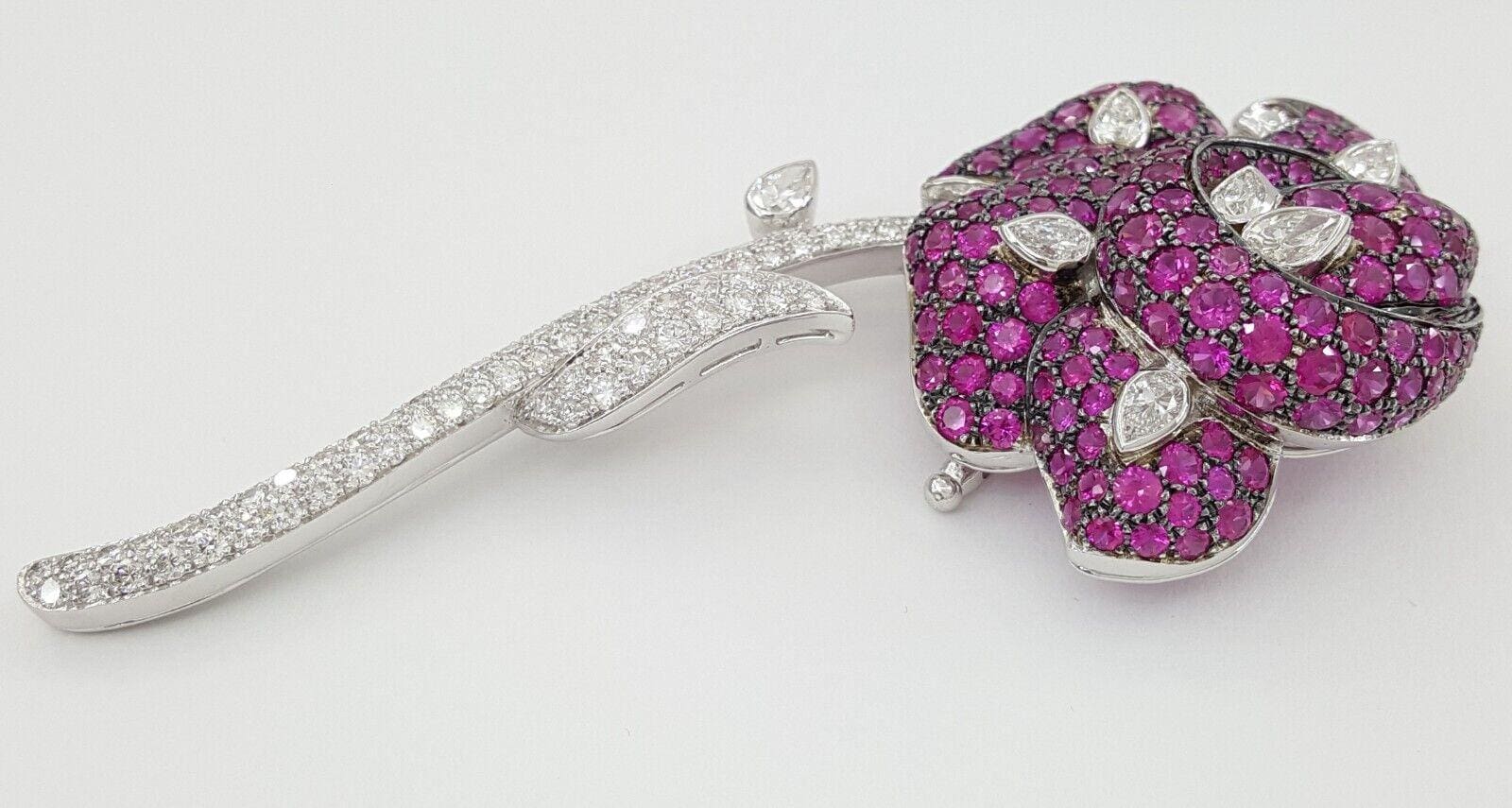 Rose Brooch 18K White Gold 14.26 ct Round Pear Cut Diamonds & Pink Sapphires