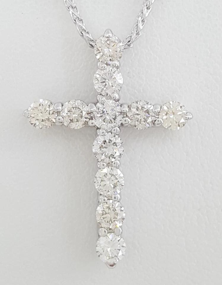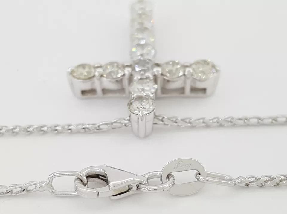 The cross & chain weigh 5.8 grams, 19.4 mm wide, 27.2 mm long & 4.7 mm thick. There are 11 Natural Round Brilliant Cut diamonds weighing approximately 1.76 ct, I-K in color, SI1-I1 in clarity, the diamonds are eye-clean.