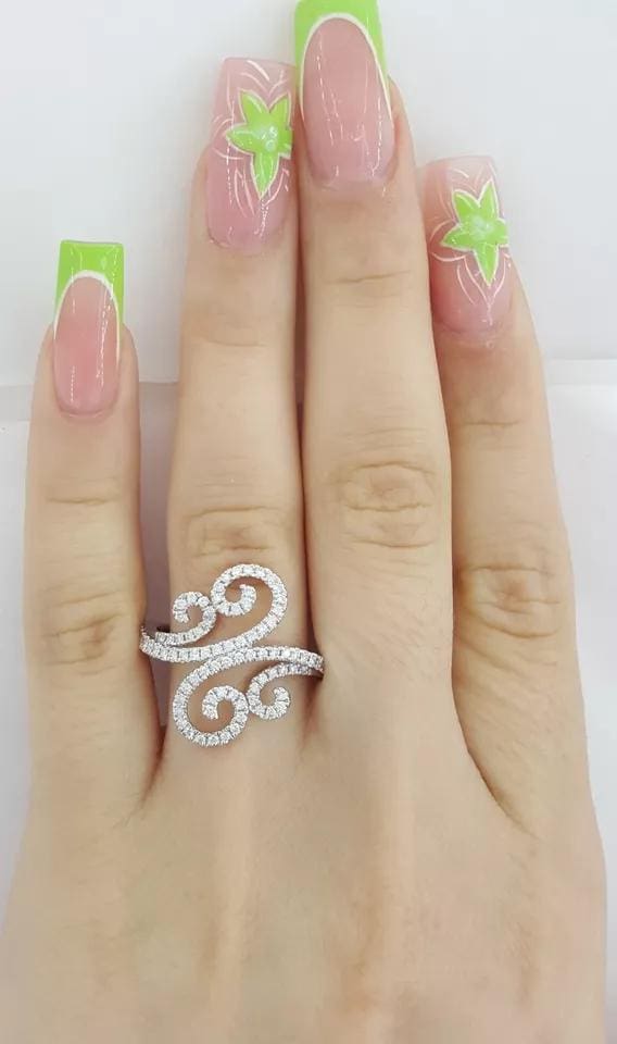 The ring weighs 4.5 grams, size 9.5, 20mm wide, there are 88 Natural Round Brilliant Cut diamonds weighing ~0.51 ct, G-I in color, VS-SI in clarity.