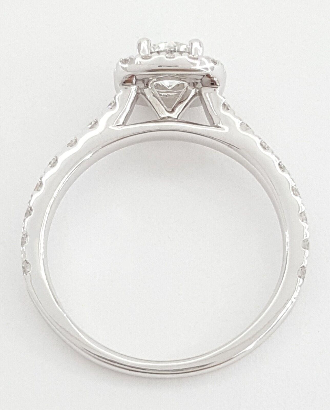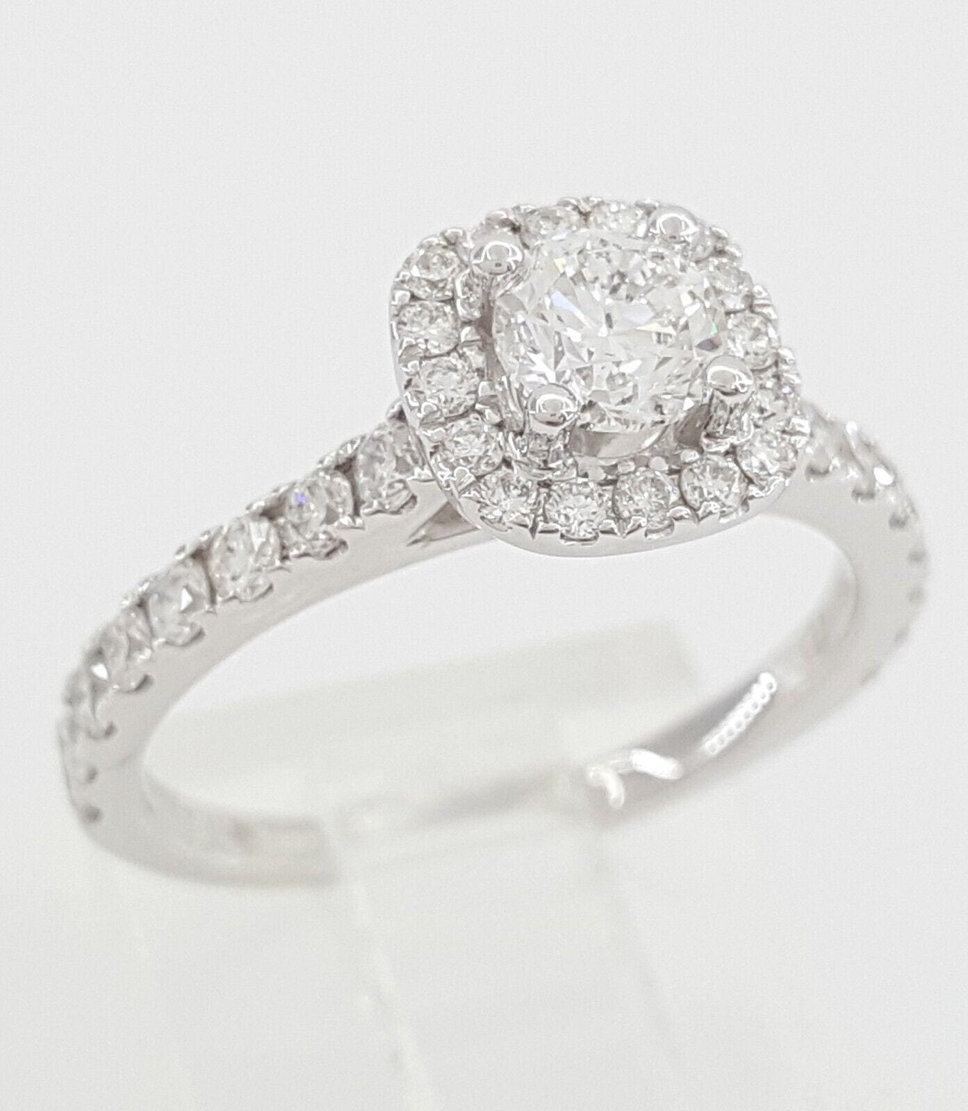 You are purchasing a 1.08 ct total weight Round Brilliant Cut Diamond Halo 14k White Gold Engagement Ring GIA.