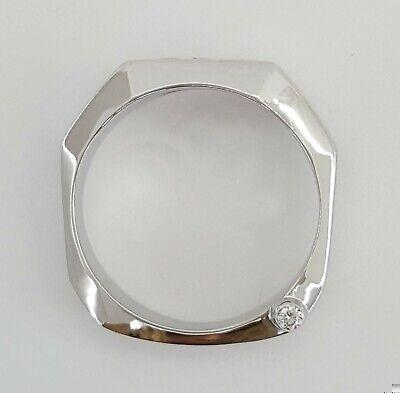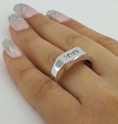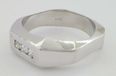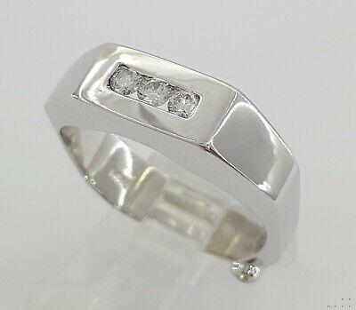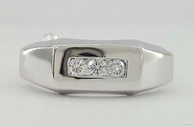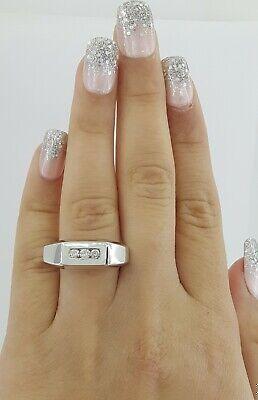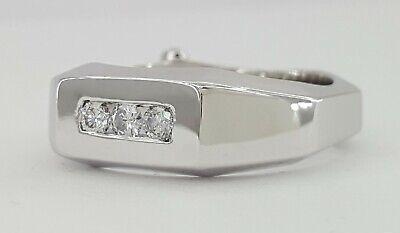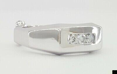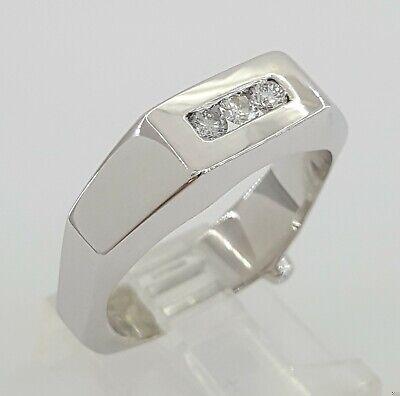 The ring weighs 10.5 Grams and is size 9.5. The ring contains 3 Round Brilliant Cut diamonds weighing approximately 0.24 ct total weight, F-G in color, VS1-SI1 in clarity. The Stones measuring 2.7.-2.8mm and set in a channel setting.