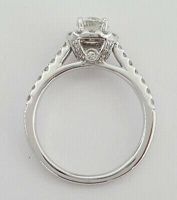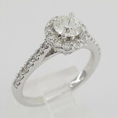 You are purchasing a 1.07 ct total weight 14K White Gold Round Brilliant Cut Diamond Halo Engagement Ring.