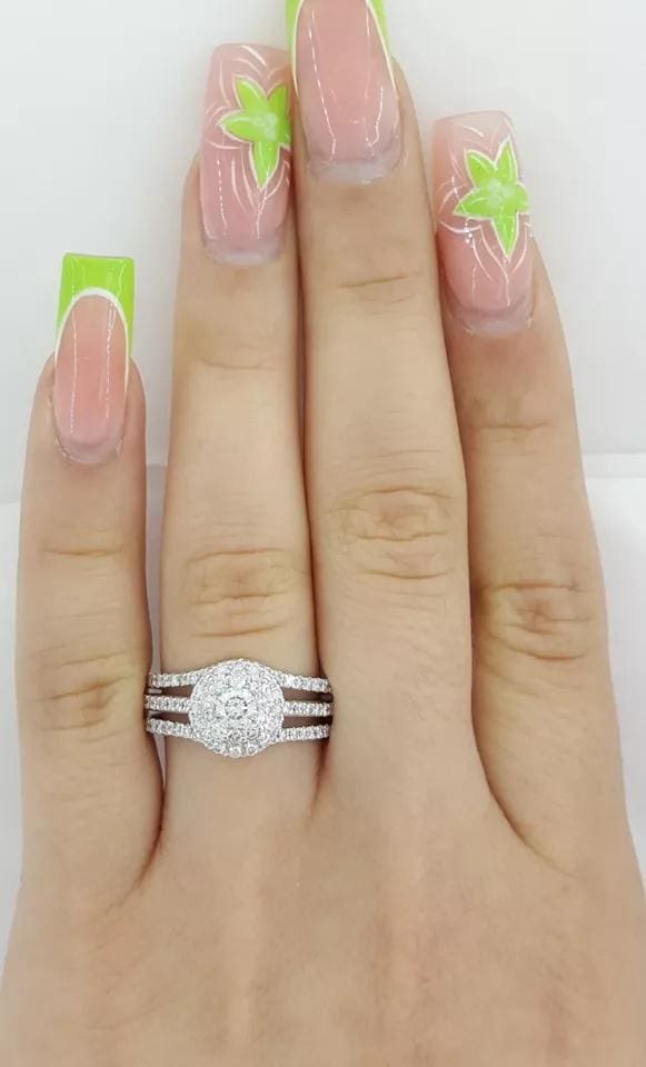 You are purchasing a 1 ct total weight 14K White Gold Round Brilliant Cut Diamond Double Halo Engagement Ring Wedding Band Set.