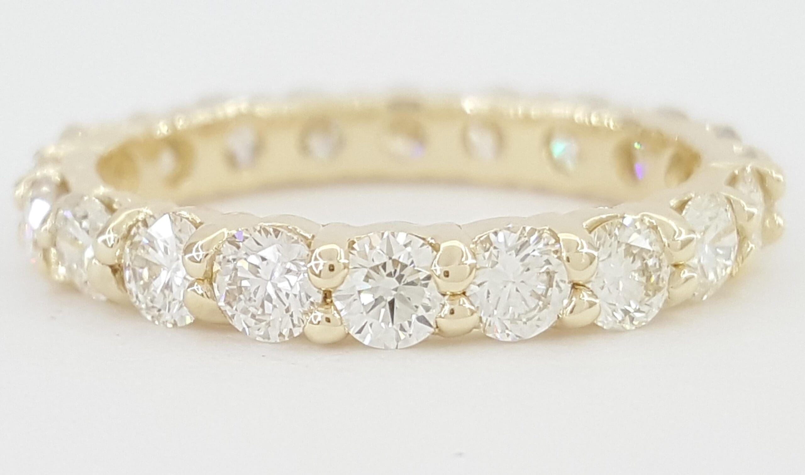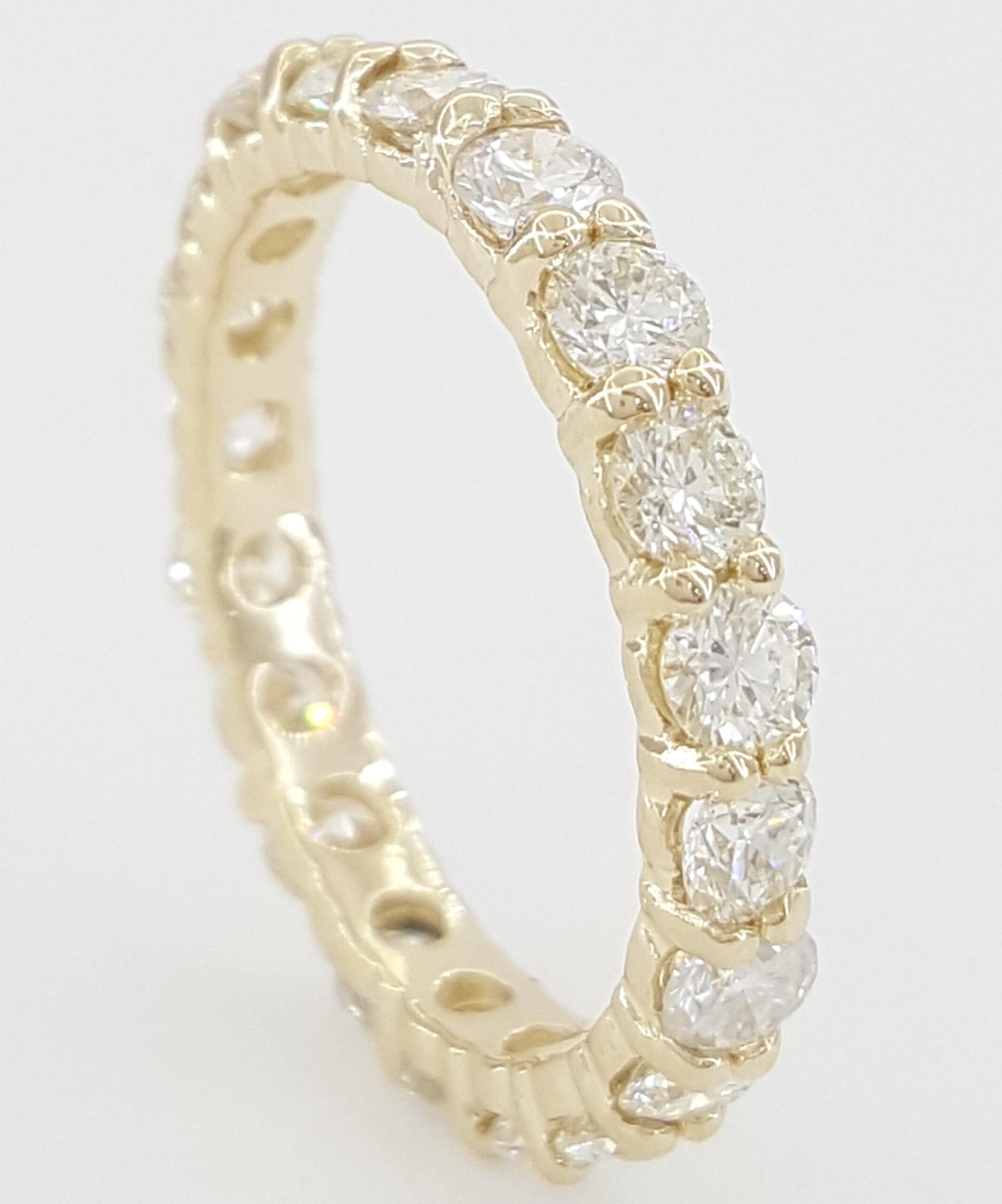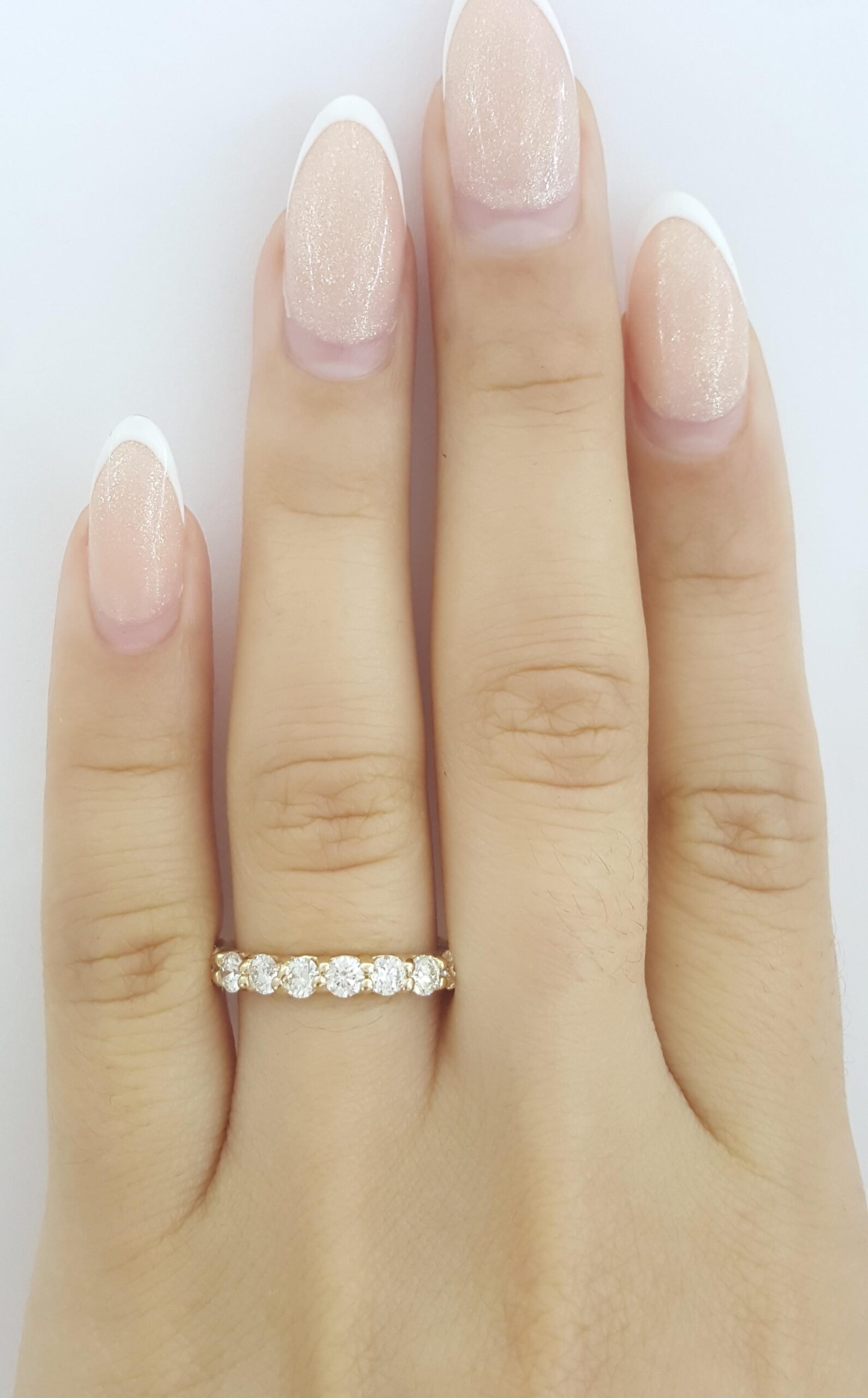 The ring weighs 2.6 grams, size 6.5, 3 mm wide, 2.5 mm thick, there are 20 Natural Round Brilliant Cut diamonds weighing approximately 2 ct total weight, G-I in color, VS-SI in clarity.