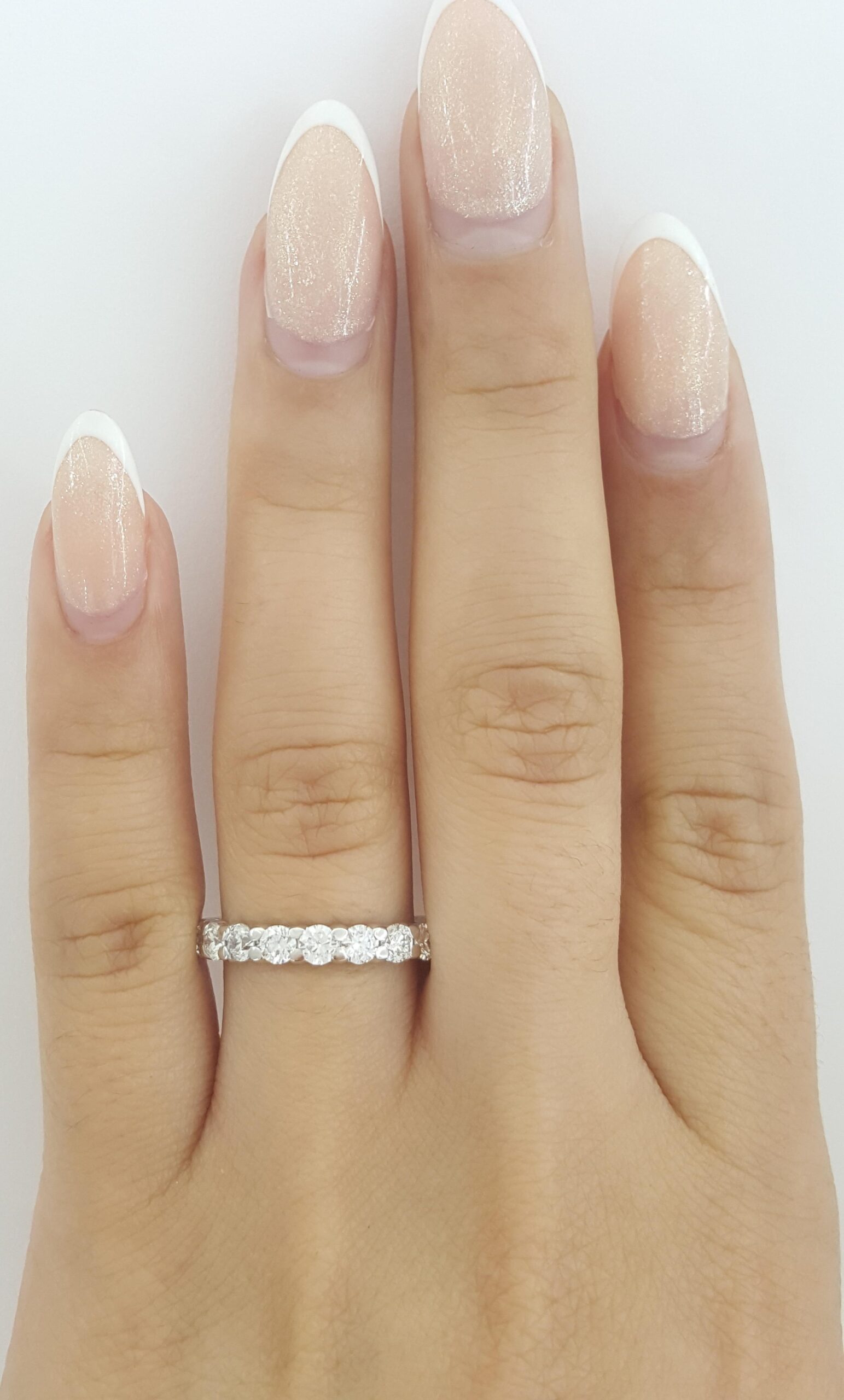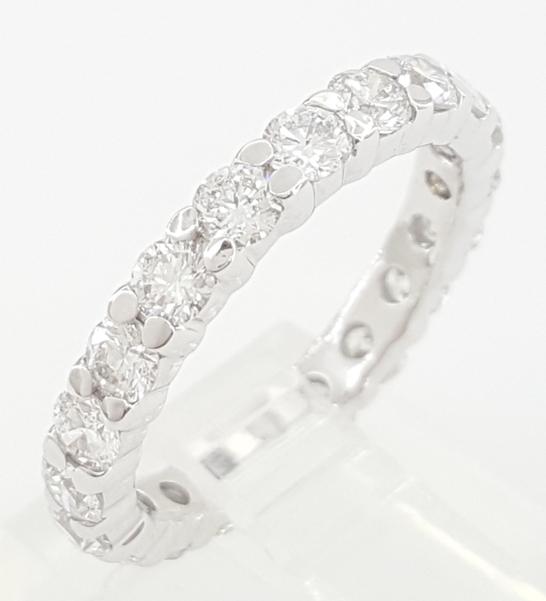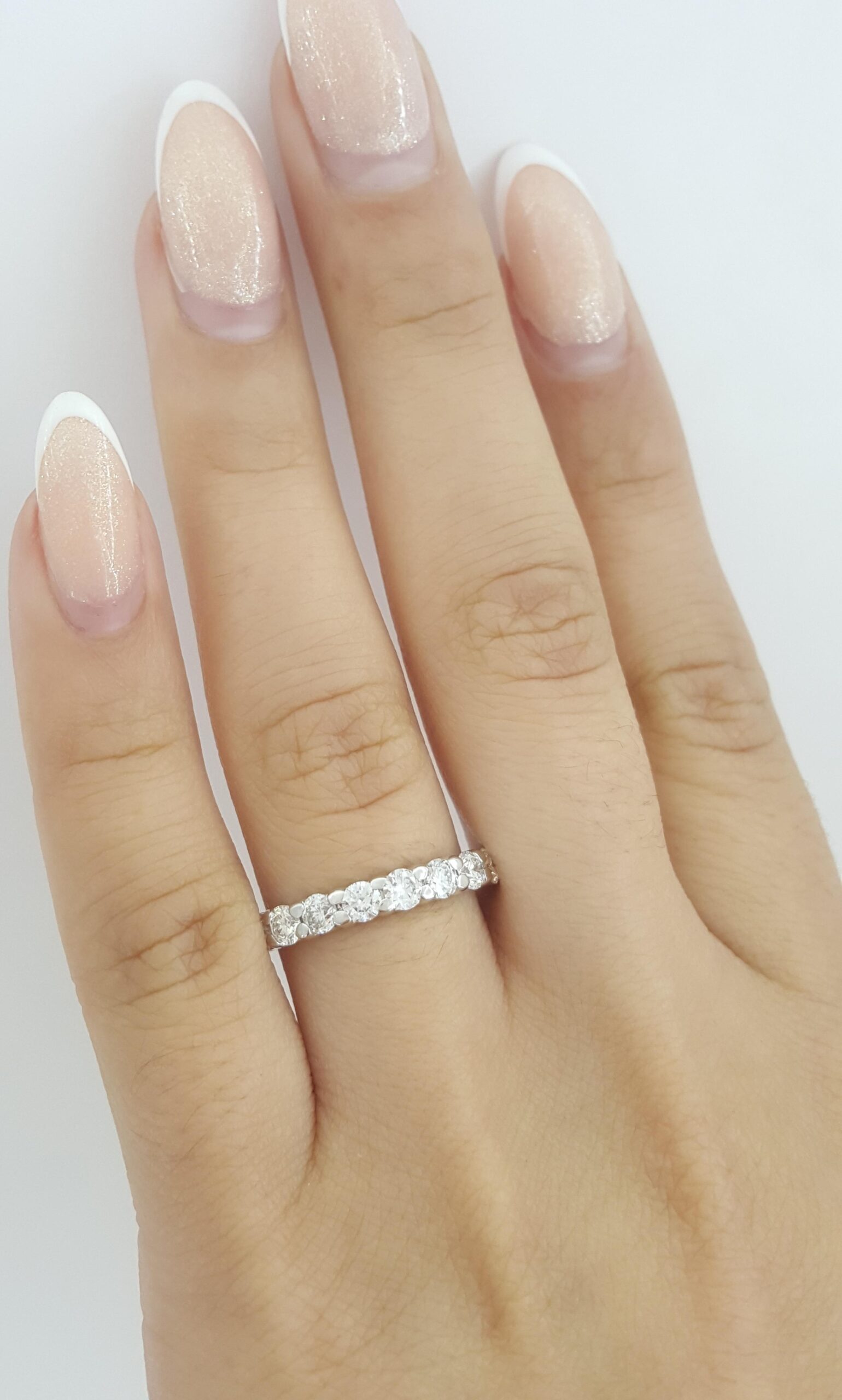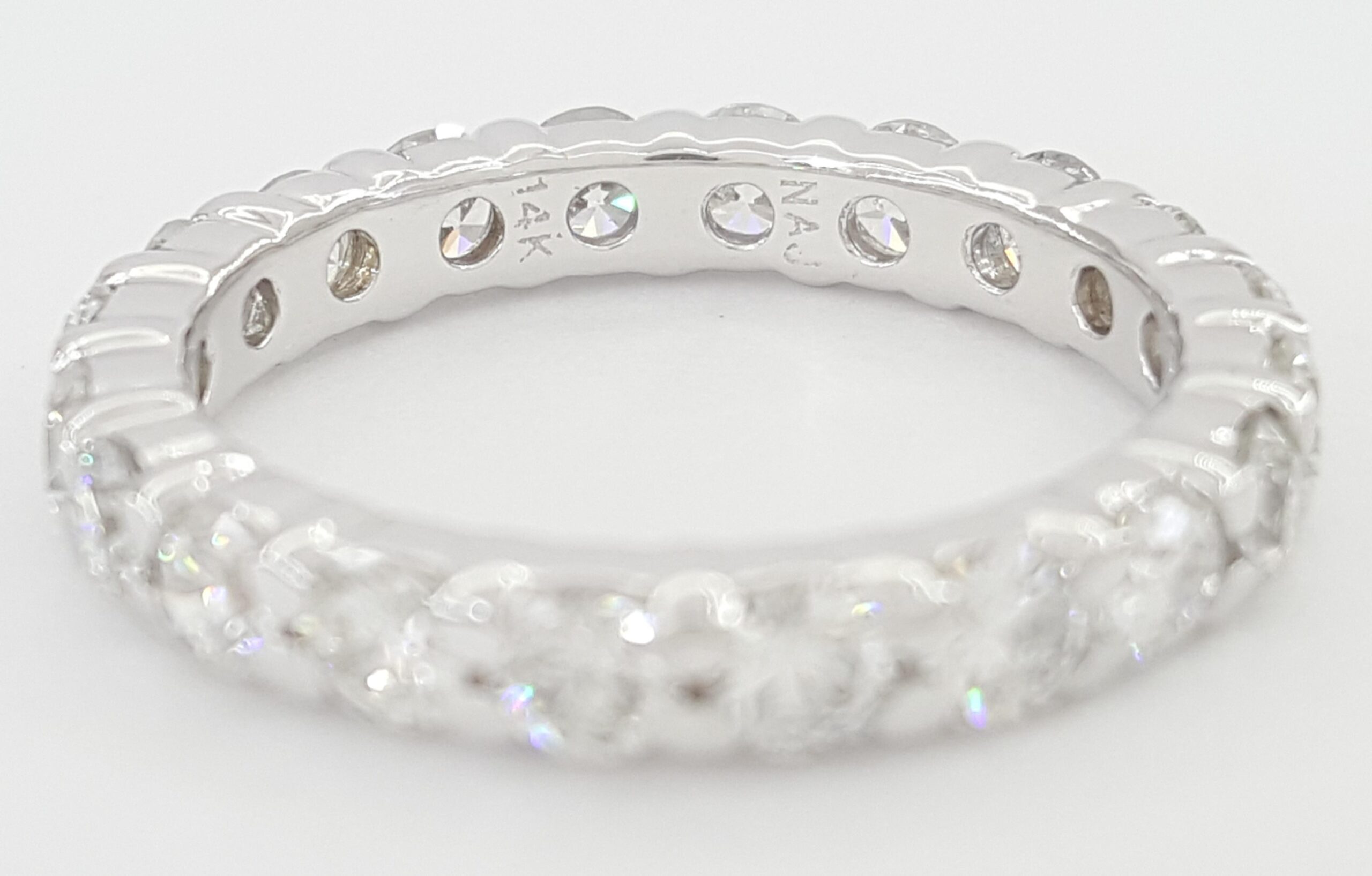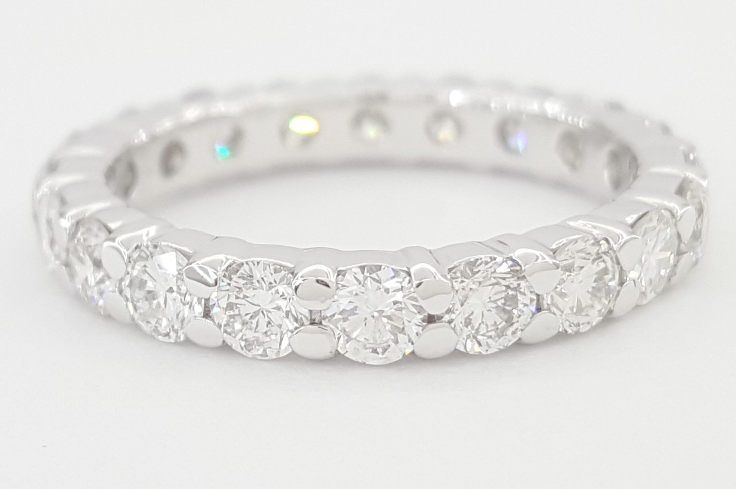 The ring weighs 3 grams, size 6, 3 mm wide, 2.5 mm thick, there are 20 Natural Round Brilliant Cut diamonds weighing approximately 2 ct total weight, G-I in color, SI1-SI2 in clarity.