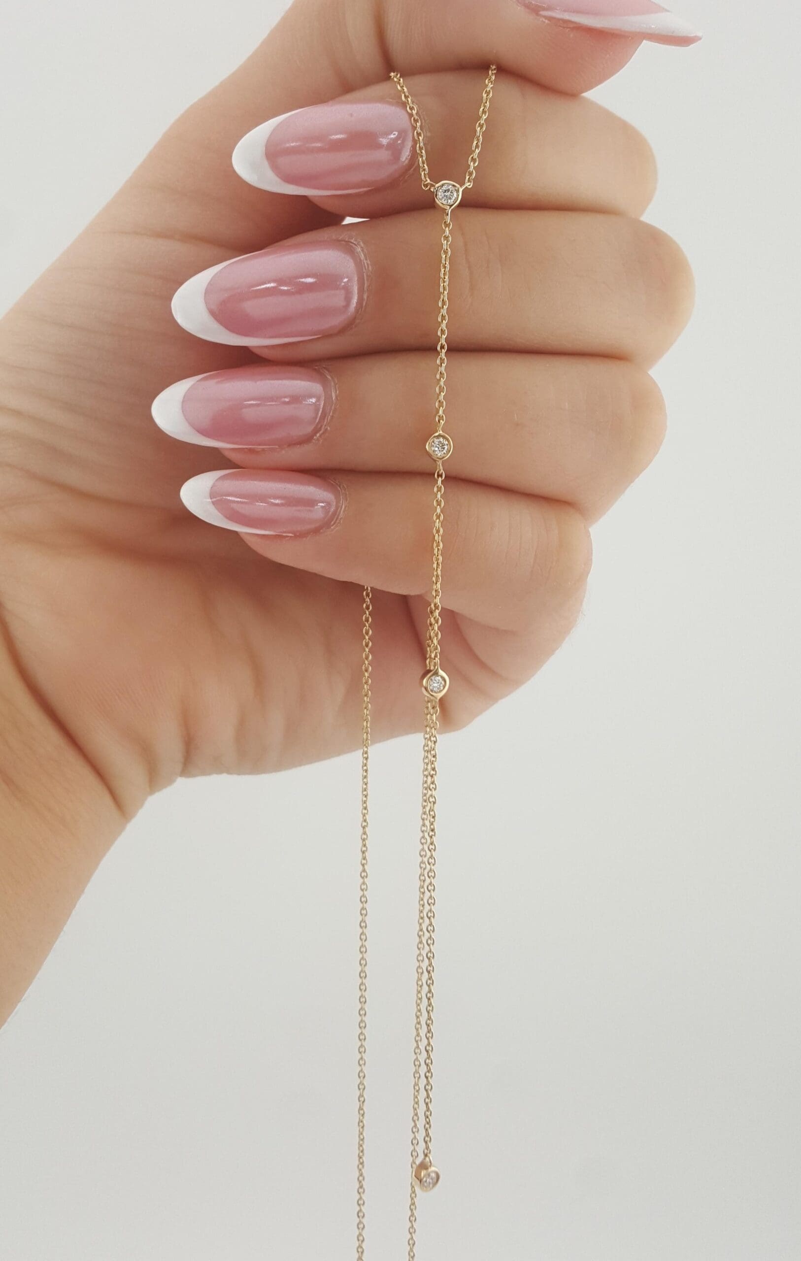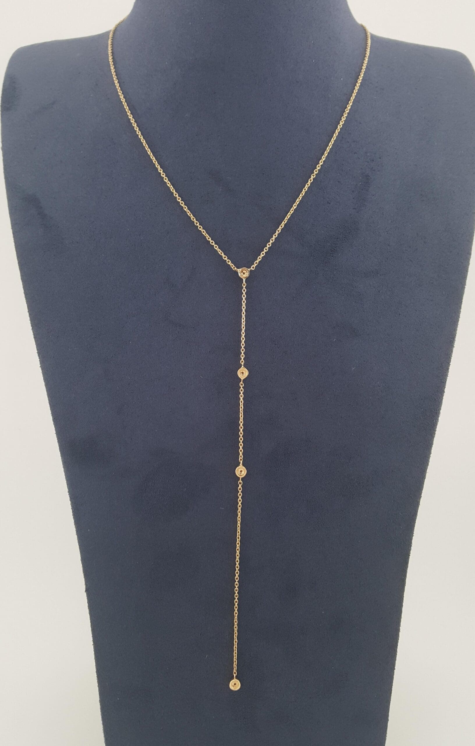 The necklace weighs 2 grams, 16" long, 4" drop, there are 4 Natural Round Brilliant Cut diamonds weighing approximately 0.12 ct total weight, G-I in color, VS-SI. The diamonds are white & eye-clean.
