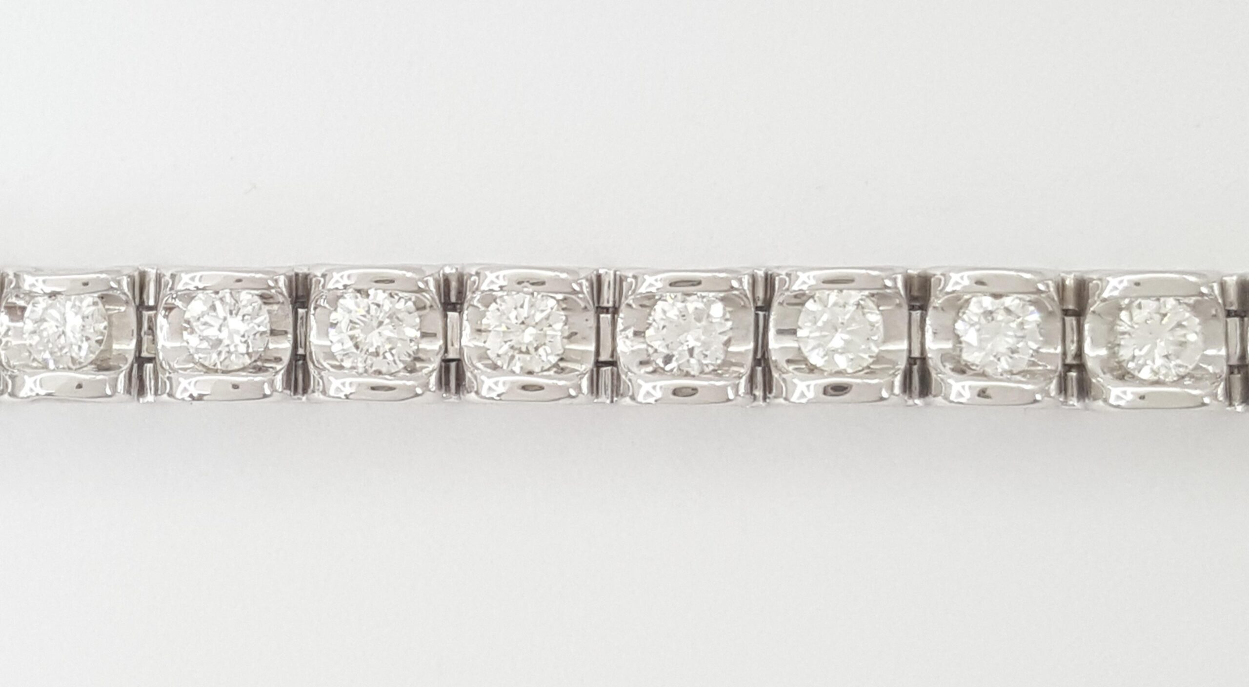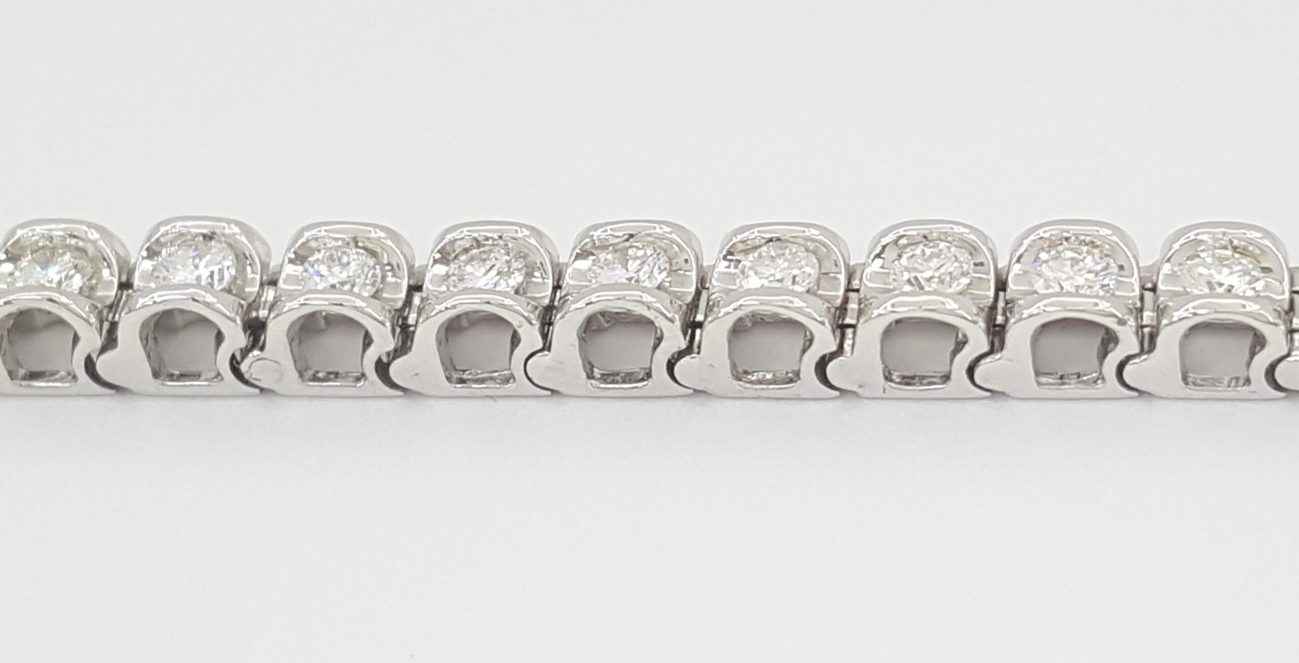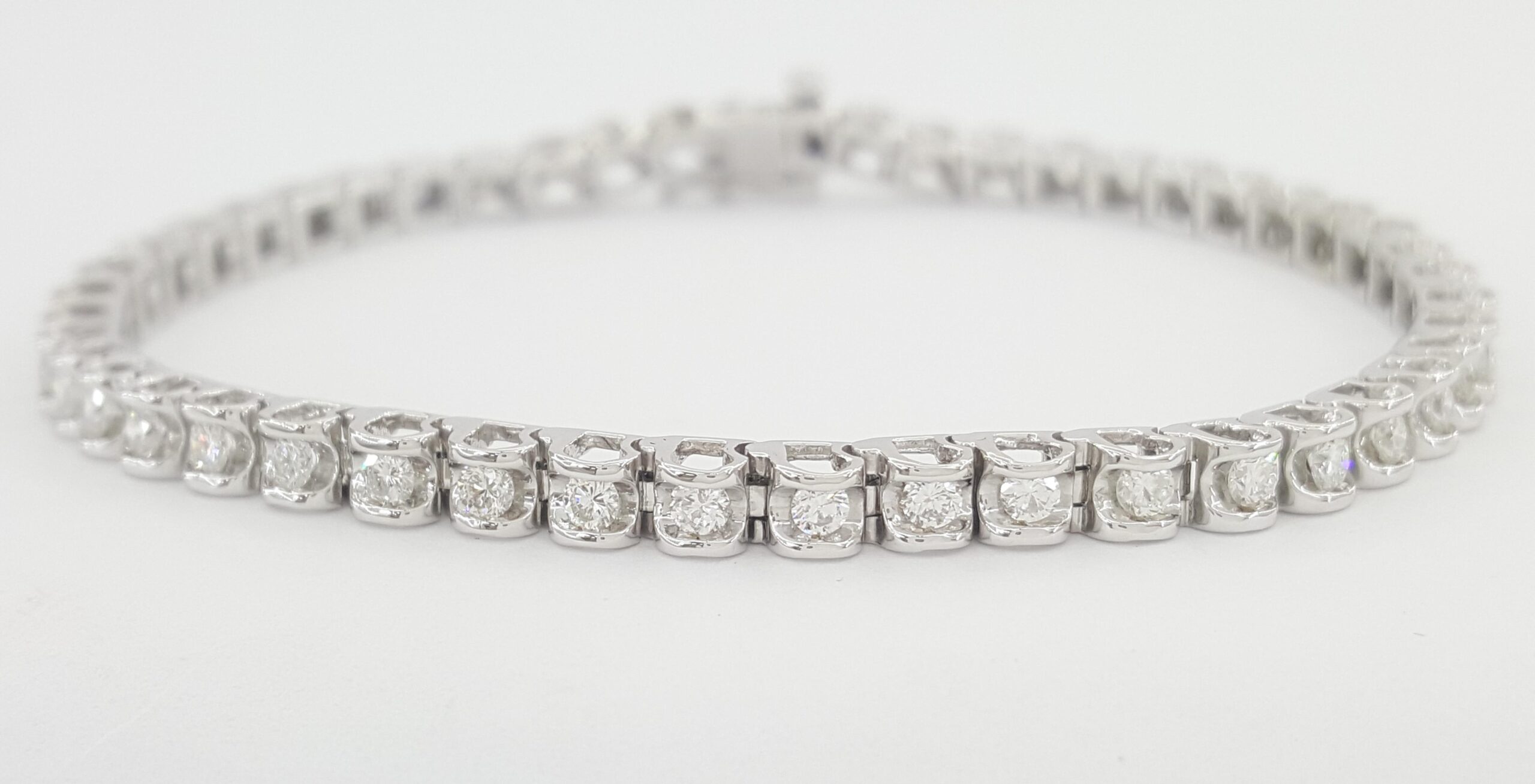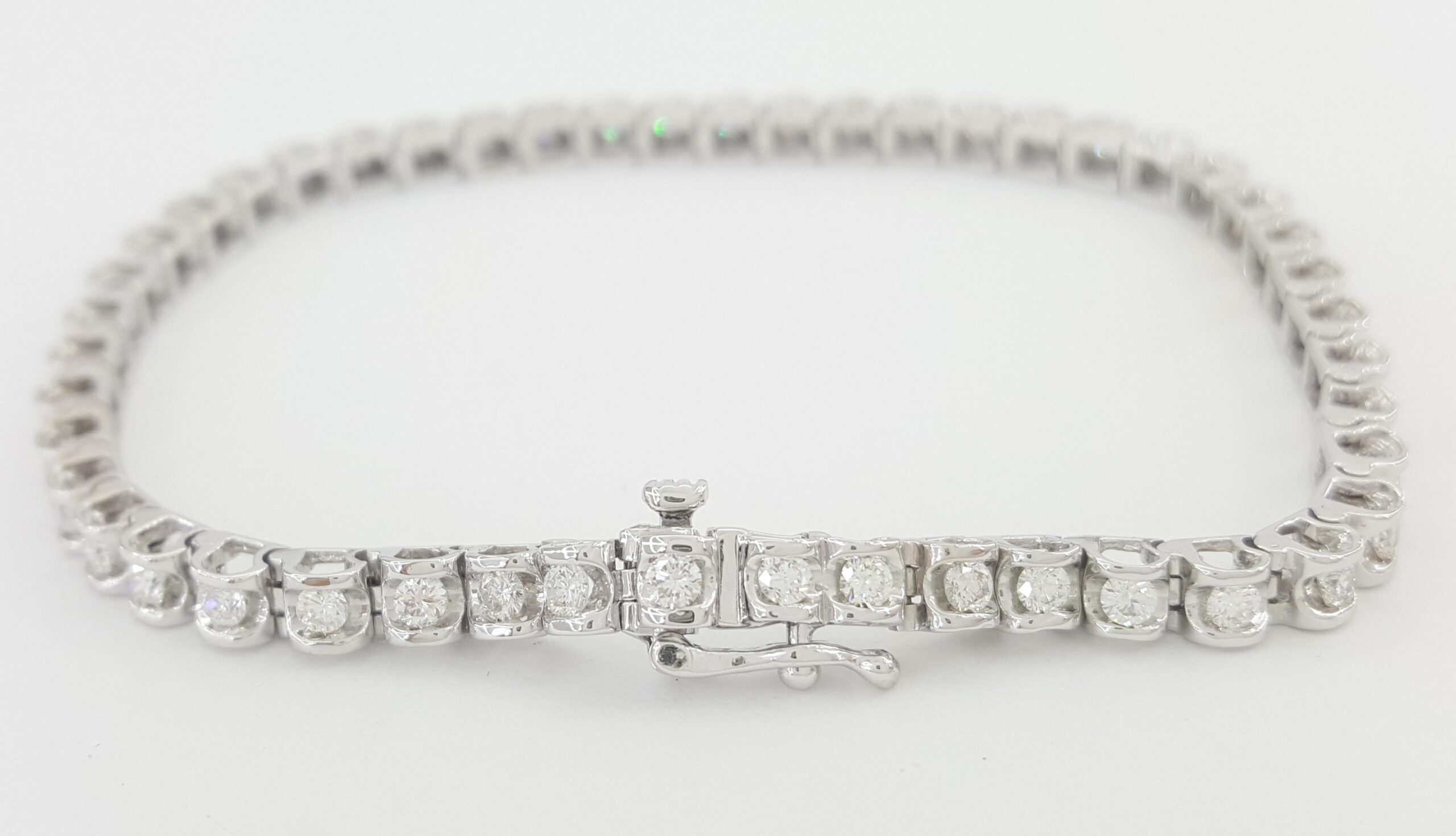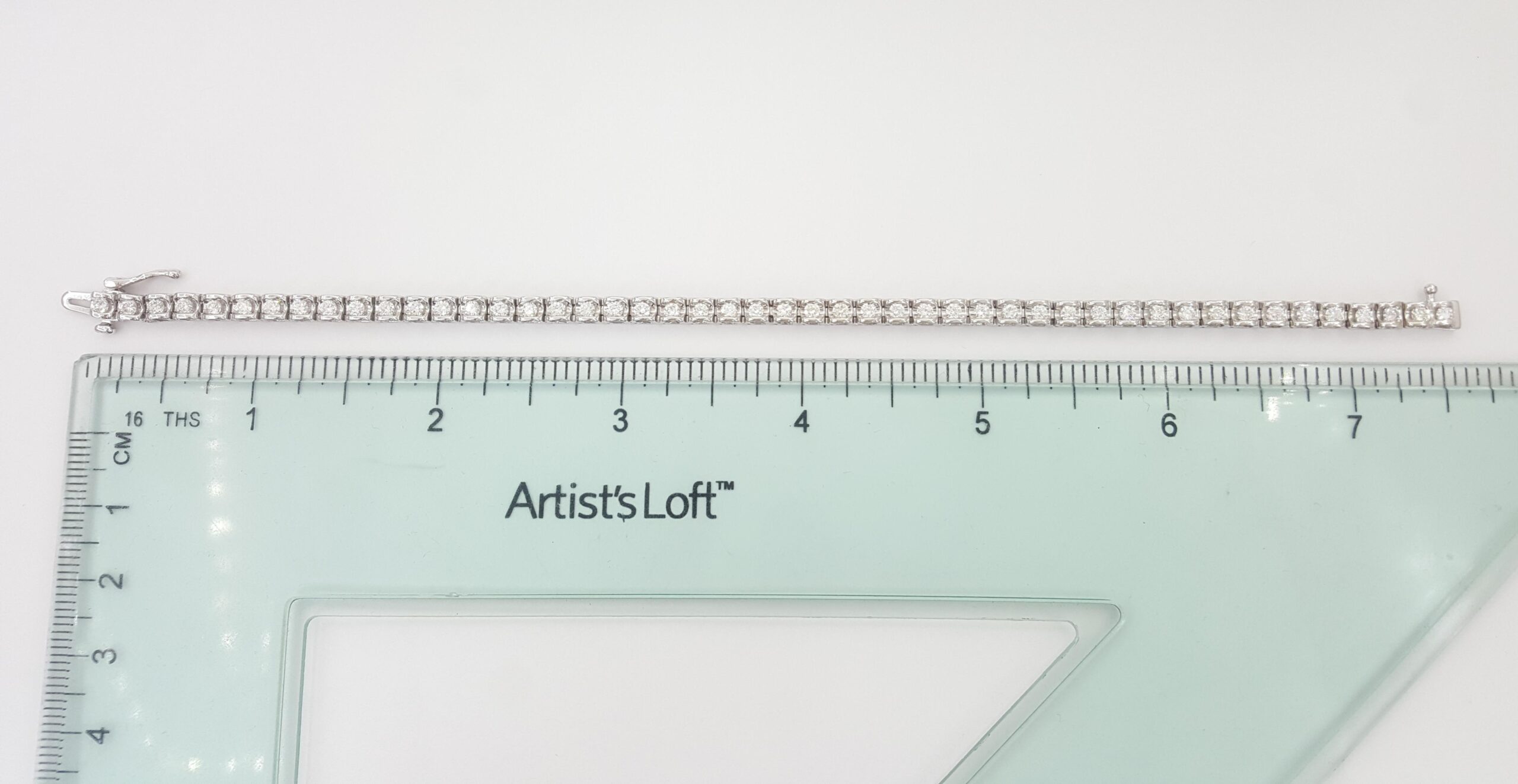 The bracelet weighs 12 grams, 7.5 inches long, 3.8 mm wide, there are 48 Natural Round Brilliant Cut diamonds weighing approximately 2.05 ct total weight, F-H in color, VS-SI in clarity. The clasp is stamped "14k".
