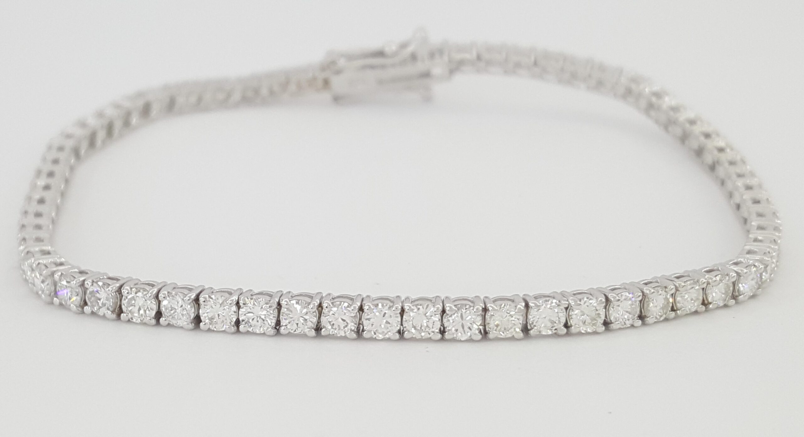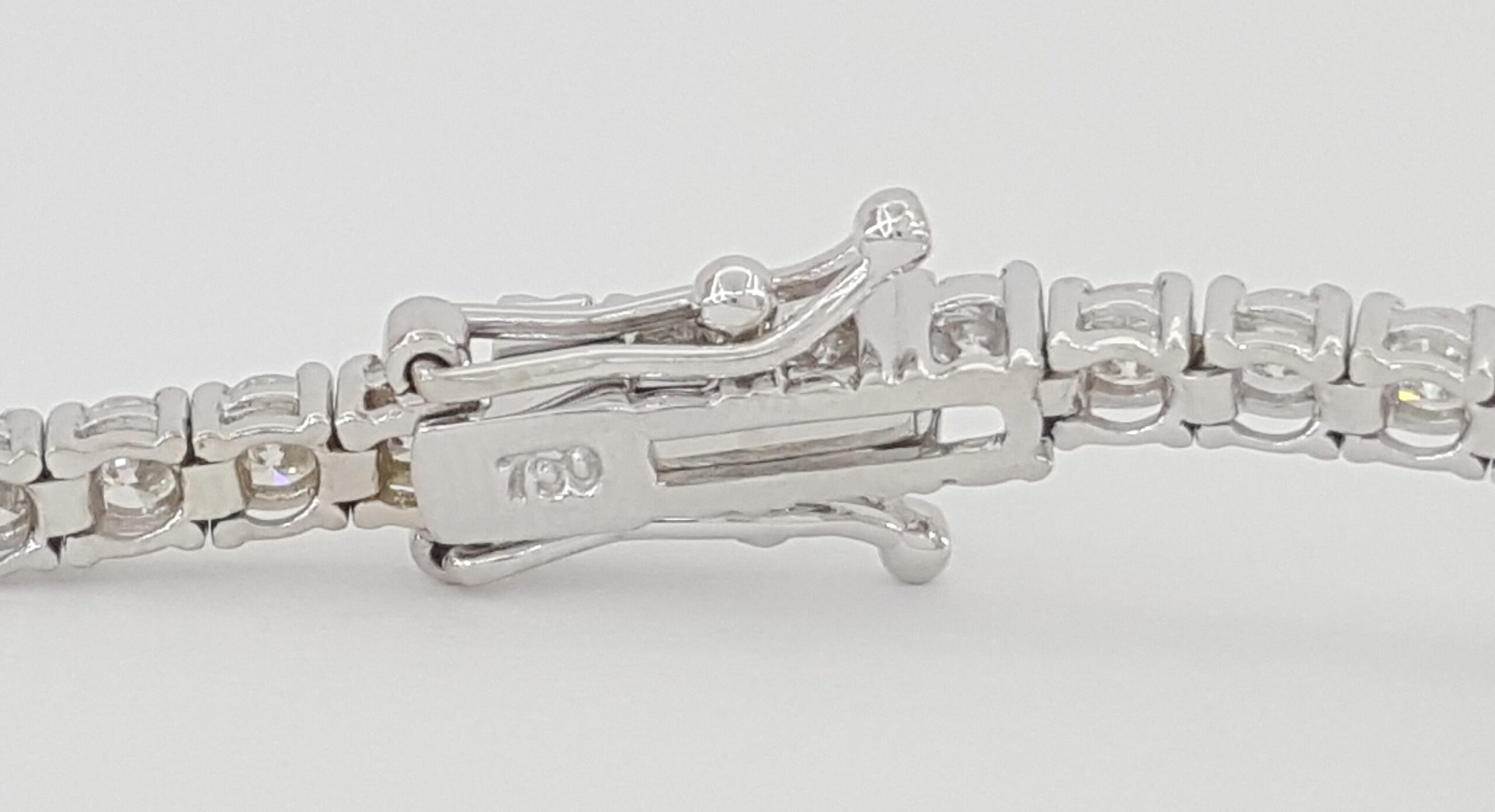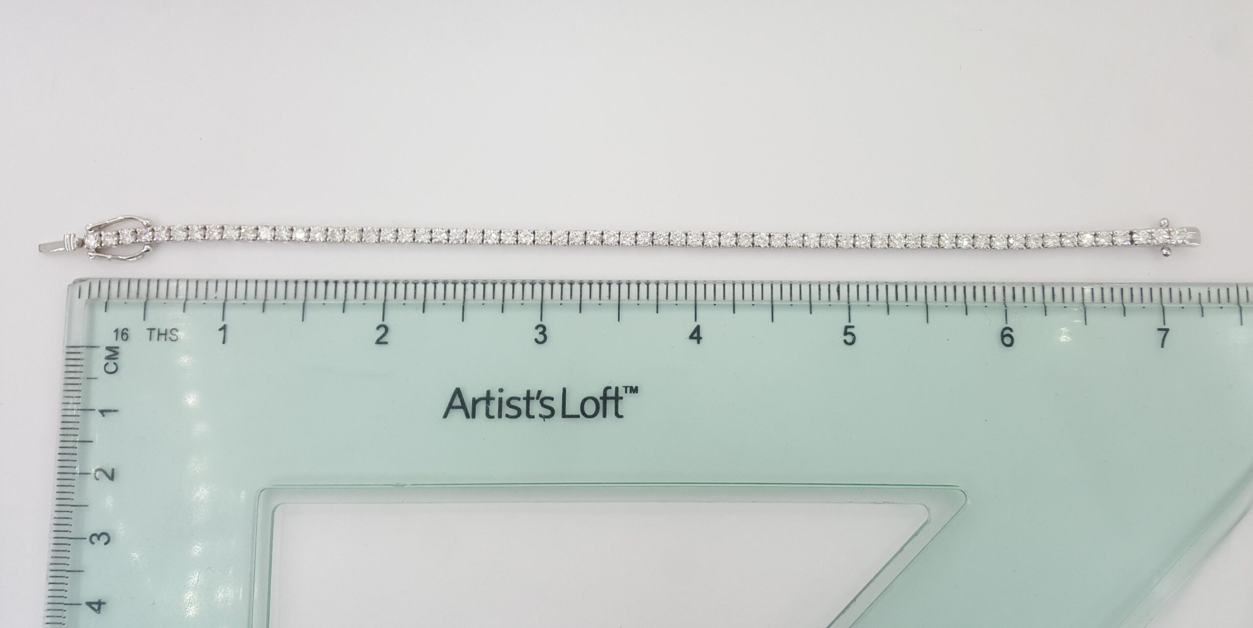 The bracelet weighs 8.5 grams, 7.25 inches long, 2.8 mm wide, there are 64 Natural Round Brilliant Cut diamonds weighing approximately 4 ct total weight, F-H in color, VS-SI in clarity. The clasp is stamped "750".