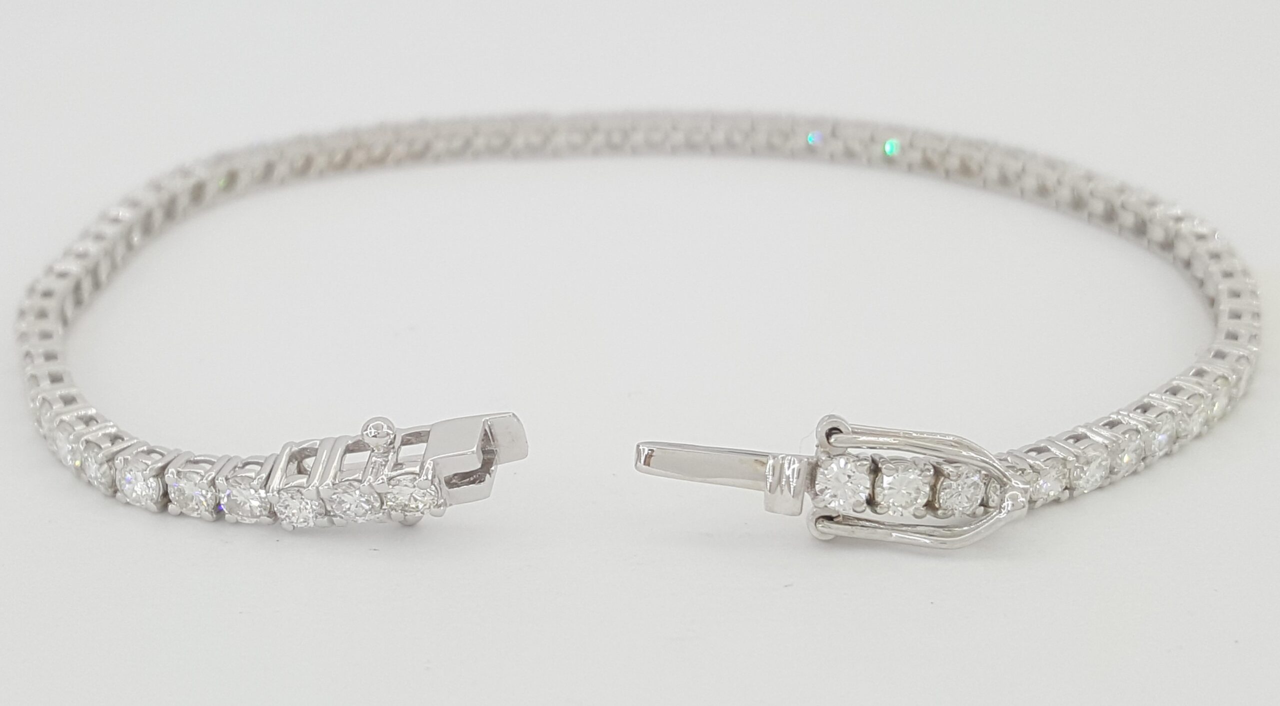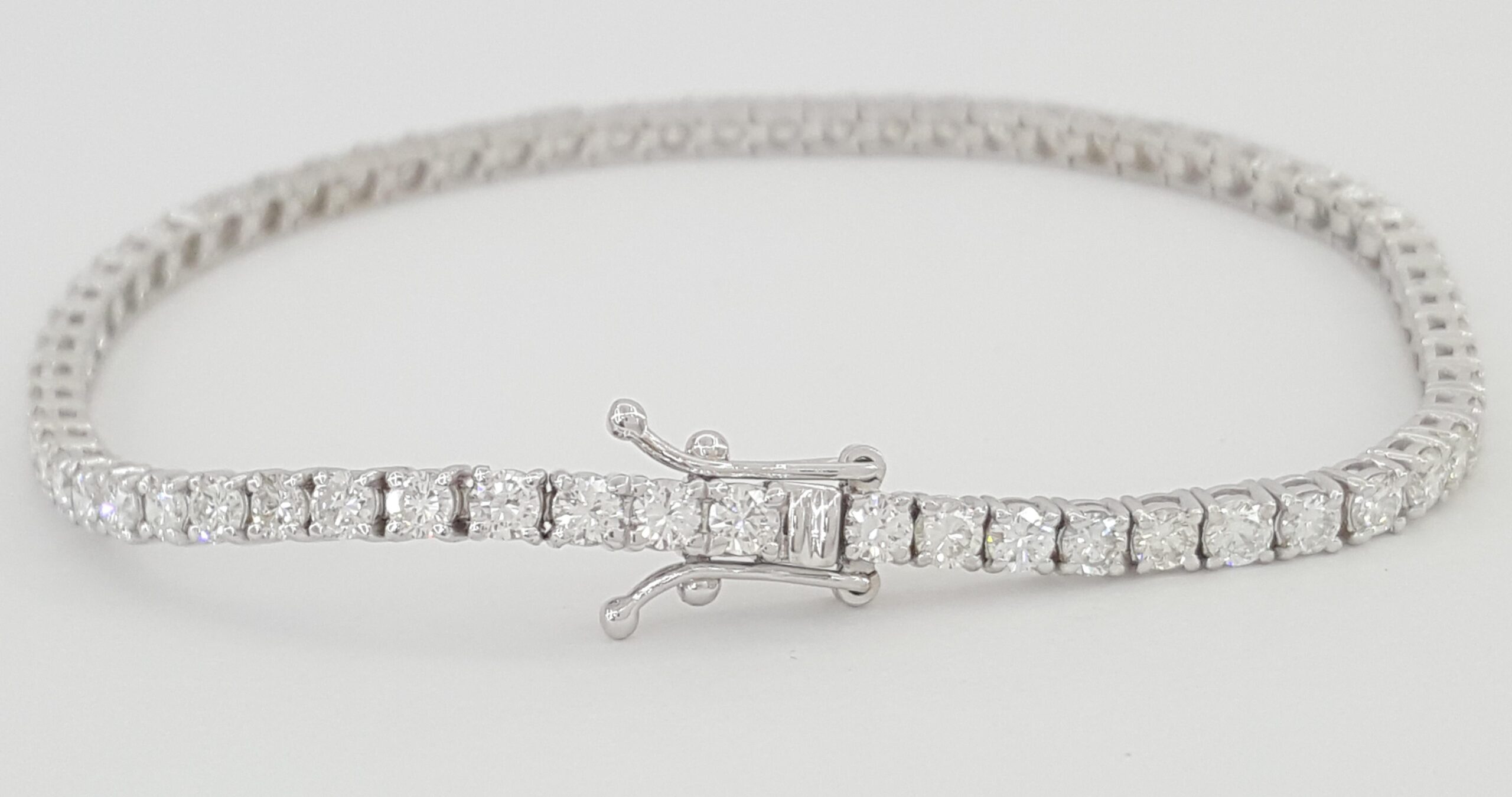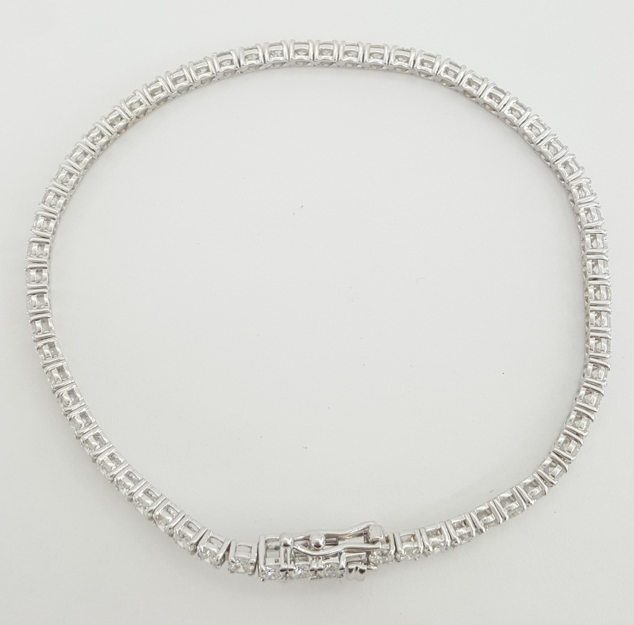 The bracelet weighs 8.5 grams, 7.25 inches long, 2.8 mm wide, there are 64 Natural Round Brilliant Cut diamonds weighing approximately 4 ct total weight, F-H in color, VS-SI in clarity. The clasp is stamped "750".