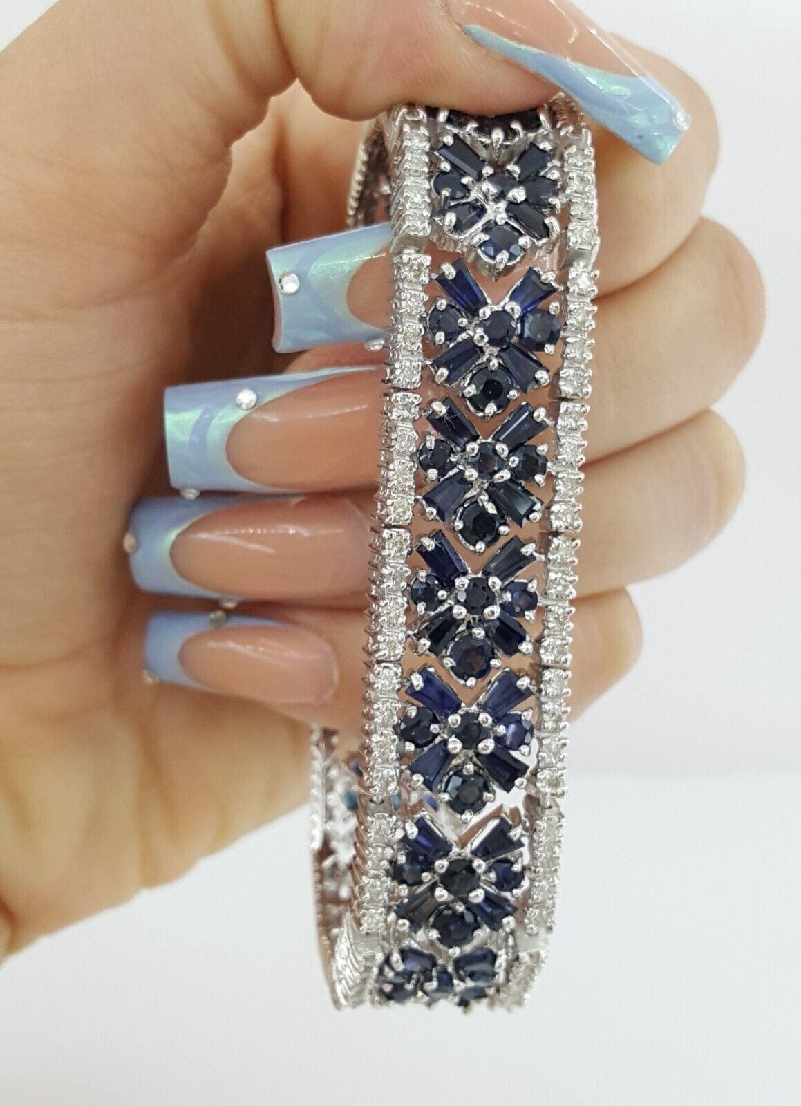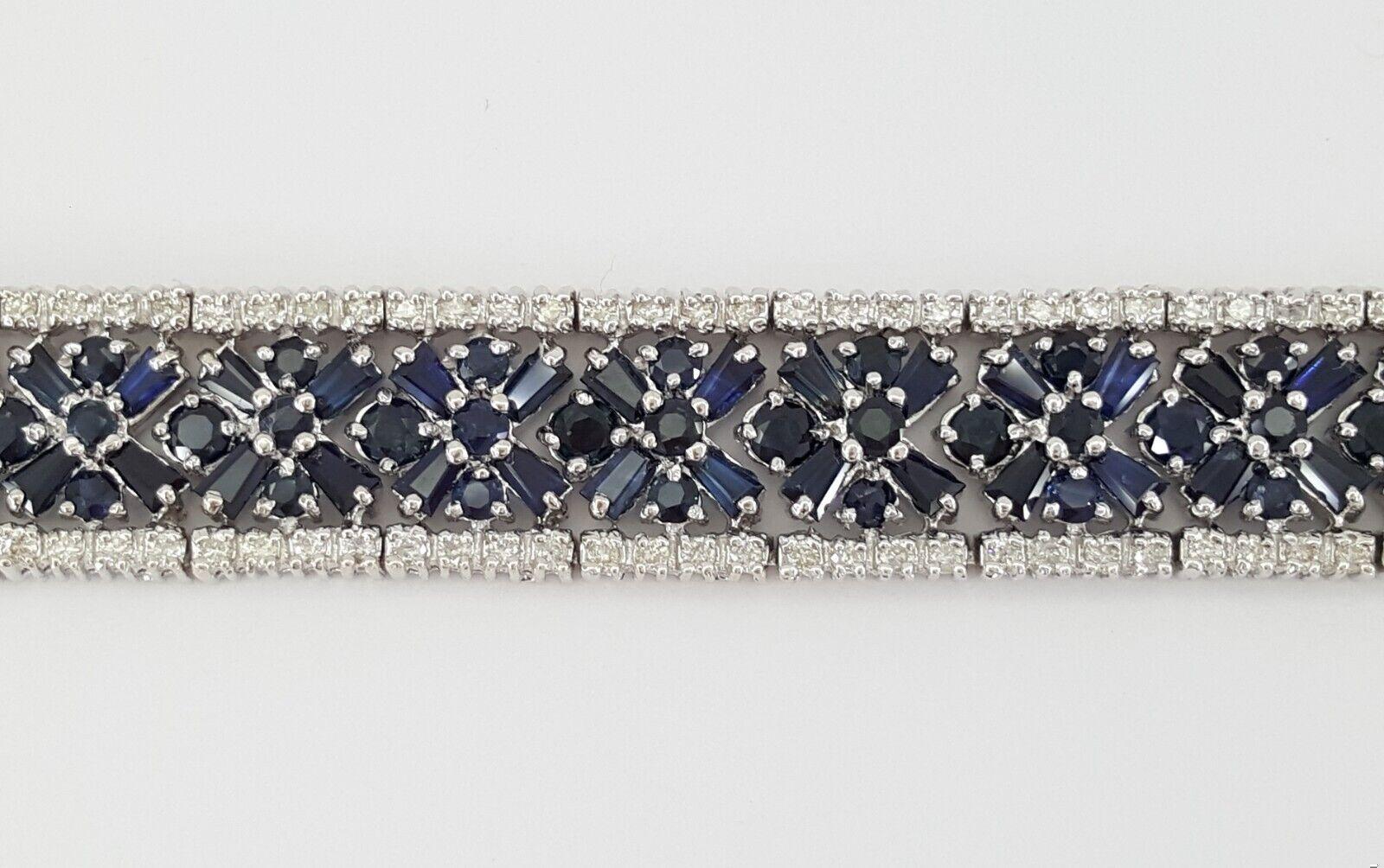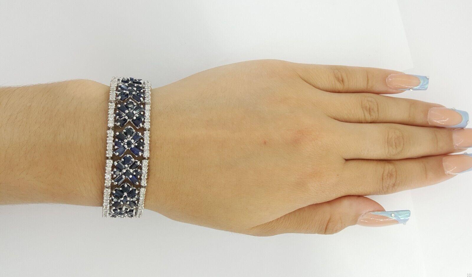 You are purchasing a 24.6 ct total weight Round Brilliant Cut Diamond & Tapered Baguette & Round Cut Blue Sapphire Flower Wide Tennis Bracelet.