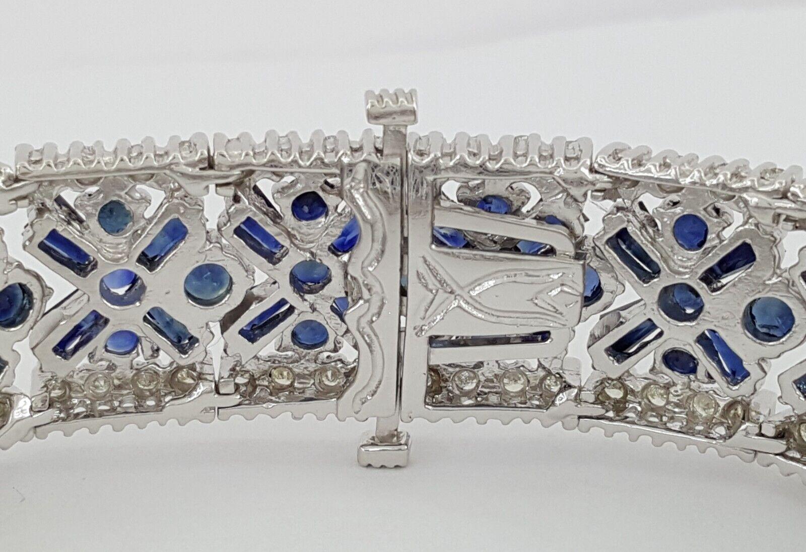 The bracelet weighs 49.2 grams, 7.125" inches long, there are 72 Natural Round & 72 Natural Baguette Cut Blue Sapphires weighing approximately 21 ct total weight, Deep Blue in color, the sapphires are not tested for heat treatments.