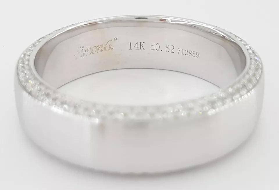 The ring is stamped "Simon G. 14K d0.52 712***". In like-new condition. Comes with a ring box.