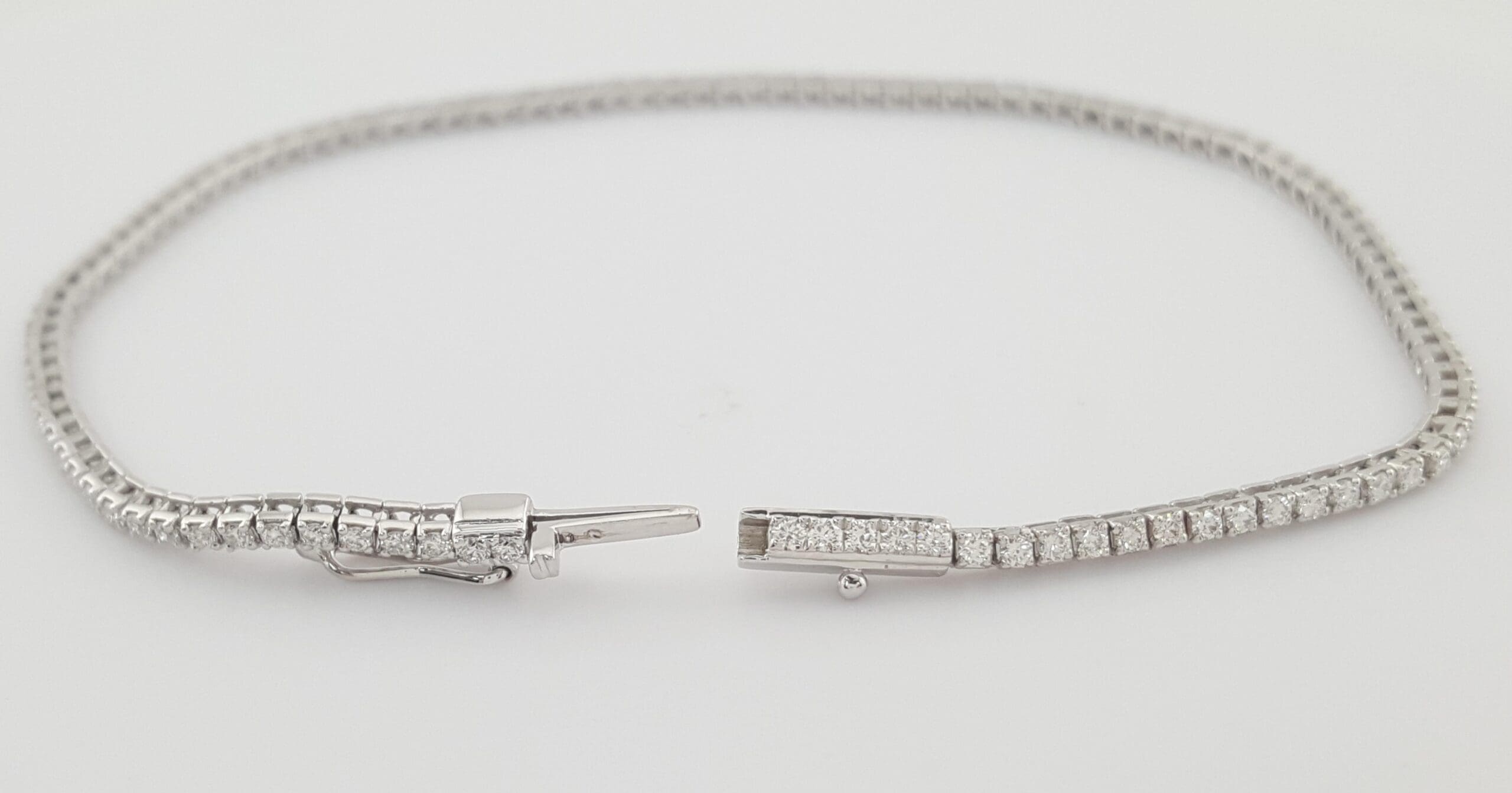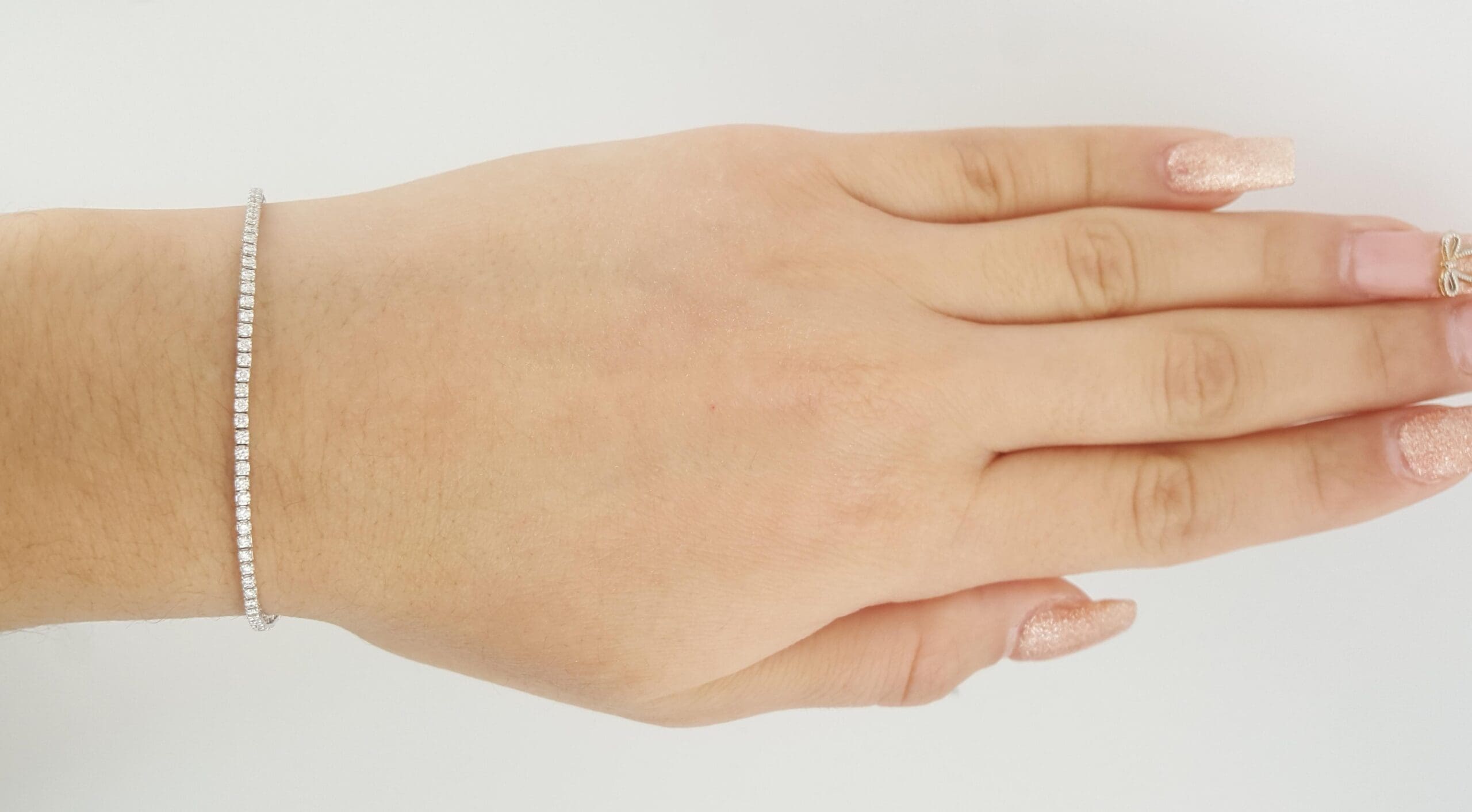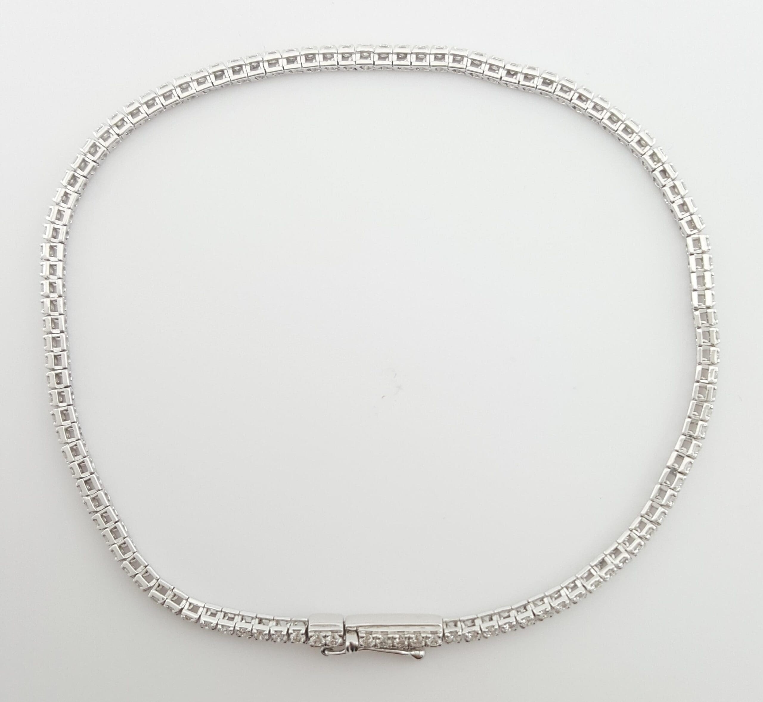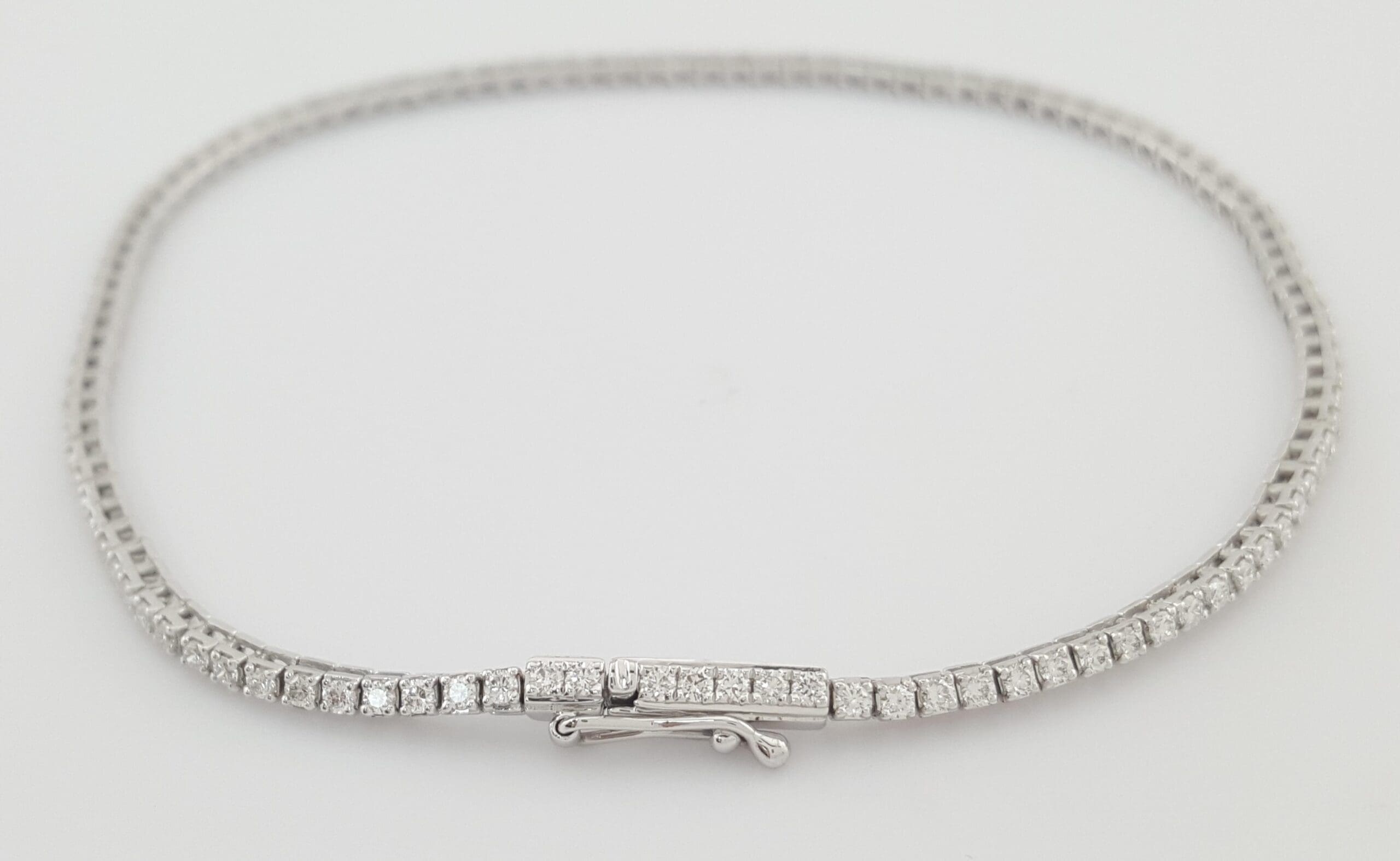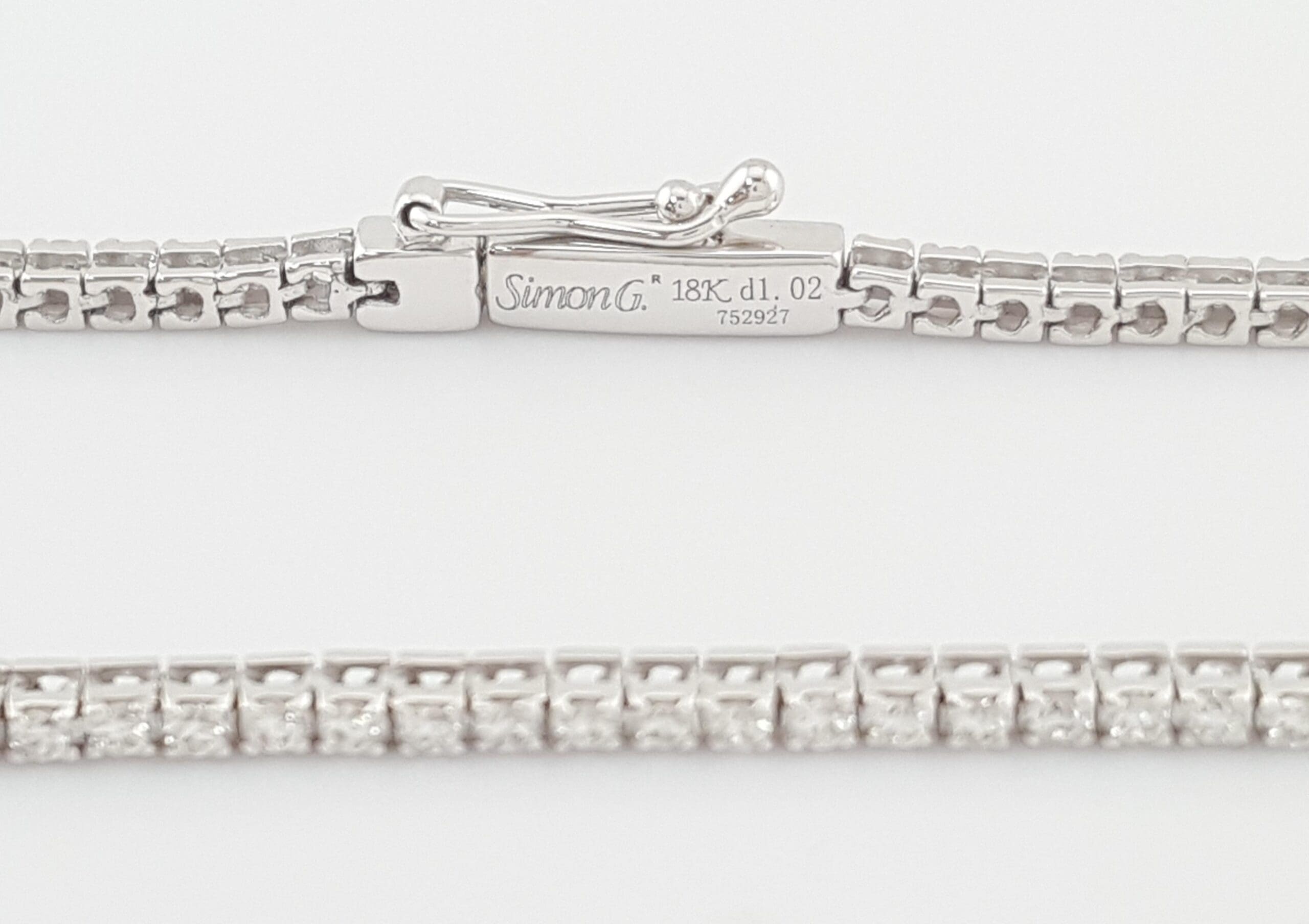 The bracelet weighs 4.2 grams, 7 inches long, 1.5 mm wide, there are 108 Natural Round Brilliant Cut diamonds weighing approximately 1.02 ct total weight, F-H in color, VS-SI in clarity. The clasp is stamped "Simon G 18k d1.02 752***".
