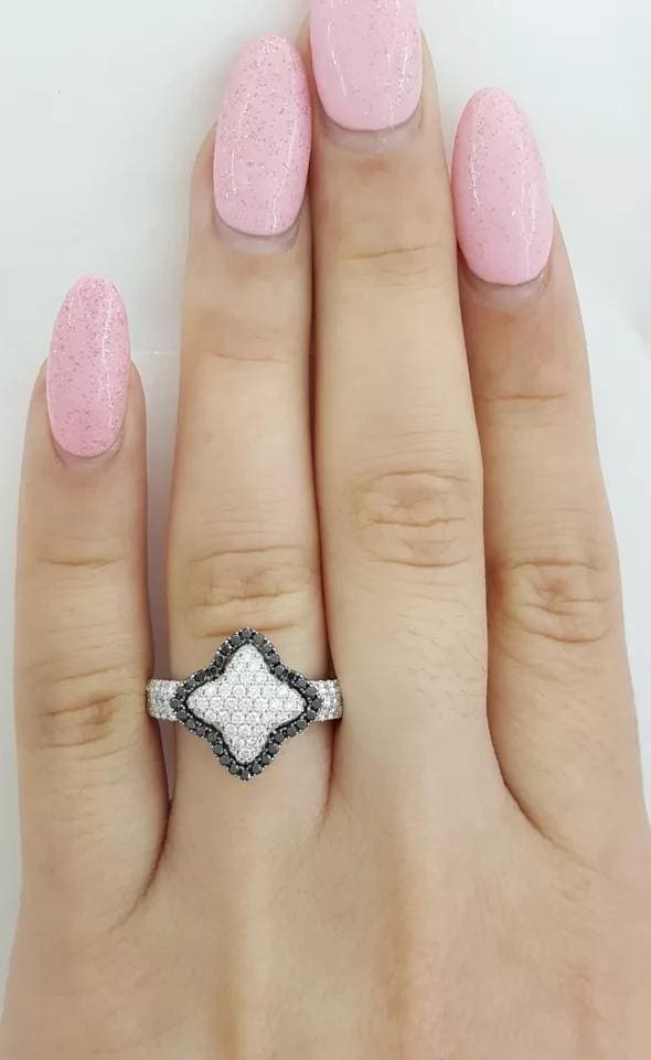 You are purchasing a Spark Creations Quatrefoil Clover White & Black Diamond Pave Ring 1 ct 18K White Gold