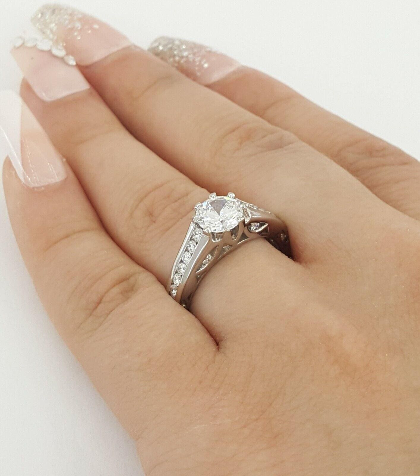 The ring weighs 6.9 grams, size 6.5, the center stone a cubic zirconia display stone, and the mounting will fit a Round diamond between 0.91-1.37 ct or a stone measuring around 6.3-6.7 mm. This is a new old-stock handmade Tacori design that has been discontinued.