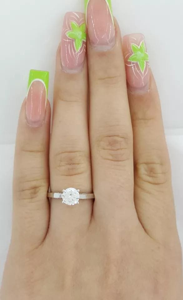 The ring weighs 3.8 grams, size 6.25, the center stone a cubic zirconia display stone, the mounting will fit a diamond between 0.65-0.85 ct or a stone that's 5.5-6.5 mm in diameter.
