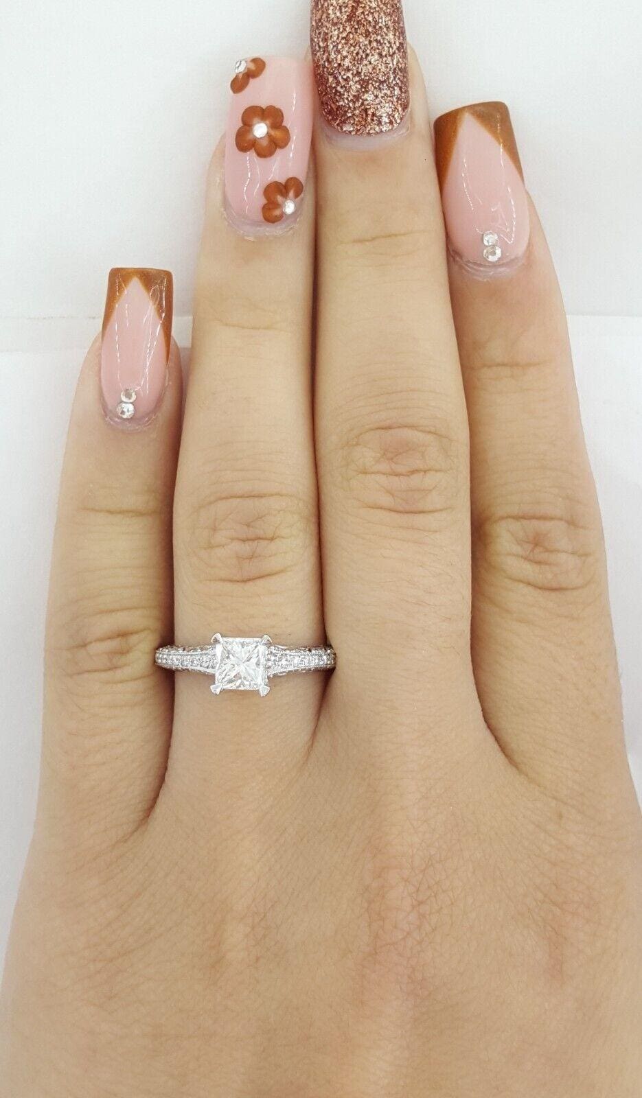 The ring weighs 3.4 grams, size 6.5, the center stone is a Natural Princess Cut diamond weighing 0.78 ct, F in color, VS1 in clarity. The center diamond has Good polish, Good symmetry, None fluorescent, measuring 4.99 x 4.86 x 3.81 mm.