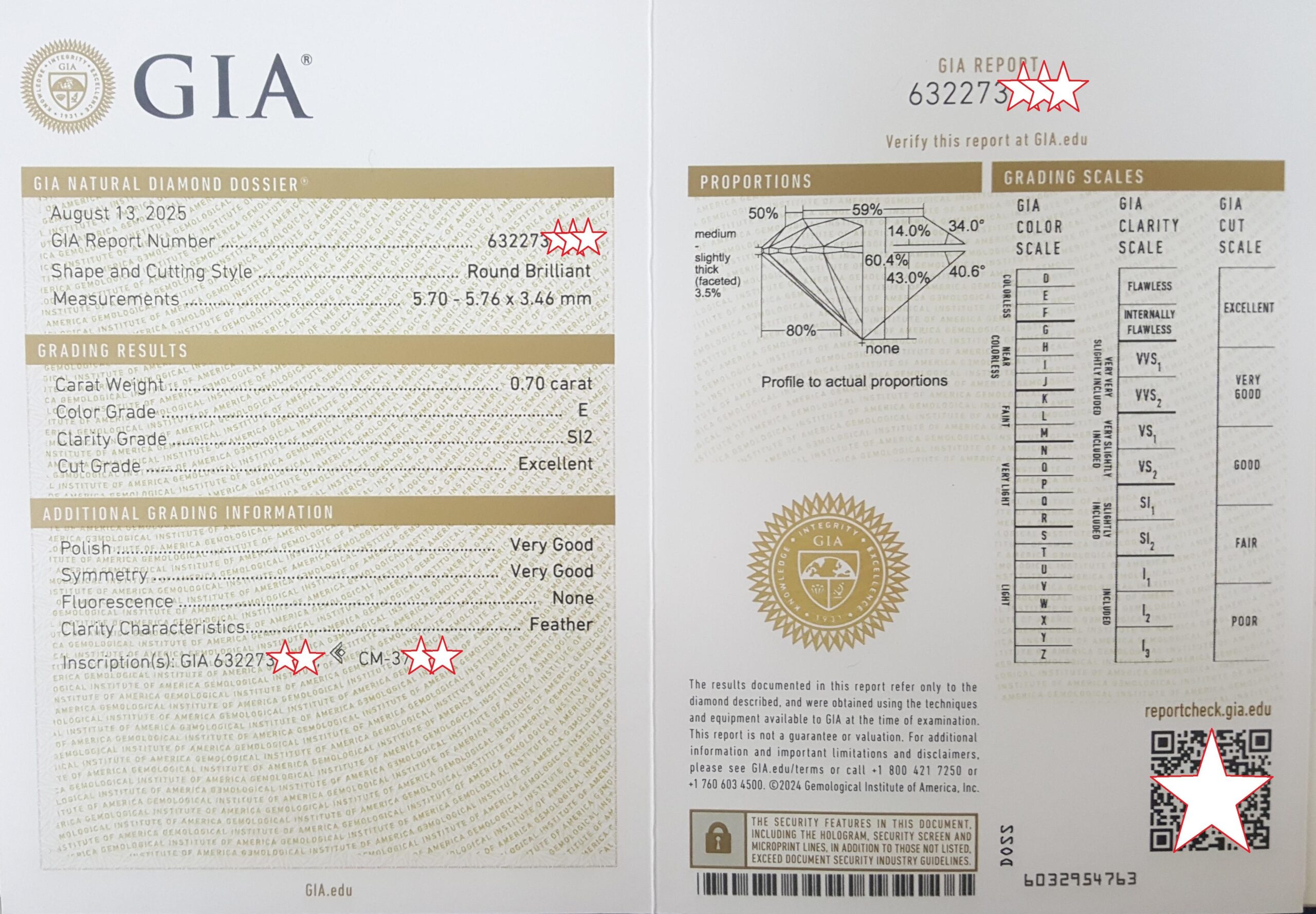 The ring weighs 4 grams, size 6.25, the center stone is a 0.7 ct Natural Round Brilliant Cut diamond, E Color, SI2 Clarity, Excellent Cut, Very Good Polish, Very Good Symmetry, None fluorescent, measuring 5.7 x 5.76 x 3.46 mm.